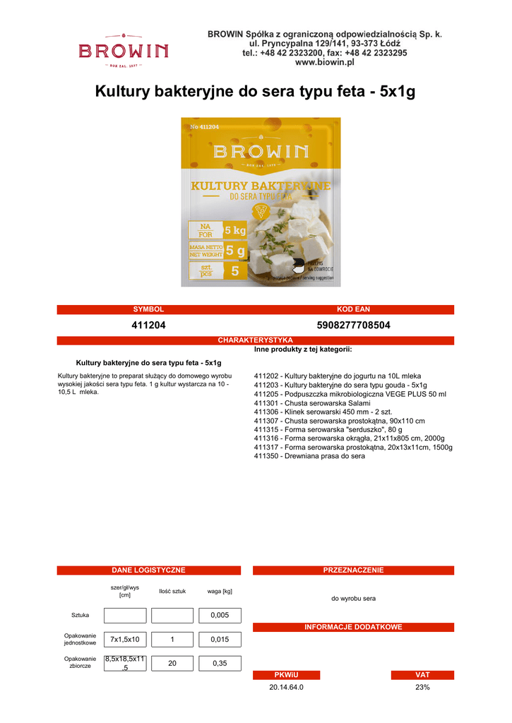 Kultury bakteryjne do sera typu feta - 5x1g SYMBOL KOD EAN 411204 5908277708504 CHARAKTERYSTYKA Inne produkty z tej kategorii: Kultury bakteryjne do sera typu feta - 5x1g Kultury bakteryjne to preparat służący do domowego wyrobu wysokiej jakości sera typu feta. 1 g kultur wystarcza na 10 10,5 L mleka. 411202 - Kultury bakteryjne do jogurtu na 10L mleka 411203 - Kultury bakteryjne do sera typu gouda - 5x1g 411205 - Podpuszczka mikrobiologiczna VEGE PLUS 50 ml 411301 - Chusta serowarska Salami 411306 - Klinek serowarski 450 mm - 2 szt. 411307 - Chusta serowarska prostokątna, 90x110 cm 411315 - Forma serowarska "serduszko", 80 g 411316 - Forma serowarska okrągła, 21x11x805 cm, 2000g 411317 - Forma serowarska prostokątna, 20x13x11cm, 1500g 411350 - Drewniana prasa do sera DANE LOGISTYCZNE szer/gł/wys [cm] Ilość sztuk PRZEZNACZENIE waga [kg] do wyrobu sera 0,005 Sztuka INFORMACJE DODATKOWE Opakowanie jednostkowe 7x1,5x10 1 0,015 Opakowanie zbiorcze 8,5x18,5x11 ,5 20 0,35 PKWiU VAT 20.14.64.0 23%