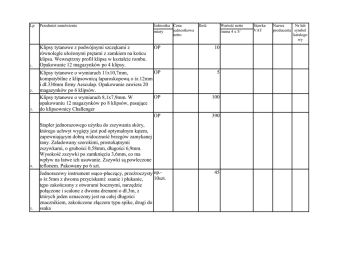 Lp Przedmiot zamówienia Jednostka Cena jednostkowa miary netto OP 10 1. Klipsy tytanowe z podwójnymi szczękami z równolegle ułożonymi prętami z zamkiem na końcu klipsa. Wewnętrzny profil klipsa w kształcie rombu. Opakowanie 12 magazynków po 4 klipsy. OP Klipsy tytanowe o wymiarach 11x10,7mm, kompatybilne z klipsownicą laparoskopową o śr.12mm i dł.330mm firmy Aesculap. Opakowanie zawiera 20 magazynków po 6 klipsów. OP Klipsy tytanowe o wymiarach 8,1x7,9mm. W opakowaniu 12 magazynków po 8 klipsów, pasujące do klipsownicy Challenger OP 5 2. 3. 4. 5. Stapler jednorazowego użytku do zszywania skóry, którego uchwyt wygięty jest pod optymalnym kątem, zapewniającym dobrą widoczność brzegów zamykanej rany. Załadowany szerokimi, prostokątnymi zszywkami, o grubości 0,58mm, długości 6,9mm. Wysokość zszywki po zamknięciu 3,6mm, co ma wpływ na łatwe ich usuwanie. Zszywki są powleczone teflonem. Pakowany po 6 szt. Jednorazowy instrument ssąco-płuczący, przeźroczysty op.10szt. o śr.5mm z dwoma przyciskami: ssanie i płukanie, tępo zakończony z otworami bocznymi, narzędzie połączone i scalone z dwoma drenami o dł.3m, z których jeden oznaczony jest na całej długości znacznikiem, zakończone złączem typu spike, drugi do ssaka Ilość Wartość netto /suma 4 x 5/ 100 390 45 Stawka VAT Nazwa Nr lub producenta symbol katalogo wy