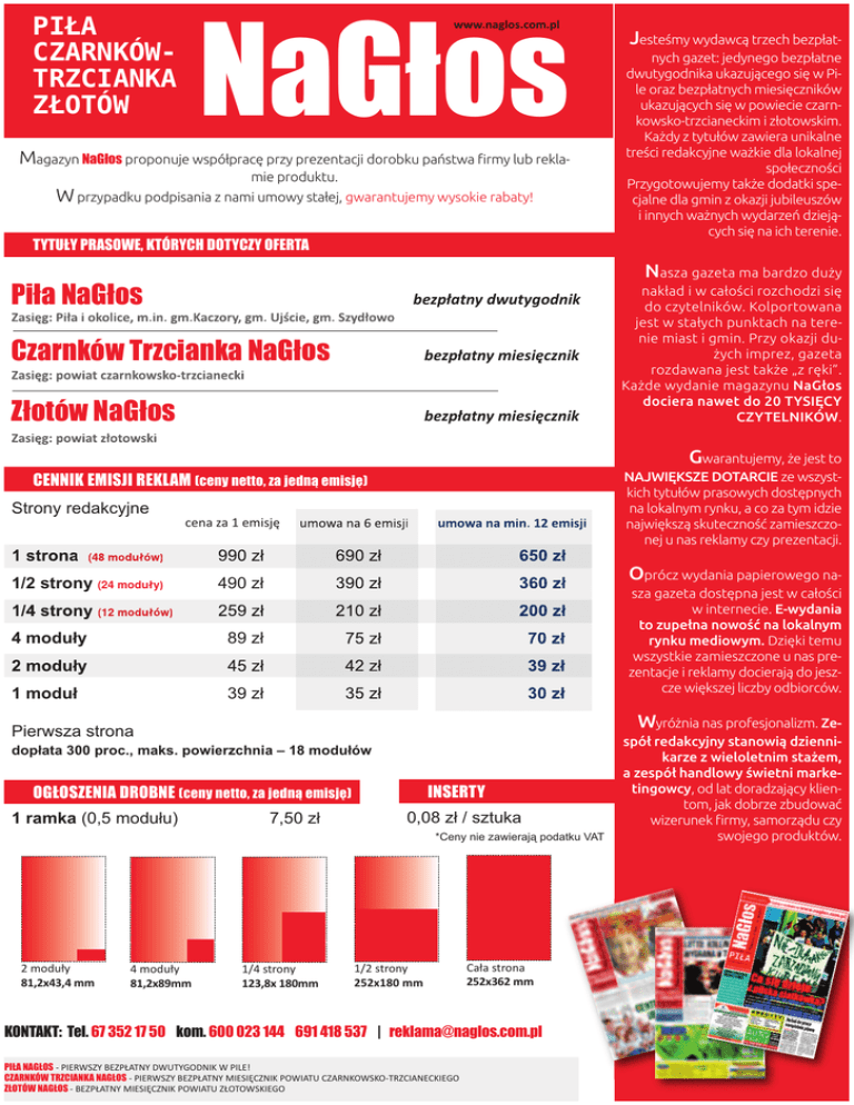 NaGłos PIŁA CZARNKÓWTRZCIANKA ZŁOTÓW www.naglos.com.pl Magazyn NaGłos proponuje współpracę przy prezentacji dorobku państwa firmy lub reklamie produktu. W przypadku podpisania z nami umowy stałej, gwarantujemy wysokie rabaty! TYTUŁY PRASOWE, KTÓRYCH DOTYCZY OFERTA Piła NaGłos bezpłatny dwutygodnik Czarnków Trzcianka NaGłos bezpłatny miesięcznik Złotów NaGłos bezpłatny miesięcznik CENNIK EMISJI REKLAM (ceny netto, za jedną emisję) Strony redakcyjne 1 strona cena za 1 emisję (48 modułów) 1/2 strony (24 moduły) 1/4 strony (12 modułów) 4 moduły 2 moduły 990 zł umowa na 6 emisji 490 zł Pierwsza strona 360 zł 259 zł 200 zł 210 zł 89 zł 70 zł 75 zł 39 zł 42 zł 39 zł 30 zł 35 zł dopłata 300 proc., maks. powierzchnia – 18 modułów OGŁOSZENIA DROBNE (ceny netto, za jedną emisję) 1 ramka (0,5 modułu) 2 moduły 81,2x43,4 mm 4 moduły 81,2x89mm 650 zł 390 zł 45 zł 1 moduł 690 zł umowa na min. 12 emisji 7,50 zł 1/4 strony 123,8x 180mm INSERTY 0,08 zł / sztuka *Ceny nie zawierają podatku VAT 1/2 strony 252x180 mm Cała strona 252x362 mm KONTAKT: Tel. 67 352 17 50 kom. 600 023 144 691 418 537 | [email protected] PIŁA NAGŁOS - PIERWSZY BEZPŁATNY DWUTYGODNIK W PILE! CZARNKÓW TRZCIANKA NAGŁOS - PIERWSZY BEZPŁATNY MIESIĘCZNIK POWIATU CZARNKOWSKO-TRZCIANECKIEGO ZŁOTÓW NAGŁOS - BEZPŁATNY MIESIĘCZNIK POWIATU ZŁOTOWSKIEGO Jesteśmy wydawcą trzech bezpłatnych gazet: jedynego bezpłatne dwutygodnika ukazującego się w Pile oraz bezpłatnych miesięczników ukazujących się w powiecie czarnkowsko-trzcianeckim i złotowskim. Każdy z tytułów zawiera unikalne treści redakcyjne ważkie dla lokalnej społeczności Przygotowujemy także dodatki specjalne dla gmin z okazji jubileuszów i innych ważnych wydarzeń dziejących się na ich terenie. Nasza gazeta ma bardzo duży nakład i w całości rozchodzi się do czytelników. Kolportowana jest w stałych punktach na terenie miast i gmin. Przy okazji dużych imprez, gazeta rozdawana jest także „z ręki”. Każde wydanie magazynu NaGłos dociera nawet do 20 TYSIĘCY CZYTELNIKÓW. Gwarantujemy, że jest to NAJWIĘKSZE DOTARCIE ze wszystkich tytułów prasowych dostępnych na lokalnym rynku, a co za tym idzie największą skuteczność zamieszczonej u nas reklamy czy prezentacji. Oprócz wydania papierowego nasza gazeta dostępna jest w całości w internecie. E-wydania to zupełna nowość na lokalnym rynku mediowym. Dzięki temu wszystkie zamieszczone u nas prezentacje i reklamy docierają do jeszcze większej liczby odbiorców. Wyróżnia nas profesjonalizm. Zespół redakcyjny stanowią dziennikarze z wieloletnim stażem, a zespół handlowy świetni marketingowcy, od lat doradzający klientom, jak dobrze zbudować wizerunek firmy, samorządu czy swojego produktów.