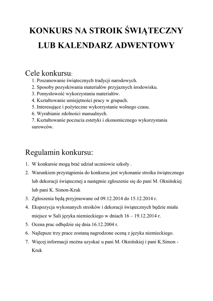 KONKURS NA STROIK ŚWIĄTECZNY LUB KALENDARZ ADWENTOWY Cele konkursu: 1. Poszanowanie świątecznych tradycji narodowych. 2. Sposoby pozyskiwania materiałów przyjaznych środowisku. 3. Pomysłowość wykorzystania materiałów. 4. Kształtowanie umiejętności pracy w grupach. 5. Interesujące i pożyteczne wykorzystanie wolnego czasu. 6. Wyrabianie zdolności manualnych. 7. Kształtowanie poczucia estetyki i ekonomicznego wykorzystania surowców. Regulamin konkursu: 1. W konkursie mogą brać udział uczniowie szkoły . 2. Warunkiem przystąpienia do konkursu jest wykonanie stroika świątecznego lub dekoracji świątecznej a następnie zgłoszenie się do pani M. Oknińskiej lub pani K. Simon-Kruk 3. Zgłoszenia będą przyjmowane od 09.12.2014 do 15.12.2014 r. 4. Ekspozycja wykonanych stroików i dekoracji świątecznych będzie miała miejsce w Sali języka niemieckiego w dniach 16 – 19.12.2014 r. 5. Ocena prac odbędzie się dnia 16.12.2004 r. 6. Najlepsze trzy prace zostaną nagrodzone oceną z języka niemieckiego. 7. Więcej informacji można uzyskać u pani M. Oknińskiej i pani K.Simon Kruk