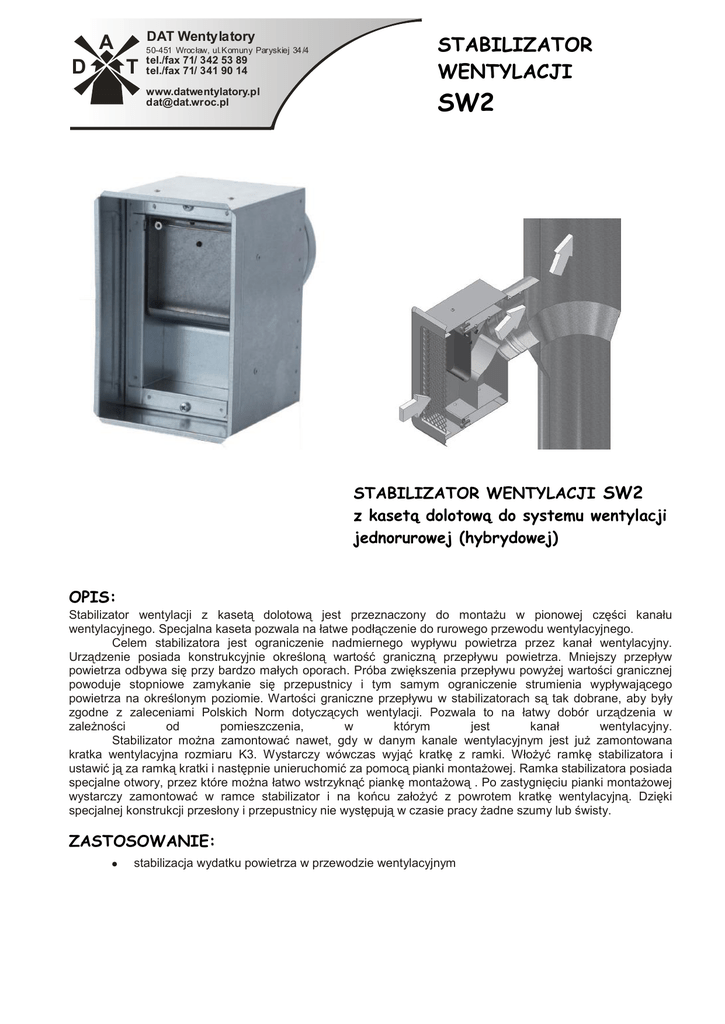 DAT Wentylatory A D 50-451 Wrocław, ul.Komuny Paryskiej 34 /4 T tel./fax 71/ 342 53 89 tel./fax 71/ 341 90 14 www.datwentylatory.pl [email protected] STABILIZATOR WENTYLACJI SW2 STABILIZATOR WENTYLACJI SW2 z kasetą dolotową do systemu wentylacji jednorurowej (hybrydowej) OPIS: Stabilizator wentylacji z kasetą dolotową jest przeznaczony do montażu w pionowej części kanału wentylacyjnego. Specjalna kaseta pozwala na łatwe podłączenie do rurowego przewodu wentylacyjnego. Celem stabilizatora jest ograniczenie nadmiernego wypływu powietrza przez kanał wentylacyjny. Urządzenie posiada konstrukcyjnie określoną wartość graniczną przepływu powietrza. Mniejszy przepływ powietrza odbywa się przy bardzo małych oporach. Próba zwiększenia przepływu powyżej wartości granicznej powoduje stopniowe zamykanie się przepustnicy i tym samym ograniczenie strumienia wypływającego powietrza na określonym poziomie. Wartości graniczne przepływu w stabilizatorach są tak dobrane, aby były zgodne z zaleceniami Polskich Norm dotyczących wentylacji. Pozwala to na łatwy dobór urządzenia w zależności od pomieszczenia, w którym jest kanał wentylacyjny. Stabilizator można zamontować nawet, gdy w danym kanale wentylacyjnym jest już zamontowana kratka wentylacyjna rozmiaru K3. Wystarczy wówczas wyjąć kratkę z ramki. Włożyć ramkę stabilizatora i ustawić ją za ramką kratki i następnie unieruchomić za pomocą pianki montażowej. Ramka stabilizatora posiada specjalne otwory, przez które można łatwo wstrzyknąć piankę montażową . Po zastygnięciu pianki montażowej wystarczy zamontować w ramce stabilizator i na końcu założyć z powrotem kratkę wentylacyjną. Dzięki specjalnej konstrukcji przesłony i przepustnicy nie występują w czasie pracy żadne szumy lub świsty. ZASTOSOWANIE: stabilizacja wydatku powietrza w przewodzie wentylacyjnym DAT Wentylatory A D STABILIZATOR WENTYLACJI 50-451 Wrocław, ul.Komuny Paryskiej 34 /4 T tel./fax 71/ 342 53 89 tel./fax 71/ 341 90 14 SW2 www.datwentylatory.pl [email protected] WYMIARY I DOBÓR: Wymiary [mm] Limit przepływu [m3/h] 152x227x204 20 - pokoje mieszkalne i sypialnie (na 1 osobę) 30 - kuchnia z oknem zewnętrznym z elektryczną kuchenką (mieszkanie dla 1 lub 2 osób) 152x227x204 Dobór Stabilera - ustęp oddzielny - pokoje mieszkalne i sypialnie (na 2 osoby) 152x227x204 50 - Kuchnia z oknem zewnętrznym z kuchenką elektryczną (mieszkanie dla 3 osób) - kuchnia bez okna zewnętrznego lub wnęka, kuchnia z kuchenką elektryczną - łazienka z ustępem lub bez 152x227x204 70 - Kuchnia z oknem zewnętrznym z kuchenką gazową lub węglową - Pokoje mieszkalne (na 3 osoby) 152x227x204 OZNACZENIE: 90 - Pokoje mieszkalne i sypialnie (na 4 osoby) DAT Wentylatory A D 50-451 Wrocław, ul.Komuny Paryskiej 34 /4 T tel./fax 71/ 342 53 89 tel./fax 71/ 341 90 14 www.datwentylatory.pl [email protected] WERSJE: STABILIZATOR WENTYLACJI SW2 DAT Wentylatory A D 50-451 Wrocław, ul.Komuny Paryskiej 34 /4 T tel./fax 71/ 342 53 89 tel./fax 71/ 341 90 14 www.datwentylatory.pl [email protected] CHARAKTERYSTYKI PRZEPŁYWU: STABILIZATOR WENTYLACJI SW2