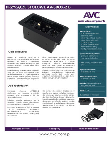 PRZYŁĄCZE STOŁOWE AV-SBOX-2 B Specyfikacja: Wyposażenie: - 2x europejskie gniazdo zasilania 230V - kabel VGA (d-sub, żeńskie) - kabel Audio Mini Jack - 2x kabel HDMI - 2x kabel Ethernet RJ45 - możliwość dowolnej konfiguracji okablowania Opis produktu: Łatwe w montażu przyłącze z odchylaną oraz wsuwaną do wnętrza pokrywą to idealne rozwiązanie wszędzie tam, gdzie wymagana jest wysoka estetyka, uniwersalność oraz niezawodność. Video. Dodatkowo wyposażony został w kabel Audio Mini Jack, 2x kabel Ethernetowy RJ45 oraz 2x gniazdo zasilające, tworząc kompleksowe przyłącze, wymagane w większości profesjonalnych instalacji Audio-Video. Rozbudowany przedni panel wyposażony jest w luźno wyciągane przedłużacze kablowe VGA (d-sub) oraz 2x HDMI, dzięki którym potrafi obsłużyć większość standardowych sygnałów Dzięki możliwości adaptacji praktycznie każdych przedłużaczy kablowych przyłącze może być użyte przy wszystkich instalacjach bez względu na rodzaj obsługiwanych urządzeń. Pokrywa panelu wykonana jest z wysokiej jakości stopu aluminiowomagnezowego o grubości 5 mm. Przyłącze wyposażone jest w zestaw 1,5 m przedłużaczy kablowych umożliwiających podłączenie bezpośrednio do puszki podłogowej (floorbox-a). Przyłącza stołowe Kolor: czarny, szczotkowana stal Wymiary całkowite: 243x140x135 mm Wymiary montażowe: 225x122x135 mm Materiał: Stop aluminiowomagnezowy, stal Opis techniczny: Przyłącze stołowe AV-SBOX-2 otwierane jest poprzez uniesienie pokrywy oraz wpuszczenie jej do wnętrza kołnierza. Sposób otwarcia panelu: pokrywa odchylana, wsuwana do środka Na zestaw akcesoriów składają się 2 regulowane zaciski motylkowe służące do solidnego przymocowania panelu do stołu konferencyjnego z blatami o każdej grubości. Do każdego przyłącza dołączany jest również szablon (ramka montażowa) umożliwiająca dokładne wyznaczenie i wycięcie w blacie otworu pod przyłącze. Mediaporty www.avc.com.pl Waga: 3 kg Gwarancja: 24 miesiące Porty multimedialne