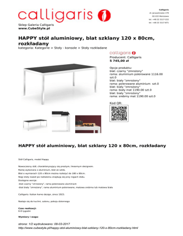 Calligaris Al. Jerozolimskie 179 02-222 Warszawa tel. +48 22 3117-222 tel. +48 22 3117-871 Sklep Galeria Calligaris www.CubeStyle.pl HAPPY stół aluminiowy, blat szklany 120 x 80cm, rozkładany kategoria: Kategorie > Stoły - konsole > Stoły rozkładane Producent: Calligaris 5 745,00 zł Opcje produktu: blat: czarny "zmrożony" rama: aluminium polerowane 1116.00 szt.0 blat: biały "zmrożony" rama: polerowane aluminium szt.0 blat: biały "zmrożony" rama: biały mat 1190.00 szt.0 blat: biały "zmrożony" rama: srebrny mat 1190.00 szt.0 Kod QR: HAPPY stół aluminiowy, blat szklany 120 x 80cm, rozkładany Stół Calligaris, model Happy Nowoczesny stół, charakteryzujący się prostym, linearnym designem. Ramę wykonano z aluminium, blat ze szkła. Blat o wymiarach 120 x 80cm można rozłożyć do 180 x 80cm. Nogi stoły nawet po rozłożeniu znajdują się przy rogach stołu. Dostępne wersje: -blat czarny "zmrożony", rama polerowane aluminium -blat biały "zmrożony", rama aluminium polerowane, matowa srebrna lub matowa biała Calligaris: Italian home design, since 1923. Nadaje się do kuchni, salonu, pokoju dziennego Czas realizacji: 6-8 tygodni Wymiary i waga: strona: 1/2 wydrukowano: 08-03-2017 http://www.cubestyle.pl/happy-stol-aluminiowy-blat-szklany-120-x-80cm-rozkladany.html 80 cm 120 cm 75 cm 180 cm Dostępne wersje: Structure Glass top strona: 2/2 wydrukowano: 08-03-2017 http://www.cubestyle.pl/happy-stol-aluminiowy-blat-szklany-120-x-80cm-rozkladany.html 60.5 kg
