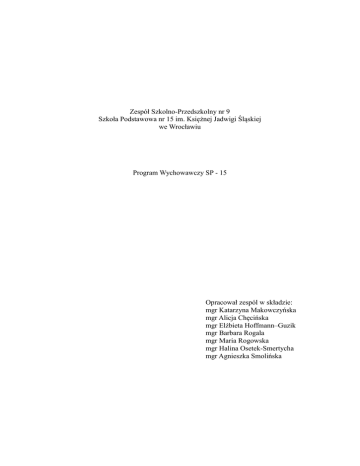 Zespół Szkolno-Przedszkolny nr 9 Szkoła Podstawowa nr 15 im. Księżnej Jadwigi Śląskiej we Wrocławiu Program Wychowawczy SP - 15 Opracował zespól w składzie: mgr Katarzyna Makowczyńska mgr Alicja Chęcińska mgr Elżbieta Hoffmann–Guzik mgr Barbara Rogala mgr Maria Rogowska mgr Halina Osetek-Smertycha mgr Agnieszka Smolińska Spis treści WSTĘP ….................................................................................................................................... 1 CELE OGÓLNE: …..................................................................................................................... 2 PRIORYTETOWE CELE WYCHOWANIA: …......................................................................... 2 ZADANIA WYCHOWAWCZE KLASY 0-III .…........................................................................ ZADANIA WYCHOWAWCZE KLASY IV-VI …...................................................................... 5 EFEKTY DZIAŁAŃ WYCHOWAWCZYCH …........................................................................ 7 WSPÓŁPRACA Z RODZICAMI …............................................................................................ 8 ZADANIA PREWENCYJNEJ GRUPY WSPARCIA W SP 15 ….............................................. 9 WSPÓŁPRACA ZE ŚRODOWISKIEM …................................................................................. 10 ZADANIA SZKOLNEGO KOORDYNATORA DS: BEZPIECZEŃSTWA …......................... 11 TRADYCJE 1 SZKOLNE AKCJE, STAŁE ŚWIĘTA I UROCZYSTOŚĆ …........................... 11 SYLWETKA ABSOLWENTA SP NR 15 …............................................................................... 13 EWALUACJA SZKOLNEGO PROGRAMU WYCHOWAWCZEGO …................................. 14 ANKIETA EWALUACYJNA DLA RODZICÓW ….................................................................. 15 ANKIETA DLA UCZNIÓW …................................................................................................... 16 ANKIETA DLA NAUCZYCIELI …............................................................................................ 17 Wstęp. Program wychowawczy Szkoły opiera się na wartościach uniwersalnych, zakłada spójność działań wychowawczych pomiędzy szkoła i rodziną, jak również innymi instytucjami. Niezbędnym warunkiem wychowania jest także integralne traktowanie wiedzy z kreowaniem umiejętności. Program Wychowawczy Szkoły został opracowany przez zespół nauczycieli po wcześniejszym rozpoznaniu potrzeb uczniów i oczekiwań rodziców. Został on oparty na wizji i misji szkoły. Treści programu zgodne są ze Statutem Szkoły. Na terenie placówki w ramach pracy wychowawczej mogą zostać wprowadzone w zależności od aktualnych potrzeb tematyczne lub okresowe programy. W związku z tym w oparciu o Program Wychowawczy funkcjonują trzy programy: Program Promocji Zdrowia, Szkolny Program Profilaktyki, Szkolny Program Wspierania Uzdolnień. Podstawą pracy każdego wychowawcy klasowego są odrębne klasowe programy pracy wychowawczej, w których zawarte są treści ściśle powiązane z Programem Wychowawczym Szkoły, jak również uwzględniają działania ujęte w wyżej wymienionych programach. Program Wychowawczy Szkoły jest dokumentem, który ulega okresowej ewaluacji oraz monitorowaniu. Cele ogólne: Wspomaganie wszechstronnego i harmonijnego rozwoju ucznia. Przygotowanie ucznia do funkcjonowania w grupie szkolnej i efektywnego w niej działania. Umacnianie wiary dziecka we własne siły i zdolności osiągania wartościowych i trudnych celów. Przygotowanie do życia w ustawicznie zmieniającym się świecie. Rozbudzenie i rozwijanie wrażliwości estetycznej i moralnej dziecka oraz jego indywidualnych zdolności twórczych. Priorytetowe cele wychowania: Uczeń potrafi funkcjonować w nowej grupie i efektywnie w niej działać. Uczeń posiada nawyki dobrego zachowania i efektywnej współpracy, komunikowania się z rówieśnikami oraz dorosłymi. Uczeń wykazuje wiarę we własne możliwości i potrafi zachować się w trudnych sytuacjach. Uczeń rozumie siebie i dostrzega prawidłowości rządzące światem zewnętrznym. Uczeń zna normy i zasady życia społecznego i według nich postępuje. Zadania Sposób realizacji Osoba odpowiedzialna 1. Organizowanie zajęć integrujących zespół klasowy. Gry i zabawy integracyjne. Imprezy klasowe, wycieczki: Uroczystości klasowe i szkolne (np.ślubowanie klas pierwszych, wigilia itp:): Wychowawcy kl. 0-III Pedagog Wychowawcy świetlicy 2. Opracowanie obowiązujących w klasie, w szkole i poza nią norm i reguł zachowania. Kontrakty klasowe. Czynny udział w imprezach kulturalnych organizowanych w szkole i poza szkołą: Wewnątrzszkolne zasady oceniania zachowania uczniów: Wychowawcy Nauczyciele 3. Uczenie nawyków dobrego zachowania i porozumiewania się z ludźmi: Pogadanki, dyskusje z dziećmi: Zabawy integracyjne: Inscenizacje przygotowane przez uczniów obrazujące właściwe zachowanie w różnych sytuacjach': Przykłady pozytywnych wzorców literackich: Gazetki tematyczne. Wychowawcy Nauczyciele Pedagog 4. Tworzenie i kultywowanie tradycji szkoły, miasta, regionu i państwa: Udział w ważnych apelach i uroczystościach: Spotkania z ciekawymi ludźmi. Zapoznanie z legendarni związanymi z naszym miastem, regionem i państwem: Wychowawcy Nauczyciele Stosowanie oceniania wspierającego uzdolnienia'. Diagnozowanie uzdolnień w klasach trzecich': Różnicowanie wymagań edukacyjnych. Udział w zajęciach poza lekcyjnych: Udział w konkursach klasowych, szkolnych i pozaszkolnych: Angażowanie do pracy w samorządzie klasowym. Wychowawcy Nauczyciele 5. Organizowanie sytuacji sprzyjających podnoszeniu wiary we własne możliwości: 6. Promowanie postaw prozdrowotnych, Udział w imprezach sportowych i akcjach Wychowawcy Nauczyciele proekologicznych i prospołecznych prozdrowotnych': Uczestnictwo w akcjach ekologicznych na terenie szkoły i 