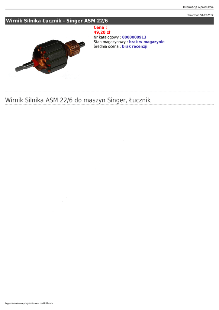 Informacje o produkcie Utworzono 08-03-2017 Wirnik Silnika Łucznik - Singer ASM 22/6 Cena : 49,20 zł Wygenerowano w programie www.oscGold.com r a m r te a w Wirnik Silnika ASM 22/6 do maszyn Singer, Łucznik k Nr katalogowy : 0000000913 Stan magazynowy : brak w magazynie Średnia ocena : brak recenzji