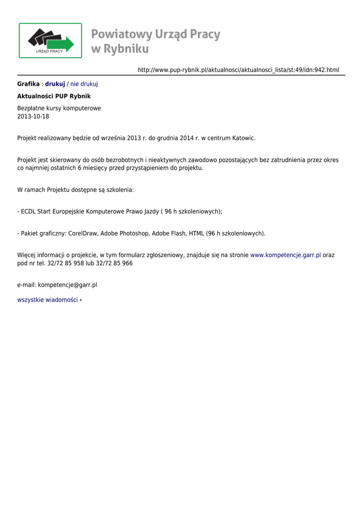 http://www.pup-rybnik.pl/aktualnosci/aktualnosci_lista/st:49/idn:942.html Grafika : drukuj / nie drukuj Aktualności PUP Rybnik Bezpłatne kursy komputerowe 2013-10-18 Projekt realizowany będzie od września 2013 r. do grudnia 2014 r. w centrum Katowic. Projekt jest skierowany do osób bezrobotnych i nieaktywnych zawodowo pozostających bez zatrudnienia przez okres co najmniej ostatnich 6 miesięcy przed przystąpieniem do projektu. W ramach Projektu dostępne są szkolenia: - ECDL Start Europejskie Komputerowe Prawo Jazdy ( 96 h szkoleniowych); - Pakiet graficzny: CorelDraw, Adobe Photoshop, Adobe Flash, HTML (96 h szkoleniowych). Więcej informacji o projekcie, w tym formularz zgłoszeniowy, znajduje się na stronie www.kompetencje.garr.pl oraz pod nr tel. 32/72 85 958 lub 32/72 85 966 e-mail: [email protected] wszystkie wiadomości ›