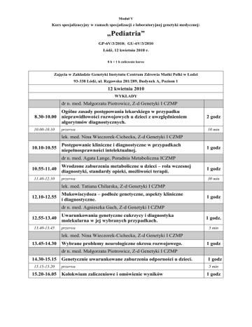 Moduł V Kurs specjalizacyjny w ramach specjalizacji z laboratoryjnej genetyki medycznej: „Pediatria” GP-6V/3/2010; GU-6V/3/2010 Łódź, 12 kwietnia 2010 r. 8 h + 1 h zaliczenie kursu Zajęcia w Zakładzie Genetyki Instytutu Centrum Zdrowia Matki Polki w Łodzi 93-338 Łódź, ul. Rzgowska 281/289, Budynek A, Poziom 1 12 kwietnia 2010 WYKŁADY dr n. med. Małgorzata Piotrowicz, Z-d Genetyki I CZMP Ogólne zasady postępowania lekarskiego w przypadku 8.30-10.00 nieprawidłowości rozwojowych u dzieci z uwzględnieniem algorytmów diagnostycznych. 10.00-10.10 przerwa 2 godz 10 min lek. med. Nina Wieczorek-Cichecka, Z-d Genetyki I CZMP 10.10-10.55 Postępowanie kliniczne i diagnostyczne w przypadkach niepełnosprawności intelektualnej. 1 godz dr n. med. Agata Lange, Poradnia Metaboliczna ICZMP 10.55-11.40 11.40-12.10 Wrodzone zaburzenia metaboliczne u dzieci – rola wczesnej diagnostyki, standardy opieki, możliwości terapii. 1 godz przerwa 30 min lek. med. Tatiana Chilarska, Z-d Genetyki I CZMP 12.10-12.55 Mukowiscydoza – podłoże genetyczne, aspekty kliniczne i diagnostyczne. 1 godz dr n. med. Agnieszka Gach, Z-d Genetyki I CZMP 12.55-13.40 13.40-13.45 Uwarunkowania genetyczne cukrzycy i diagnostyka molekularna w jej wybranych przypadkach. przerwa 1 godz. 5 min lek. med. Nina Wieczorek-Cichecka, Z-d Genetyki I CZMP 13.45-14.30 Wybrane problemy neurologiczne okresu rozwojowego. 1 godz dr n. med. Małgorzata Piotrowicz, Z-d Genetyki I CZMP 14.30-15.15 Genetycznie uwarunkowane zaburzenia odporności u dzieci. 15.15-15.20 przerwa 15.20-16.05 Kolokwium zaliczeniowe i omówienie wyników 1 godz 5 min 1 godz Moduł V Kurs specjalizacyjny w ramach specjalizacji z laboratoryjnej genetyki medycznej: „Diagnostyka zaburzeń cielesno-płciowych” GP-6V/2/2010; GU-6V/2/2010 Łódź, 13 kwietnia 2010 r. 8 h + 1 h zaliczenie kursu Zajęcia w Zakładzie Genetyki Instytutu Centrum Zdrowia Matki Polki w Łodzi 93-338 Łódź, ul. Rzgowska 281/289, Budynek A, Poziom 1 13 kwietnia 2010 WYKŁADY dr hab. n. med. Lucjusz Jakubowski, Z-d Genetyki I CZMP, prof. nadzw. UM w Łodzi 8.00-8.45 8.45-8.50 8.50-10.20 10.20-10.30 Podstawy molekularne rozwoju i funkcjonowania układu 1 godz rozrodczego przerwa 5 min dr hab. n. med. Maciej Hilczer, Klinika Endokrynologii i Chorób Metabolicznych I CZMP Zasady postępowania diagnostycznego w przypadkach 2 godz nieprawidłowości rozwoju płciowego przerwa 10 min dr n. med. Maria Szarras-Czapnik, Klinika Chorób Metabolicznych, Endokrynologicznych i Diabetologicznych IP-CZD 10.30-12.00 12.00-12.15 Nieprawidłowości rozwoju cech płciowych – aktualna klasyfikacja i zasady postępowania terapeutycznego 2 godz przerwa 15 min mgr Iwona Pinkier, Z-d Genetyki I CZMP 12.15-13.00 13.00-13.30 Diagnostyka cytogenetyczna w przypadkach nieprawidłowości rozwoju płciowego 1 godz przerwa 30 min dr n. przyr. Anna Jeziorowska, Z-d Genetyki I CZMP 13.30-14.15 14.15-14.25 Diagnostyka molekularna w przypadkach nieprawidłowości rozwoju płciowego 1 godz przerwa 10 min lek. med. Tatiana Chilarska, Z-d Genetyki I CZMP 14.25-15.10 15.10-15.15 Rozwiązywanie zadań diagnostycznych dotyczących nieprawidłowości rozwoju płciowego przerwa 15.15-16.00 Kolokwium zaliczeniowe i omówienie wyników 1 godz 5 min 1 godz