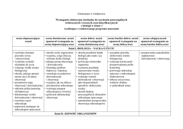 Gimnazjum w Jordanowie Wymagania edukacyjne niezbędne do uzyskania poszczególnych śródrocznych i rocznych ocen klasyfikacyjnych z biologii w klasie 1 wynikające z realizowanego programu nauczania ocena dopuszczająca: uczeń ocena dostateczna: uczeń opanował wymagania na ocenę dopuszczającą oraz: ocena dobra: uczeń opanował wymagania na ocenę dostateczną oraz: ocena bardzo dobra: uczeń ocena celująca:uczeń opanował wymagania na opanował wymagania na ocenę dobrą oraz: ocenę bardzo dobrą oraz: Dział I. BIOLOGIA – NAUKA O ŻYCIU • rozróżnia elementy przyrody żywej i nieożywionej • wymienia czynniki niezbędne do życia • wskazuje źródła wiedzy biologicznej • określa, jakiego sprzętu można użyć do danej obserwacji • przedstawia etapy obserwacji i doświadczenia • odróżnia próbę kontrolną od badawczej • dokumentuje wyniki doświadczenia i obserwacji • rozróżnia części mikroskopu • poprawnie posługuje się mikroskopem optycznym • określa cechy organizmów • wyjaśnia, czego dotyczą wybrane działy biologii • planuje prostą obserwację i doświadczenie • formułuje problem badawczy i hipotezę • wnioskuje na podstawie doświadczenia i obserwacji • wyjaśnia, jak się oblicza powiększenie mikroskopu • wykonuje preparat mikroskopowy (świeży) • graficznie dokumentuje obserwacje • określa przedmiot badań biologii jako nauki i jej dziedziny • porównuje różnorodne organizmy • wymienia przykłady zastosowania wiedzy biologicznej w życiu • wykazuje wartość doświadczeń i obserwacji jako bezpośrednich sposobów zdobywania wiedzy • określa funkcje poszczególnych elementów mikroskopu optycznego • samodzielnie przeprowadza obserwacje mikroskopowe Dział II. JEDNOŚĆ ORGANIZMÓW • uzasadnia potrzebę zdobywania wiedzy biologicznej • wykazuje konieczność przeprowadzania próby kontrolnej • porównuje mikroskop optyczny z mikroskopem elektronowym • oblicza rzeczywistą wielkość obiektu w jednostkach miary • przeprowadza samodzielnie zaplanowane doświadczenie i obserwację • wymienia komórki jako elementy budowy organizmów • poprawnie posługuje się mikroskopem optycznym • wymienia elementy budowy komórki zwierzęcej i roślinnej • wymienia elementy budowy komórki bakteryjnej • rozpoznaje elementy budowy komórek na rysunkach i schematach • wyjaśnia zależność między komórką, tkanką, narządem i układem narządów • wymienia przykłady organizmów odżywiających się różnymi sposobami • na podstawie rodzaju pobieranego pokarmu, określa do jakiej grupy organizmów cudzożywnych należy dany organizm • określa substraty i produkty fotosyntezy • wykazuje różnicę między oddychaniem komórkowym a wymianą gazową • podaje przykłady wykorzystania energii przez organizm • rozróżnia oddychanie tlenowe i beztlenowe • podaje przykłady różnych komórek zwierzęcych i człowieka • porównuje budowę komórek roślinnych, zwierzęcych i bakteryjnych • wykonuje preparat ze świeżego materiału roślinnego • określa lokalizację tkanek zwierzęcych i ich funkcje w organizmach • wykazuje złożoność budowy organizmów • podaje przykłady tkanek zwierzęcych i ich podstawowe funkcje w organizmie • planuje doświadczenia wykazujące wpływ warunków zewnętrznych na przebieg fotosyntezy • sprawnie posługuje się mikroskopem optycznym • wyjaśnia sposoby trawienia pokarmu przez organizmy cudzożywne • wyjaśnia proces oddychania • wyjaśnia znaczenie próby kontrolnej w doświadczeniach • wyciąga wnioski z wyników doświadczeń • przeprowadza doświadczenie • przedstawia funkcje poszczególnych składników komórki zwierzęcej • wskazuje cechy pozwalające na rozróżnienie komórek: zwierzęcej, roślinnej, bakteryjnej • przedstawia funkcje poszczególnych składników komórek roślinnych i bakteryjnych • wykazuje różnorodność tkanek budujących dany narząd • opisuje hierarchiczną budowę organizmów • przedstawia różne sposoby odżywiania się organizmów • uzasadnia rolę chlorofilu w fotosyntezie • określa warunki przebiegu fotosyntezy • określa warunki oddychania tlenowego, jego substraty i produkty • określa warunki przebiegu procesu fermentacji oraz jego substraty i produkty • planuje doświadczenie wykrywające produkty fermentacji podaje przykłady wykorzystania fermentacji w przemyśle i gospodarstwie domowym • wykazuje zależność między • przeprowadza samodzielnie budową komórki zaplanowane zwierzęcej a jej funkcją doświadczenie wykazujące • wykazuje zależność między wpływ warunków budową komórek zewnętrznych na przebieg roślinnych i bakteryjnych fotosyntezy • uzasadnia znaczenie a ich funkcjami • uzasadnia konieczność rozmnażania dla gatunku, współdziałania narządów a nie dla pojedynczego i układów narządów osobnika • wyjaśnia pojęcie trawienie • interpretuje wyniki wewnątrzkomórkowe doświadczeń i pozakomórkowe • wykazuje znaczenie fotosyntezy dla istnienia życia na Ziemi • porównuje substraty i produkty oddychania tlenowego i beztlenowego • wykazuje związek między środowiskiem życia a rodzajem zapłodnienia • rozróżnia typy rozmnażania przedstawia narządy wykrywające produkty wymiany gazowej różnych fermentacji dokumentuje bezpłciowego organizmów wyniki doświadczenia • wymienia korzyści • wymienia sposoby • wymienia różnice między z rozmnażania płciowego rozmnażania się rozwojem prostym • podaje przykłady organizmów a złożonym organizmów obupłciowych • definiuje pojęcia: • przedstawia różnice między i rozdzielnopłciowych zapłodnienie i zygota rozmnażaniem płciowym i bezpłciowym • wymienia przykłady organizmów o rozwoju prostym i złożonym Dział III. RÓŻNORODNOŚĆ ORGANIZMÓW Klasyfikacja organizmów • przedstawia kryteria klasyfikacji organizmów • p