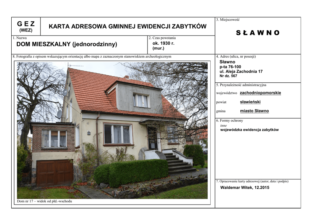 GEZ (WEZ) 3. Miejscowość KARTA ADRESOWA GMINNEJ EWIDENCJI ZABYTKÓW 1. Nazwa DOM MIESZKALNY (jednorodzinny) SŁAWNO 2. Czas powstania ok. 1930 r. (mur.) 8. Fotografia z opisem wskazującym orientację albo mapa z zaznaczonym stanowiskiem archeologicznym 4. Adres (ulica, nr posesji) Sławno p-ta 76-100 ul. Aleja Zachodnia 17 Nr dz. 567 5. Przynależność administracyjna województwo zachodniopomorskie powiat sławieński gmina miasto Sławno 6. Formy ochrony inne wojewódzka ewidencja zabytków 7. Opracowanie karty adresowej (autor, data i podpis) Waldemar Witek, 12.2015 Dom nr 17 – widok od płd.-wschodu 9. Fotografie, ikonografia 10. Mapy, plany Budynek murowany, tynkowany, parterowy, nakryty dachem dwuspadowym z wystawką frontową i użytkowym poddaszem. W szczycie murowana weranda. Wysoki cokół kamienny. Fasada 3-osiowa, z prostymi opaskami okiennymi. Okna nowe. Plan miasta Sławno (Schlawe) - 1939 Dom nr 17 – widok od płn.-wschodu Mapa topograficzna Sławna