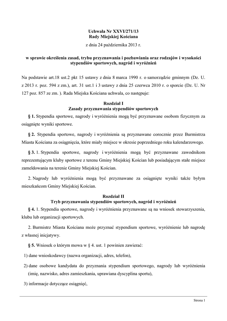 Uchwała Nr XXVI/271/13 Rady Miejskiej Kościana z dnia 24 października 2013 r. w sprawie określenia zasad, trybu przyznawania i pozbawiania oraz rodzajów i wysokości stypendiów sportowych, nagród i wyróżnień Na podstawie art.18 ust.2 pkt 15 ustawy z dnia 8 marca 1990 r. o samorządzie gminnym (Dz. U. z 2013 r. poz. 594 z zm.), art. 31 ust.1 i 3 ustawy z dnia 25 czerwca 2010 r. o sporcie (Dz. U. Nr 127 poz. 857 ze zm. ). Rada Miejska Kościana uchwala, co następuje: Rozdział I Zasady przyznawania stypendiów sportowych § 1. Stypendia sportowe, nagrody i wyróżnienia mogą być przyznawane osobom fizycznym za osiągnięte wyniki sportowe. § 2. Stypendia sportowe, nagrody i wyróżnienia są przyznawane corocznie przez Burmistrza Miasta Kościana za osiągnięcia, które miały miejsce w okresie poprzedniego roku kalendarzowego. § 3. 1. Stypendia sportowe, nagrody i wyróżnienia mogą być przyznawane zawodnikom reprezentującym kluby sportowe z terenu Gminy Miejskiej Kościan lub posiadającym stałe miejsce zameldowania na terenie Gminy Miejskiej Kościan. 2. Nagrody lub wyróżnienia mogą być przyznawane za osiągnięte wyniki także byłym mieszkańcom Gminy Miejskiej Kościan. Rozdział II Tryb przyznawania stypendiów sportowych, nagród i wyróżnień § 4. 1. Stypendia sportowe, nagrody i wyróżnienia przyznawane są na wniosek stowarzyszenia, klubu lub organizacji sportowych. 2. Burmistrz Miasta Kościana może przyznać stypendium sportowe, wyróżnienie lub nagrodę z własnej inicjatywy. § 5. Wniosek o którym mowa w § 4. ust. 1 powinien zawierać: 1) dane wnioskodawcy (nazwa organizacji, adres, telefon), 2) dane osobowe kandydata do przyznania stypendium sportowego, nagrody lub wyróżnienia (imię, nazwisko, adres zamieszkania, uprawiana dyscyplina sportu), 3) informacje dotyczące osiągnięć, Strona 1 4) uzasadnienie wniosku, 5) podpis osób uprawnionych do reprezentowania wnioskodawcy. § 6. Wnioski o stypendia sportowe, nagrody lub wyróżnienia można składać do Urzędu Miejskiego Kościana w terminach: do 15 stycznia i do 15 maja każdego roku. § 7. Złożenie wniosku nie jest równoznaczne z przyznaniem stypendium sportowego, nagrody lub wyróżnienia. § 8. 1. Wnioski o stypendia, nagrody i wyróżnienia rozpatruje komisja powołana przez Burmistrza Miasta Kościana w składzie co najmniej trzyosobowym. W skład Komisji mogą zostać powołani radni Rady Miejskiej Kościana , członkowie Rady Sportu oraz pracownicy Urzędu Miejskiego Kościana, z wyłączeniem osób reprezentujących stowarzyszenia, kluby lub organizacje sportowe występujące z wnioskami o przyznanie stypendium sportowego, nagrody lub wyróżnienia. 2. Komisja o której mowa ust. 1 przedstawia Burmistrzowi Miasta Kościana propozycję listy kandydatów do przyznania stypendium sportowego, nagrody lub wyróżnienia oraz propozycje wysokości stypendiów sportowych, nagród i wyróżnień. § 9. 1. Ostateczną decyzję w sprawie przyznania stypendium sportowego, nagrody lub wyróżnienia podejmuje Burmistrz Miasta Kościana. 2. Burmistrz Miasta Kościana decyduje również o wysokości stypendium sportowego, okresie na który zostanie ono przyznane, oraz o wysokości i rodzaju nagród i wyróżnień. Rozdział III Zasady i tryb pozbawiania stypendiów sportowych, nagród i wyróżnień § 10. Burmistrz Miasta Kościana pozbawia zawodnika stypendium sportowego, nagrody lub wyróżnienia w przypadku zmiany stanu faktycznego będącego podstawą ich przyznania. § 11. Burmistrz Miasta Kościana pozbawia stypendium sportowego, nagrody lub wyróżnienia zawodnika na uzasadniony wniosek organizacji, która wystąpiła z wnioskiem o ich przyznanie lub z własnej inicjatywy. § 12. Wniosek organizacji o pozbawienia zawodnika stypendium sportowego, nagrody lub wyróżnienia powinien zawierać co najmniej: 1) uzasadnienie, 2) dowody potwierdzające zmianę stanu faktycznego związanego z przyznaniem stypendium, nagrody lub wyróżnienia, 3) wyjaśnienia zawodnika lub jego trenera. Strona 2 § 13. O pozbawieniu stypendium sportowego, nagrody lub wyróżnienia Burmistrz Miasta Kościana informuje pisemnie zawodnika, a także wnioskodawcę, jeżeli pozbawienie nastąpiło na wniosek, o którym mowa w § 11. § 14. Pozbawienie stypendium sportowego może spowodować konieczność zwrotu do budżetu Gminy Miejskiej Kościan otrzymanego stypendium. § 15. Pozbawienie nagrody powoduje konieczność zwrotu do budżetu Gminy Miejskiej Kościan równowartości otrzymanej nagrody. § 16. Informacja, o której mowa w § 13 winna zawierać termin oraz wartość zwrotu stypendium sportowego lub nagrody. Rozdział IV Rodzaje i wysokość stypendiów sportowych, nagród i wyróżnień § 17. Stypendia sportowe, nagrody lub wyróżnienia mogą być przyznawane za następujące osiągnięcia sportowe: 1) w dyscyplinach olimpijskich: a) za zajęcie I-VIII miejsca na igrzyskach olimpijskich, b) za zajęcie I-VIII miejsca w mistrzostwach świata, mistrzostwach Europy lub pucharze świata, c) za zajęcie I- III miejsca w mistrzostwach Polski seniorów i młodzieżowców, d) za zajęcie I-III miejsca w mistrzostwach Polski juniorów i juniorów młodszych, 2) w dyscyplinach nieolimpijskich: a) za zajęcie I-VIII miejsca w mistrzostwach świata, mistrzostwach Europy lub pucharze świata, b) za zajęcie I-III miejsca w mistrzostwach Polski seniorów i młodzieżowców, c) za zajęcie I-III miejsca w mistrzostwach Polski juniorów i juniorów młodszych (kadetów), 3) w zawodach paraolimpijskich: a) za zajęcie I-VIII miejsca w igrzyskach paraolimpijskich, b) za zajęcie I-VIII miejsca w mistrzostwach świata lub Europy, 4) w grach zespołowych: a) za udział zespołu w rozgrywkach ekstraligi, b) za udział zespołu w rozgrywkach I ligi, 5) oraz innych rozgrywkach ogólnopolskich: Strona 3 a) za zajęcie I-III miejsca we współzawodnictwie sportowym organizowanym przez Polski Związek Sportowy lub dyscyplinę ob