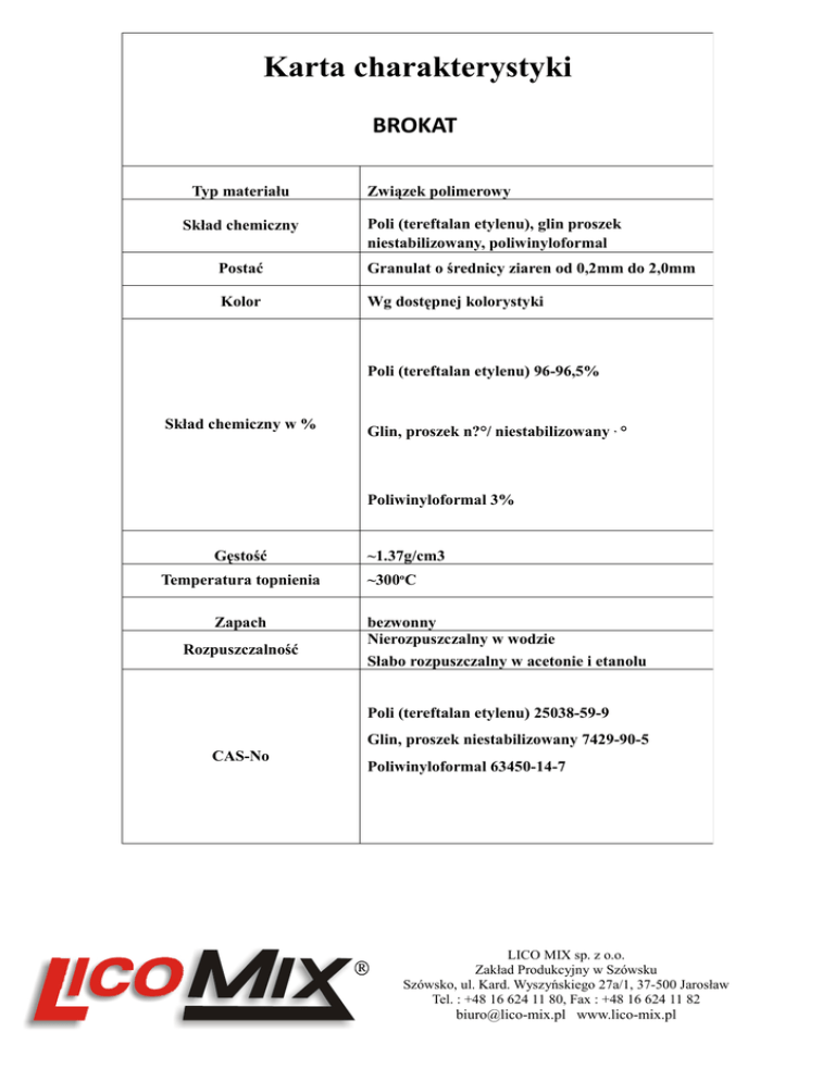 Karta charakterystyki BROKAT Typ materiału Skład chemiczny Związek polimerowy Poli (tereftalan etylenu), glin proszek niestabilizowany, poliwinyloformal Postać Granulat o średnicy ziaren od 0,2mm do 2,0mm Kolor Wg dostępnej kolorystyki Poli (tereftalan etylenu) 96-96,5% Skład chemiczny w % Glin, proszek n?°/ niestabilizowany , ° Poliwinyloformal 3% Gęstość Temperatura topnienia Zapach Rozpuszczalność ~1.37g/cm3 ~300oC bezwonny Nierozpuszczalny w wodzie Słabo rozpuszczalny w acetonie i etanolu Poli (tereftalan etylenu) 25038-59-9 CAS-No Glin, proszek niestabilizowany 7429-90-5 Poliwinyloformal 63450-14-7 LICO MIX sp. z o.o. Zakład Produkcyjny w Szówsku Szówsko, ul. Kard. Wyszyńskiego 27a/1, 37-500 Jarosław Tel. : +48 16 624 11 80, Fax : +48 16 624 11 82 [email protected] www.lico-mix.pl