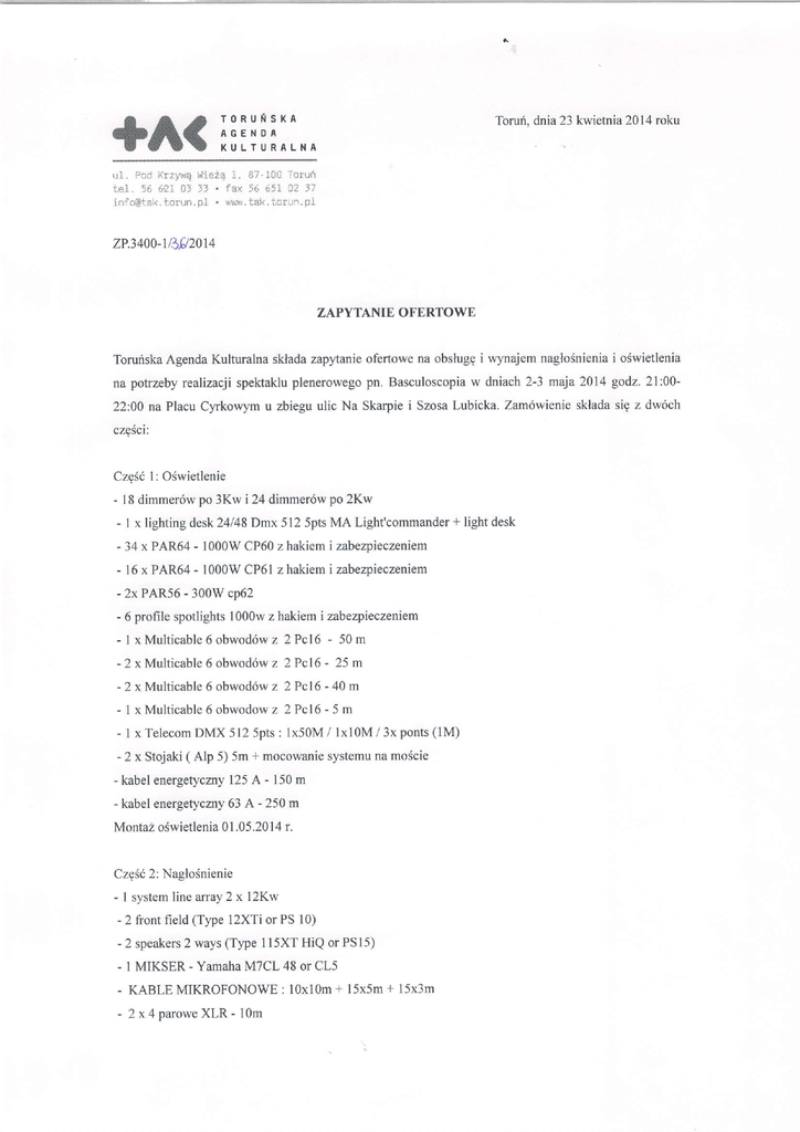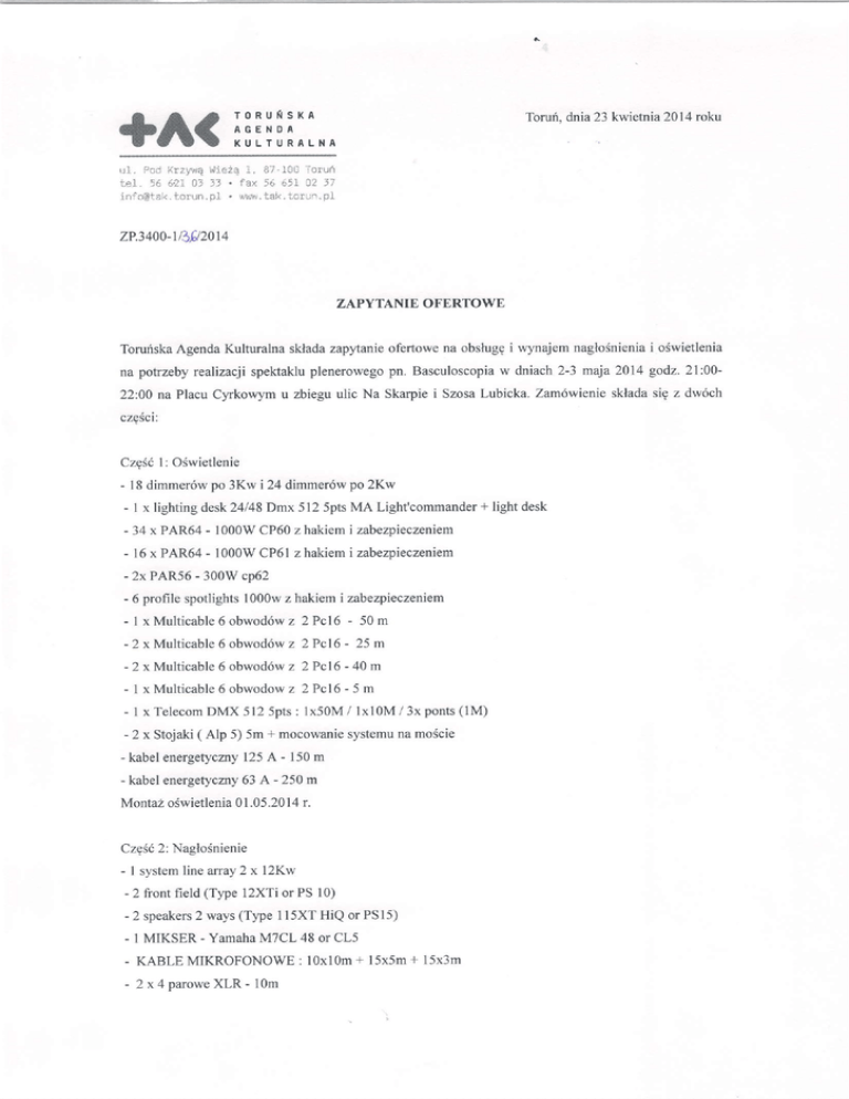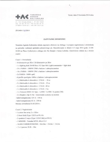 +A( r;iill::,.^ Toruri,dnia 23 kwietnia2014roku ,r1. ircd KrzyrQ ',lie2Q-r, 87 lolj loruli l-e]. 56 62:i Cj 3) , la/. ,6 651 02 Ji i n : c @ t a ki .o r ! ' 1 .p i , u u r * . t a i t. o r J r , p l zP.34oo-v3p2or4 ZAPYTANIE OFERTOWE ToruriskaAgendaKulturalna skladazapytanieofertowena obsluggi wynajemnaglo5nieniai o6wietlenia pn. Basculoscopia w dniach2-3 maja2014 godz 2l:00na potrzebyrealizacjispekakluplenerowego 22:00na PlacuCyrkowymu zbieguulic Na Skarpiei SzosaLubicka.Zam6wienieskladasig z dw6ch czgSci: Czg561: O6wietlenie - l8 dimrner6wpo 3Kw i 24 dimmer6wpo 2Kw - I x lightingdesk24l48Dmx5l2 5ptsMA Light'commander + light desk - 34 x PAR64- 1000WCP60z hakiemi zabezpieczeniem - 16 x PAR64 - 1000WCP6l zhakiem i zabezpieczeniem - 2x PAR56- 300Wcp62 - 6 profile spotlights1000wz hakiemi zabe4ieczeniem - l x Multicable z 2Pcl6 - 50m 6 obwod6w -2xMulticable6 o b w o d 6 zw 2 P c l 6 - 2 5 m - 2 x Multicable6 obwod6wz 2 Pcl6 - 40 m - I x Multicable 6 obwodowz 2Pc16-5m - 1 x Telecom DMX 5125pts: lx50M / lxl0M / 3x ponts(1M) - 2 x Stojaki( Alp 5) 5m + mocowanie systemuna moscie - kabelenergetyczny 125A - 150m - kabelenergetycmy 63 A - 250m 01.05.2014 r. MontazoSwietlenia Czg6i2: NagloSnienie - 1 systemline array2 x l2Kw - 2 front field (T1pe12XTior PS 10) - 2 speakers 2 ways(Type115XTHiQ or PSl5) - 1 MIKSER- YamahaMTCL 48 or CL5 - KABLE MIKROFONOWE: 10xl0m+ 15x5m+ 15x3m - 2 x 4 p a r o w e X L R -1 0 m - I x long of20 m Harting - I x long of 30 m Harting - 2 x stagebox 40in/oul Harting - 1 x eclatedconsole30 in/ l0 out - 1 x Eq graphique2x31 bandes Monta2dZwigku0 I .05.2014r . Wykonawcadopuszczaskladanieofert czg6ciovrychonz uzycia sprzgtur6u'nowainego.Przedstawiona czgScizam6wienia" ofertama zawiera6calkowity kosztrealizacji brutto poszczeg6lnych Platnosd:przelewemna podstawiefaktury z l4-dniowym terminemplahoSci. Termin nasylaniaofert: do 25 kwieffria(pi4tek)do goclz.:12:00. Kryterium wyboru oferty: cena100%. Spos6bskladania ofert: pocz4 elektroniczr4na adres:[email protected]. DodatkorrTchinformacji udziela:WojciechUlatowski,tel.:605 348259- IJyic xr.or T o r u i s k i e iA g e n d l K r r l t u r a l n e . xrystiffi,ncrvt<. / t L_/