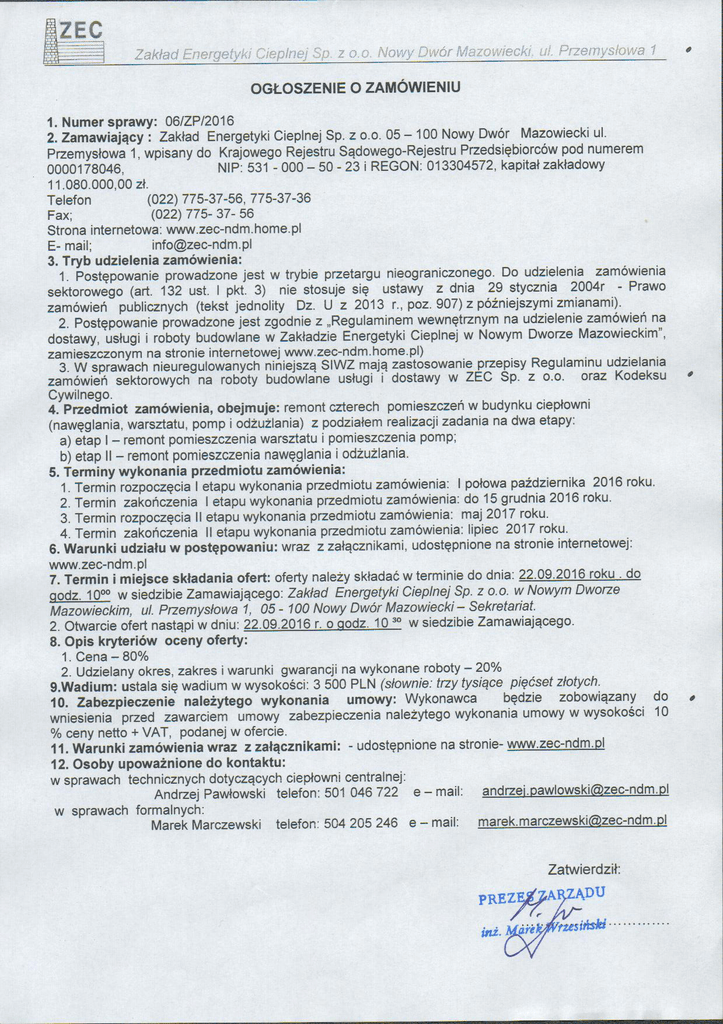 ip 111^".—-^Fj Zakład Energetyki Cieplnej Sp. z o.o. Nowy Dwór Mazowiecki, ul. Przemysłowa 1 OGŁOSZENIE O ZAMÓWIENIU 1.Numer sprawy: 06/ZP/2016 2.Zamawiający : Zakład Energetyki Cieplnej Sp. z o.o. 05 - 100 Nowy Dwór Mazowiecki ul. Przemysłowa 1, wpisany do Krajowego Rejestru Sądowego-Rejestru Przedsiębiorców pod numerem 0000178046,NIP: 531 - 000 - 50 - 23 i REGON: 013304572, kapitał zakładowy 11.080.000,00 zł. Telefon(022) 775-37-56, 775-37-36 Fax;(022) 775- 37- 56 Strona intemetowa: www.zec-ndm.home.pl E- maił;[email protected] 3.Tryb udzielenia zamówienia: 1.Postępowanie prowadzone jest w trybie przetargu nieograniczonego. Do udzielenia zamówienia sektorowego (art. 132 ust. I pkt. 3) nie stosuje się ustawy z dnia 29 stycznia 2004r - Prawo zamówień publicznych (tekst jednolity Dz. U z 2013 r., poz. 907) z późniejszymi zmianami). 2.Postępowanie prowadzone jest zgodnie z „Regulaminem wewnętrznym na udzielenie zamówień na dostawy, usługi i roboty budowlane w Zakładzie Energetyki Cieplnej w Nowym Dworze Mazowieckim", zamieszczonym na stronie internetowej www.zec-ndm.home.pl) 3.W sprawach nieuregulowanych niniejszą SIWZ mają zastosowanie przepisy Regulaminu udzielania zamówień sektorowych na roboty budowlane usługi i dostawy w ZEC Sp. z o.o. oraz Kodeksu Cywilnego. 4.Przedmiot zamówienia, obejmuje: remont czterech pomieszczeń w budynku ciepłowni (nawęglania, warsztatu, pomp i odżużlania) z podziałem realizacji zadania na dwa etapy: a)etap I - remont pomieszczenia warsztatu i pomieszczenia pomp; b)etap II - remont pomieszczenia nawęglania i odżużlania. 5.Terminy wykonania przedmiotu zamówienia: 1.Termin rozpoczęcia I etapu wykonania przedmiotu zamówienia: I połowa października 2016 roku. 2.Termin zakończenia I etapu wykonania przedmiotu zamówienia: do 15 grudnia 2016 roku. 3.Termin rozpoczęcia II etapu wykonania przedmiotu zamówienia: maj 2017 roku. 4.Termin zakończenia II etapu wykonania przedmiotu zamówienia: lipiec 2017 roku. 6.Warunki udziału w postępowaniu: wraz z załącznikami, udostępnione na stronie internetowej: www.zec-ndm.pl 7.Termin i miejsce składania ofert: oferty należy składać w terminie do dnia: 22.09.2016 roku . do godz. 10 w siedzibie Zamawiającego: Zakład Energetyki Cieplnej Sp. z o.o. w Nowym Dworze Mazowieckim, ul. Przemysłowa 1, 05-100 Nowy Dwór Mazowiecki - Sekretariat. 2. Otwarcie ofert nastąpi w dniu: 22.09.2016 r. o godz. 103" w siedzibie Zamawiającego. 8.Opis kryteriów oceny oferty: 1.Cena-80% 2.Udzielany okres, zakres i warunki gwarancji na wykonane roboty - 20% 9.Wadium: ustala się wadium w wysokości: 3 500 PLN (słownie: trzy tysiące pięćset złotych. 10.Zabezpieczenie należytego wykonania umowy: Wykonawca będzie zobowiązany do wniesienia przed zawarciem umowy zabezpieczenia należytego wykonania umowy w wysokości 10 % ceny netto + VAT, podanej w ofercie. 11.Warunki zamówienia wraz z załącznikami: - udostępnione na stronie-www.zec-ndm.pl 12.Osoby upoważnione do kontaktu: w sprawach technicznych dotyczących ciepłowni centralnej: Andrzej Pawłowski telefon: 501 046 722 e-mail: w sprawach formalnych: Marek Marczewski telefon: 504 205 246 e - maił: andrzei.pawlowskitSjzec-ndm.pl marek.marczewskitS3zec-ndm.pl Zatwierdził:
