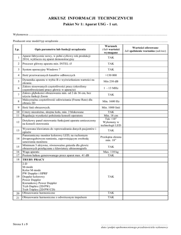 ARKUSZ INFORMACJI TECHNICZNYCH Pakiet Nr 1: Aparat USG - 1 szt. Wykonawca ...................................................................................................................................................................................... Producent oraz model/typ urządzenia ............................................................................................................................................... Opis parametru lub funkcji urządzenia Lp. Warunek i/lub wartości wymagane 1 Aparat fabrycznie nowy, w pełni cyfrowy rok produkcji 2014, wyklucza się aparat demonstracyjny TAK 2 Procesor główny aparatu min. INTEL-i5 TAK 3 System operacyjny Windows 7 TAK 4 Ilość przetwarzanych kanałów odbiorczych 5 6 7 8 9 Dynamika aparatu w trybie B z wyświetlaniem wartości na ekranie. Zakres stosowanych częstotliwości pracy (określony częstotliwościami pracy głowic w aparacie) Zakres głębokości obrazowania min. od 2 do 36 cm, bez użycia funkcji Zoom Maksymalna częstotliwość odświeżania (Frame Rate) dla obrazu 2D Ilość linii obrazowych. 10 11 Cztery niezależne, skrętne koła, min. 2 blokowane Regulacja wysokości położenia konsoli operatora 12 Dotykowy panel sterowania funkcjami aparatu umieszczony na konsoli sterowania 16 17 Wysuwana klawiatura do wprowadzania danych pacjentów i opisów Panoramiczny monitor kolorowy LED, na ruchomym dwuprzegubowym ramieniu, zapewniającym swobodę ustawienia monitora Minimum 3 aktywne, równoważne gniazda dla głowic obrazowych przełączane z klawiatury ultrasonografu Waga aparatu Poziom hałasu generowanego przez aparat max. 41 dB 18 TRYBY PRACY 13 14 15 20 2-D M-mode Kolor M-mode PW Doppler i HPRF Doppler kolorowy Power Doppler Kierunkowy Power Doppler Tryb Duplex (2D/PW) Tryb Triplex (2D/PW/CD) Obrazowanie harmoniczne 21 Obrazowanie harmoniczne z odwróconym impulsem 19 Strona 1 z 5 Wartości oferowane lub spełnienie warunku (tak/nie) >130 000 Min 230 dB 1 - 13 MHz TAK Min. 1600 Hz Min. 1000 linii TAK Min. 18 cm Tak >10” Wykonany w technologii LED TAK Przekątna ekranu min. 18” TAK Max. 110 kg TAK TAK TAK TAK .................................................................................................. data i podpis upełnomocnionego przedstawiciela wykonawcy Opis parametru lub funkcji urządzenia Lp. Warunek i/lub wartości wymagane TAK 22 Tryb M 23 Tryb M z kolorowym Dopplerem TAK 24 Tryb Dopplera Fali Pulsacyjnej TAK 25 Szerokość bramki Dopplera PW Min. 0,5-15 mm 27 Automatyczna optymalizacja obrazu PW przy pomocy jednego klawisza (m.in. automatyczne dopasowanie linii bazowej oraz skali) Regulacja uchylności (Steer) wiązki Dopplera min. +/-300 28 Tryb Dopplera Kolorowego 26 29 30 Maksymalna prędkość przepływu (skala) wybarwiana (możliwa do ustawienia) w trybie kolorowego Dopplera Automatyczna optymalizacja obrazu Power Dopplera TAK TAK TAK Min. 4,5 m/s TAK 35 Możliwość zmiany szerokości wyświetlanego obrazu 2D (B-Mode) Cyfrowa regulacja wzmocnienia głębokościowego wiązki TGC – minimum 8 stref Tryb Dual Live – tzw. jednoczesne wyświetlanie na ekranie dwóch obrazów w czasie rzeczywistym typu B+B/CD Automatyczna optymalizacja parametrów obrazu 2D (min. TGC, gain) do aktualnie badanego obszaru przy pomocy jednego klawisza Możliwość obracania obrazu lewo-prawo, góra-dół 36 Powiększenie obrazu zamrożonego min. 8x min. 8x 38 Powiększenie bez straty rozdzielczości obrazu w czasie rzeczywistym Obrazowanie Trapezoidalne w trybie B 39 Obrazowanie skośne - rombowe w trybie B TAK Cyfrowa regulacja wzmocnienia strefowego TGC z możliwością zapisania przynajmniej 3 ustawień Możliwość rozbudowy o zintegrowany z aparatem podgrzewacz żelu TAK 31 32 33 34 37 40 41 42 43 44 45 46 Oprogramowanie do wygładzenia oraz wykontrastowania obrazu i uzyskania obrazu zbliżonego do obrazów MR (np. Sono MR) – działające na wszystkich oferowanych sondach Możliwość rozbudowy na dzień składania ofert o pracę w trybie wielokierunkowego nadawania i odbierania wiązki, minimum 7 kątów Możliwość rozbudowy na dzień składania ofert o oprogramowanie do automatycznego pomiaru NT i IT Możliwość rozbudowy o na dzień składania ofert obrazowanie 3D i 4D z głowic objętościowych (wolumetrycznych) typu convex i microconvex Możliwość rozbudowy na dzień składania ofert o obrazowanie tomograficzne na obrazie żywym i zamrożonym w trybie 3D/4D z możliwością wyświetlenia minimum 9 równoległych warstw Strona 2 z 5 Wartości oferowane lub spełnienie warunku (tak/nie) TAK TAK TAK TAK TAK TAK Możliwość rozbudowy TAK TAK opisać Możliwość rozbudowy TAK Możliwość rozbudowy TAK Możliwość rozbudowy TAK Możliwość rozbudowy TAK .................................................................................................. data i podpis upełnomocnionego przedstawiciela wykonawcy Opis parametru lub funkcji urządzenia Lp. 47 48 49 50 51 52 Możliwość rozbudowy na dzień składania ofert o obrazowanie, które pozwala na uzyskanie dowolnej płaskiej płaszczyzny z zeskanowanej bryły poprzez cięcie wybranej płaszczyzny odniesienia linią prostą i krzywą Możliwość rozbudowy na dzień składania ofert o oprogramowanie do przesyłania obrazów i danych zgodnych z standardem DICOM 3 (Dicom send, Dicom, Print, Modality Worklist) Możliwość rozbudowy na dzień składania ofert o głowicę microconvex, zakres częstotliwości min. 4-9MHz, Min. 128 elementów, kąt widzenia max. 100 stopni Możliwość rozbudowy na dzień składania ofert o głowicę kardiologiczną, zakres częstotliwości min. 2-4MHz Min. 80 elementów, kąt widzenia min. 90 stopni Możliwość rozbudowy na dzień składania ofert o głowicę kardiologiczną, zakres częstotliwości min. 3-8MHz Min. 64 elementów, kąt widzenia min. 90 stopni Możliwość rozbudowy na dzień składania ofert o pakiet kardiologiczny z ciągłym Dopplerem i pakietem pomiarowym oraz głowicą typu phased a