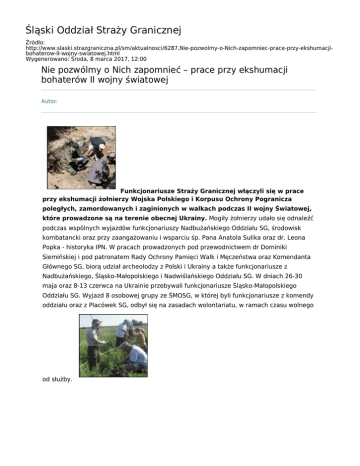 Śląski Oddział Straży Granicznej Źródło: http://www.slaski.strazgraniczna.pl/sm/aktualnosci/6287,Nie-pozwolmy-o-Nich-zapomniec-prace-przy-ekshumacjibohaterow-II-wojny-swiatowej.html Wygenerowano: Środa, 8 marca 2017, 12:00 Nie pozwólmy o Nich zapomnieć – prace przy ekshumacji bohaterów II wojny światowej Autor: Funkcjonariusze Straży Granicznej włączyli się w prace przy ekshumacji żołnierzy Wojska Polskiego i Korpusu Ochrony Pogranicza poległych, zamordowanych i zaginionych w walkach podczas II wojny Światowej, które prowadzone są na terenie obecnej Ukrainy. Mogiły żołnierzy udało się odnaleźć podczas wspólnych wyjazdów funkcjonariuszy Nadbużańskiego Oddziału SG, środowisk kombatancki oraz przy zaangażowaniu i wsparciu śp. Pana Anatola Sulika oraz dr. Leona Popka - historyka IPN. W pracach prowadzonych pod przewodnictwem dr Dominiki Siemińskiej i pod patronatem Rady Ochrony Pamięci Walk i Męczeństwa oraz Komendanta Głównego SG, biorą udział archeolodzy z Polski i Ukrainy a także funkcjonariusze z Nadbużańskiego, Śląsko-Małopolskiego i Nadwiślańskiego Oddziału SG. W dniach 26-30 maja oraz 8-13 czerwca na Ukrainie przebywali funkcjonariusze Śląsko-Małopolskiego Oddziału SG. Wyjazd 8 osobowej grupy ze ŚMOSG, w której byli funkcjonariusze z komendy oddziału oraz z Placówek SG, odbył się na zasadach wolontariatu, w ramach czasu wolnego od służby.