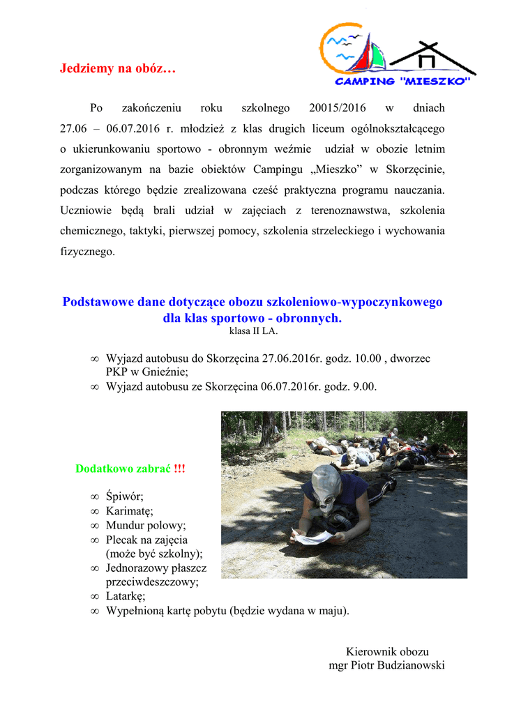 Jedziemy na obóz… Po zakończeniu roku szkolnego 20015/2016 w dniach 27.06 – 06.07.2016 r. młodzież z klas drugich liceum ogólnokształcącego o ukierunkowaniu sportowo - obronnym weźmie udział w obozie letnim zorganizowanym na bazie obiektów Campingu „Mieszko” w Skorzęcinie, podczas którego będzie zrealizowana cześć praktyczna programu nauczania. Uczniowie będą brali udział w zajęciach z terenoznawstwa, szkolenia chemicznego, taktyki, pierwszej pomocy, szkolenia strzeleckiego i wychowania fizycznego. Podstawowe dane dotyczące obozu szkoleniowo-wypoczynkowego dla klas sportowo - obronnych. klasa II LA. • Wyjazd autobusu do Skorzęcina 27.06.2016r. godz. 10.00 , dworzec PKP w Gnieźnie; • Wyjazd autobusu ze Skorzęcina 06.07.2016r. godz. 9.00. Dodatkowo zabrać !!! • • • • Śpiwór; Karimatę; Mundur polowy; Plecak na zajęcia (może być szkolny); • Jednorazowy płaszcz przeciwdeszczowy; • Latarkę; • Wypełnioną kartę pobytu (będzie wydana w maju). Kierownik obozu mgr Piotr Budzianowski