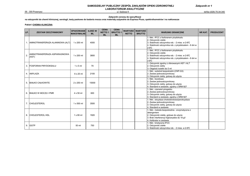 SAMODZIELNY PUBLICZNY ZESPÓŁ ZAKŁADÓW OPIEKI ZDROWOTNEJ LABORATORIUM ANALITYCZNE 06 - 300 Przasnysz Załącznik nr 1 ul. Sadowa 9 tel/fax (029) 75-34-340 Załącznik cenowy do specyfikacji na odczynniki do chemii klinicznej, serologii, testy paskowe do badania moczu oraz materiały zużywalne do Expresa Plusa, spektrofoometrów i na nakłuwacze Pakiet I CHEMIA KLINICZNA LP. ZESTAW ODCZYNNIKOWY 1. AMINOTRANSFERAZA ALANINOWA (ALT) OPAKOWANIE MAKSYMALNE ILOŚĆ W ML 1 x 200 ml 4000 1 x 200 ml 3800 3. FOSFORAN PIRYDOKSALU 1 x 5 ml 70 4. AMYLAZA 6 x 25 ml 2100 5. BIAŁKO CAŁKOWITE 2 x 250 ml 15000 6. BIAŁKO W MOCZU I PMR 4 x 50 ml 600 7. CHOLESTEROL 1 x 500 ml 3500 8. CHOLESTEROL HDL 1 x 80 ml 1920 50 ml 750 2. AMINOTRANSFERAZA ASPARAGINOWA (AST) 9. GGTP CENA NETTO 1 ML CENA WARTOŚĆ WARTOŚĆ BRUTTO 1 NETTO BRUTTO ML WARUNKI GRANICZNE 1. Met.: IFCC z fosforanem pirydoksalu 2. Odczynniki ciekłe 3. Stabilność odczynnika rob. - 2 mies. w 2-8°C 4. Stabilność odczynnika rob. z pirydoksalem - 6 dni w 2-8°C 1. Met.: IFCC z fosforanem pirydoksalu 2. Odczynniki ciekłe 3. Stabilność odczynnika rob. - 2 mies. w 2-8°C 4. Stabilność odczynnika rob. z pirydoksalem - 6 dni w 2-8°C 1. Odczynnik zgodny z oferowanymi AST i ALT 2. Odczynnik ciekły 3. Objętość butelki do 5 ml 1. Met.: substrat bezpośredni (CNP-G3) 2. Zestaw jednoodczynnikowy 3. Odczynnik ciekły, gotowy do użycia 1. Met.: biuretowa 2. Zestaw jednoodczynnikowy 3. Odczynnik ciekły, gotowy do użycia 4. Standard w zestawie, zgodny z SRM 927 1. Met.: czerwień pirogalolu 2. Zestaw jednoodczynnikowy 3. Odczynnik ciekły, gotowy do użycia 4. Standard w zestawie, zgodny z SRM 927 1. Met.: oksydaza cholesterolowa/peroksydaza 2. Zestaw jednoodczynnikowy 3. Odczynnik ciekły, gotowy do użycia 4. Standard w zestawie 1. Met.: metoda bezpośrednia - enzymatyczna z detergentem 2. Odczynniki ciekłe, gotowe do użycia 3. Brak interferencji triglicerydów do 18 g/l 4. Kalibrator w zestawie 1. Met.: kinetyczna IFCC 2. Odczynniki ciekłe 3. Stabilność odczynnika rob. - 2 mies. w 2-8°C NR KAT. PRODUCENT SAMODZIELNY PUBLICZNY ZESPÓŁ ZAKŁADÓW OPIEKI ZDROWOTNEJ LABORATORIUM ANALITYCZNE 06 - 300 Przasnysz ul. Sadowa 9 Załącznik nr 1 tel/fax (029) 75-34-340 Załącznik cenowy do specyfikacji na odczynniki do chemii klinicznej, serologii, testy paskowe do badania moczu oraz materiały zużywalne do Expresa Plusa, spektrofoometrów i na nakłuwacze Pakiet I CHEMIA KLINICZNA OPAKOWANIE MAKSYMALNE ILOŚĆ W ML 500 ml 6500 11. CK /KINAZA KREATYNOWA/ 10 x 15 ml 900 12. CK-MB KINAZA KREATYNOWA MB 10 x 10 ml 1100 13. KREATYNINA 1 x 1000 ml 5000 14. KWAS MOCZOWY 1 x 200 ml 1200 15. MAGNEZ 4 x 50 ml 1000 16. MOCZNIK/BUN UV 2 x 250 ml 7000 17. TRIGLICERYDY 4 x 50 ml 2800 18. WAPŃ ARSENAZO 1 x 200 ml 1600 19. ŻELAZO 4 x 50 ml 2800 1 x 50 ozn. 100 LP. ZESTAW ODCZYNNIKOWY 10. GLUKOZA 20. ZDOLNOŚĆ WIĄZANIA ŻELAZA CENA NETTO 1 ML CENA WARTOŚĆ WARTOŚĆ BRUTTO 1 NETTO BRUTTO ML WARUNKI GRANICZNE 1. Met.: oksydaza glukozowa/peroksydaza 2. Odczynnik ciekły, gotowy do użycia 3. Standard w zestawie 1. Met.: IFCC 2. Stabilność odczynnika rob. - 15 dni w 2-8°C 1. Met.: immunoinhibicja 2. Stabilność odczynnika rob. - 15 dni w 2-8°C 1. Met.: pikrynian alkaliczny 2. Odczynniki ciekłe 3. Stabilność odczynnika rob. - 1 mies. w 2-8°C 4. Standard w zestawie 1. Met.: urykaza/peroksydaza 2. Zestaw jednoodczynnikowy 3. Odczynnik ciekły, gotowy do użycia 4. Standard w zestawie 1. Met.: kalmagit 2. Zestaw jednoodczynnikowy 3. Odczynnik ciekły, gotowy do użycia 4. Standard w zestawie 1. Met.: ureaza/dehydrogenaza glutaminianowa 2. Odczynniki ciekłe 3. Stabilność odczynnika rob. - 2 mies. w 2-8°C 4. Standard w zestawie 1. Met.: oksydaza glicerofosforanu/peroksydaza 2. Zestaw jednoodczynnikowy 3. Odczynnik ciekły, gotowy do użycia 4. Standard w zestawie 1. Met.: arsenazo III 2. Zestaw jednoodczynnikowy 3. Odczynnik ciekły, gotowy do użycia 4. Standard w zestawie 1. Met.: ferrozyna 2. Odczynniki ciekłe 3. Stabilność odczynnika rob. - 6 mies. w 2-8°C 4. Standard w zestawie, zgodny z SRM 937 1. Met.: węglan wodorotlenku magnezu 2. Zestaw wymagający żelaza z ferrozyną NR KAT. PRODUCENT SAMODZIELNY PUBLICZNY ZESPÓŁ ZAKŁADÓW OPIEKI ZDROWOTNEJ LABORATORIUM ANALITYCZNE 06 - 300 Przasnysz Załącznik nr 1 ul. Sadowa 9 tel/fax (029) 75-34-340 Załącznik cenowy do specyfikacji na odczynniki do chemii klinicznej, serologii, testy paskowe do badania moczu oraz materiały zużywalne do Expresa Plusa, spektrofoometrów i na nakłuwacze Pakiet I CHEMIA KLINICZNA LP. ZESTAW ODCZYNNIKOWY OPAKOWANIE MAKSYMALNE ILOŚĆ W ML CENA NETTO 1 ML CENA WARTOŚĆ WARTOŚĆ BRUTTO 1 NETTO BRUTTO ML WARUNKI GRANICZNE 21. MULTIKALIBRATOR 5 x 5 ml 175 1. Multikalibrator do parametrów biochemicznych 2. Podane wartości kalibracyjne dla wszystkich wymaganych metod (za wyjątkiem HDL/LDL, CK MB). 3. Wartości kalibracyjne odniesione do dostępnych materiałów referencyjnych wyższego rzędu. 4. Wartości enzymów muszą być odniesione do najnowszych dostępnych materiałów referencyjnych Komisji Enzymatycznej IFCC 22. SUROWICA KONTROLNA - POZIOM I 5 x 5 ml 150 1. Surowica kontrolna biochemiczna - poziom normalny 2. Podane wartości kontrolne dla wszystkich wymaganych metod (za wyjątkiem HDL/LDL, CK MB). 23. SUROWICA KONTROLNA - POZIOM II 5 x 5 ml 150 1. Surowica kontrolna biochemiczna - poziom patologiczny 2. Podane wartości kontrolne dla wszystkich wymaganych metod (za wyjątkiem HDL/LDL, CK MB). 24. SUROWICA LIPIDOWA - POZIOM I 3 x 1 ml 3 25. SUROWICA LIPIDOWA - POZIOM II 26. SUROWICA KONTROLNA - CK-MB, CK 3 x 1 ml 1 x 0,5 ml RAZEM 3 2 1. Surowica kontrolna do cholesterolu HDL, LDL poziom normalny 1. Surowica kontrolna do cholesterolu HDL, LDL poziom normalny 1. Surowica kontrolna do CK i CK-MB WARUNKI DODATKOWE 1 Wyroby muszą bezwzględnie spełniać wszystkie wymagania ustawy o wyrobach medycznych z dnia 20 kwietnia 2004r. (Dz.U. z 2004 r. Nr 93, 