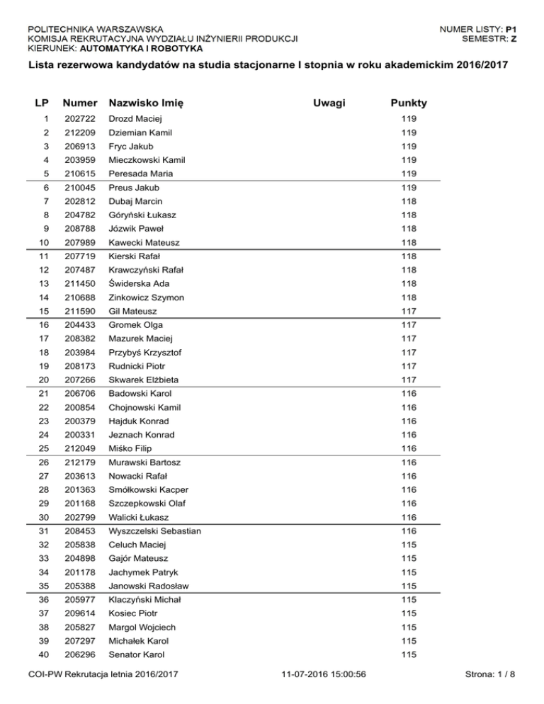 Lista rezerwowa kandydatów na studia stacjonarne I stopnia w roku akademickim 2016/2017 LP Numer Nazwisko Imię 1 202722 Drozd Maciej 119 2 212209 Dziemian Kamil 119 3 206913 Fryc Jakub 119 4 203959 Mieczkowski Kamil 119 5 210615 Peresada Maria 119 6 210045 Preus Jakub 119 7 202812 Dubaj Marcin 118 8 204782 Góryński Łukasz 118 9 208788 Józwik Paweł 118 10 207989 Kawecki Mateusz 118 11 207719 Kierski Rafał 118 12 207487 Krawczyński Rafał 118 13 211450 Świderska Ada 118 14 210688 Zinkowicz Szymon 118 15 211590 Gil Mateusz 117 16 204433 Gromek Olga 117 17 208382 Mazurek Maciej 117 18 203984 Przybyś Krzysztof 117 19 208173 Rudnicki Piotr 117 20 207266 Skwarek Elżbieta 117 21 206706 Badowski Karol 116 22 200854 Chojnowski Kamil 116 23 200379 Hajduk Konrad 116 24 200331 Jeznach Konrad 116 25 212049 Miśko Filip 116 26 212179 Murawski Bartosz 116 27 203613 Nowacki Rafał 116 28 201363 Smółkowski Kacper 116 29 201168 Szczepkowski Olaf 116 30 202799 Walicki Łukasz 116 31 208453 Wyszczelski Sebastian 116 32 205838 Celuch Maciej 115 33 204898 Gajór Mateusz 115 34 201178 Jachymek Patryk 115 35 205388 Janowski Radosław 115 36 205977 Klaczyński Michał 115 37 209614 Kosiec Piotr 115 38 205827 Margol Wojciech 115 39 207297 Michałek Karol 115 40 206296 Senator Karol 115 COI-PW Rekrutacja letnia 2016/2017 Uwagi 11-07-2016 15:00:56 Punkty Strona: 1 / 8 Lista rezerwowa kandydatów na studia stacjonarne I stopnia w roku akademickim 2016/2017 LP Numer Nazwisko Imię 41 210258 Sójka Robert 115 42 207301 Starczewski Paweł 115 43 206421 Wieczorek Marcin 115 44 211180 Kochan Dawid 114 45 207251 Krupa Michał 114 46 201292 Zapendowski Bartosz 114 47 200435 Ciesielska Żaneta 113 48 211782 Lewandowski Mikołaj 113 49 210089 Nowak Filip 113 50 209168 Orłowska Natalia 113 51 206179 Skalski Jakub 113 52 210130 Woźniak Karol 113 53 200562 Ignaczak Filip 112 54 210346 Kapusta Jakub 112 55 201869 Kord Rafał 112 56 204846 Lipowiecka Anna 112 57 204780 Osial Paweł 112 58 204114 Rokosz Alicja 112 59 210373 Tutaj Bartosz 112 60 209737 Wawrzaszek Kamil 112 61 203349 Bogut Adam 111 62 207469 Chmieliński Filip 111 63 206059 Dziedzic Marcin 111 64 208646 Pochrebiennik Krzysztof 111 65 209224 Sobczyk Aleksandra 111 66 205439 Tomaszewski Aleksander 111 67 206958 Czarnowski Hubert 110 68 208531 Kołomański Jakub 110 69 201664 Kuczyński Karol 110 70 209683 Rawa-Grabowiecki Bartosz 110 71 206541 Rezulski Tomasz 110 72 205544 Brzozowski Maciej 109 73 207626 Dąbrowska Agata 109 74 204687 Dziurzyński Konrad 109 75 211453 Fejfer Mateusz 109 76 210866 Iwanek Hubert 109 77 200368 Jagielska Monika 109 78 202598 Jarząbek Grzegorz 109 79 202876 Kormański Mateusz 109 80 210172 Kosieradzki Sebastian 109 COI-PW Rekrutacja letnia 2016/2017 Uwagi 11-07-2016 15:00:56 Punkty Strona: 2 / 8 Lista rezerwowa kandydatów na studia stacjonarne I stopnia w roku akademickim 2016/2017 LP Numer Nazwisko Imię 81 202683 Mierzwiński Maciej 109 82 209659 Ornowski Łukasz 109 83 204068 Rodak Mateusz 109 84 201835 Sanowski Eryk 109 85 204837 Sprysak Bartłomiej 109 86 208612 Szelągowski Piotr 109 87 200261 Szewczak Marcin 109 88 201881 Chybciński Emil 108 89 200951 Pawłowski Norbert 108 90 209016 Posłuszny Kinga 108 91 202127 Tylus Michał 108 92 201982 Żbikowski Hubert 108 93 208627 ANDRYSZCZYK MICHAŁ 107 94 205669 Gajewski Robert 107 95 207965 Jabłoński Jakub 107 96 206943 Kozera Łukasz 107 97 207040 Kozłowski Piotr 107 98 206278 Krupiński Maciej 107 99 201575 Mąkosa Mariusz 107 100 210805 Mielnicka Aleksandra 107 101 211308 Przybysz Jarosław 107 102 207680 Rewers Franciszek 107 103 206241 Zając Krzysztof 107 104 210016 Załęcki Dawid 107 105 209533 Barański Dawid 106 106 200098 Dąbrowski Jakub 106 107 205543 Dzięgielewski Jędrzej 106 108 203477 Grzędowski Jakub 106 109 205318 Kaczmarczyk Maciej 106 110 208493 Kwiatek Michał 106 111 205270 Niezgoda Łukasz 106 112 204260 Pawłowski Jakub 106 113 205139 Krzysztofik Michał 105 114 205510 Kulas Daniel 105 115 204186 Piejka Bartłomiej 105 116 210370 Gołąb Maciej 104 117 204475 Jaciubek Mateusz 104 118 204964 Lipiński Filip 104 119 203915 Lubiecka Iga 104 120 205875 Łoś Agata 104 COI-PW Rekrutacja letnia 2016/2017 Uwagi 11-07-2016 15:00:56 Punkty Strona: 3 / 8 Lista rezerwowa kandydatów na studia stacjonarne I stopnia w roku akademickim 2016/2017 LP Numer Nazwisko Imię 121 206289 Łukaszczyk Bartosz 104 122 205680 Tworkowski Adrian 104 123 208829 Zapała Michał 104 124 204793 Charyton Albert 103 125 205886 Goś Daniel 103 126 208615 Kamiński Emil 103 127 211731 Klimek Adrian 103 128 206422 Komarek Jakub 103 129 204889 Kossowski Andrzej 103 130 210110 Makarewicz Katarzyna 103 131 211444 Migoń Ida 103 132 204098 Skreczko Łukasz 103 133 207393 Snakowska Karolina 103 134 205256 Sobieszek Sebastian 103 135 209888 Sobota Karol 103 136 210291 Sowa Marcin 103 137 200767 Szczytowski Kacper 103 138 208165 Szota Jakub 103 139 208128 Górka Dawid 102 140 201136 Hartliński Mateusz 102 141 200353 Pazurek Przemysław 102 142 205888 Piotrowski Jan 102 143 209560 Plona Patryk 102 144 208010 Powała Filip 102 145 207169 Pycka Maksymilian 102 146 203971 Żbikowski Bartosz 102 147 200855 Pałka Jakub 101 148 210456 Skiba Tomasz 101 149 209628 Zadrożny Kamil 101 150 211658 Grabiński Michał 100 151 204679 Grobelny Hubert 100 152 207568 Jakóbowski Piotr 100 153 205731 Lenets Anhelina 154 211227 Sztyler Eliza 100 155 210012 Waszczak Maciej 100 156 211814 Zdybski Jacek 100 157 206460 Bryke Maciej 99 158 207041 Danilczyk Hubert 99 159 202235 Domański Karol 160 206375 Gralewicz Łukasz COI-PW Rekrutacja letnia 2016/2017 Uwagi KP,OM OL Punkty 100 99 99 11-07-2016 15:00:56 Strona: 4 / 8 Lista rezerwowa kandydatów na studia stacjonarne I stopnia w roku akademickim 2016/2017 LP Numer Nazwisko Imię 161 206600 Hetman Arkadiusz 99 162 203731 Malec Patryk 99 163 211853 Michalski Michał 99 164 200372 Ruszczyk Rafał 99 165 208973 Bałdyga Patrycja 98 166 210079 Binduga Karol 9
