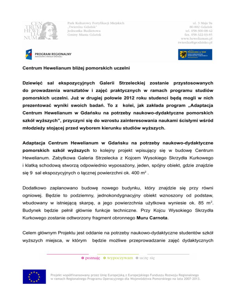 Centrum Hewelianum bliżej pomorskich uczelni Dziewięć sal ekspozycyjnych Galerii Strzeleckiej zostanie przystosowanych do prowadzenia warsztatów i zajęć praktycznych w ramach programu studiów pomorskich uczelni. Już w drugiej połowie 2012 roku studenci będą mogli w nich prezentować wyniki swoich badań. To z kolei, jak zakłada program „Adaptacja Centrum Hewelianum w Gdańsku na potrzeby naukowo-dydaktyczne pomorskich szkół wyższych”, przyczyni się do wzrostu zainteresowania naukami ścisłymi wśród młodzieży stojącej przed wyborem kierunku studiów wyższych. Adaptacja Centrum Hewelianum w Gdańsku na potrzeby naukowo-dydaktyczne pomorskich szkół wyższych to kolejny projekt wpisujący się w budowę Centrum Hewelianum. Zabytkowa Galeria Strzelecka z Kojcem Wysokiego Skrzydła Kurkowego i klatką schodową stworzą odpowiednio wyposażony, jeden, spójny obiekt, gdzie znajdzie się 9 sal ekspozycyjnych o łącznej powierzchni ok. 400 m2 . Dodatkowo zaplanowano budowę nowego budynku, który znajdzie się przy równi ogniowej. Będzie to podziemny, jednokondygnacyjny obiekt wznoszony od podstaw, wbudowany w istniejącą skarpę, a jego powierzchnia użytkowa wyniesie ok. 85 m 2. Budynek będzie pełnił głównie funkcje techniczne. Przy Kojcu Wysokiego Skrzydła Kurkowego zostanie odtworzony fragment obronnego Muru Carnota. Celem głównym Projektu jest oddanie na potrzeby naukowo-dydaktyczne studentów szkół wyższych miejsca, w którym będzie możliwe przeprowadzanie zajęć dydaktycznych Projekt współfinansowany przez Unię Europejską z Europejskiego Funduszu Rozwoju Regionalnego w ramach Regionalnego Programu Operacyjnego dla Województwa Pomorskiego na lata 2007-2013. przy wykorzystaniu nowoczesnych form przekazu. W budynku Galerii Strzeleckiej planowane jest uruchomienie pracowni naukowo – dydaktycznej, poświęconej tematyce zjawisk i sytuacji związanych z ruchem. Poszczególne eksponaty pracowni będą w interaktywny sposób prezentowały różne przejawy ruchu w otaczającym nas świecie. Na stanowiskach wykorzystywane zostaną nowoczesne formy przekazu z zastosowaniem multimediów, technik elektronicznych i robotów. Całość ekspozycji uzupełni historyczny sprzęt naukowo – dydaktyczny Politechniki Gdańskiej. Partnerem merytorycznym Projektu jest Politechnika Gdańska. Szczegółowy i ostateczny projekt zagospodarowania i wyposażenia obiektu zostanie wyłoniony na podstawie konkursu skierowanego do studentów, którzy przy współpracy z kadrą naukową opracują koncepcje poszczególnych stanowisk na wystawie. Dzięki realizacji Projektu możliwe będzie popularyzowanie nauki połączone z wymianą wiedzy i doświadczenia, co przyczyni się do wzrostu zainteresowania naukami ścisłymi wśród młodzieży. Dodatkowo kadra naukowa będzie mogła zapoznać się z innowacyjnymi metodami nauczania i przekazywania wiedzy. W ramach Projektu odbędą się także szkolenia dla środowiska naukowo – dydaktycznego uczelni i placówek oświatowych Województwa Pomorskiego. Planowany termin zakończenia Projektu przewidziany jest na III kwartał 2012. Projekt współfinansowany przez Unię Europejską z Europejskiego Funduszu Rozwoju Regionalnego w ramach Regionalnego Programu Operacyjnego dla Województwa Pomorskiego na lata 2007-2013. Źródła finansowania Źródła finansowania Projektu pn. „Adaptacja Centrum Hewelianum w Gdańsku na potrzeby naukowo - dydaktyczne pomorskich szkół wyższych” Całkowity koszt realizacji Projektu: 5 773 831.00 w tym wydatki kwalifikowalne: 5 773 831.00 w tym wydatki niekwalifikowalne: 0.00 PLN Poziom współfinansowania Projektu ze środków EFRR (% 75.00% kosztów kwalifikowalnych): Kwota współfinansowania Projektu ze środków EFRR: 4 330 373.25 Poziom współfinansowania Projektu ze środków Gminy 25.00% Miasta Gdańska (% kosztów kwalifikowalnych): Kwota współfinansowania Projektu ze środków Gminy 1 443 457.75 Miasta Gdańska: PLN PLN PLN PLN Informacje dodatkowe Galeria Strzelecka jest budynkiem parterowym, wbudowanym w skarpę, z odsłoniętą wschodnią ścianą frontową i otworami strzelniczymi w szeregu komór usytuowanych w układzie amfiladowym. Jej powierzchnia użytkowa wynosi 402m2, a kubatura 2677m3. Beneficjentem Projektu jest Gmina Miasta Gdańska natomiast realizatorem jest Park Kulturowy Fortyfikacji Miejskich „Twierdza Gdańsk”. Projekt realizowany jest w ramach Regionalnego Programu Operacyjnego dla Województwa Pomorskiego na lata 2007-2013. Prace budowlane prowadzone są od 29 lipca 2010 przez Konsorcjum firm: Mostostal Warszawa S.A. i ACCiona Infraestructuras SA. Planowany termin zakończenia inwestycji przewidziany jest na III kwartał 2012 r. Projekt współfinansowany przez Unię Europejską z Europejskiego Funduszu Rozwoju Regionalnego w ramach Regionalnego Programu Operacyjnego dla Województwa Pomorskiego na lata 2007-2013.