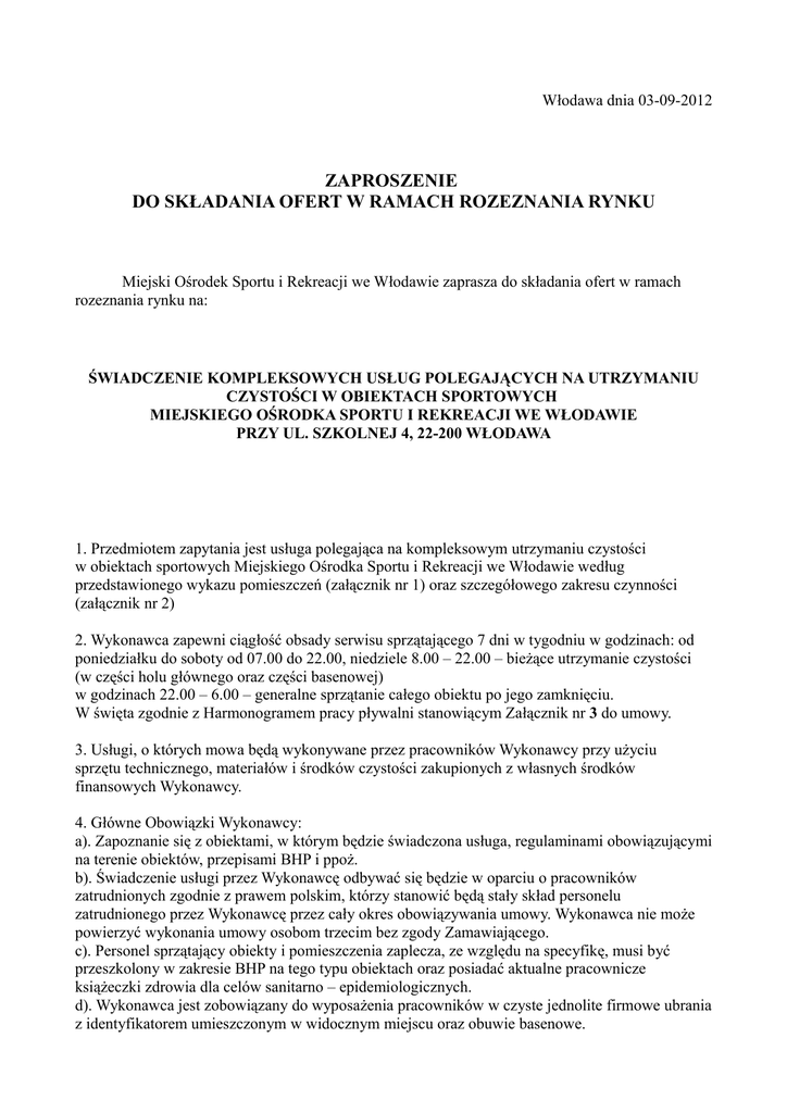 Włodawa dnia 03-09-2012 ZAPROSZENIE DO SKŁADANIA OFERT W RAMACH ROZEZNANIA RYNKU Miejski Ośrodek Sportu i Rekreacji we Włodawie zaprasza do składania ofert w ramach rozeznania rynku na: ŚWIADCZENIE KOMPLEKSOWYCH USŁUG POLEGAJĄCYCH NA UTRZYMANIU CZYSTOŚCI W OBIEKTACH SPORTOWYCH MIEJSKIEGO OŚRODKA SPORTU I REKREACJI WE WŁODAWIE PRZY UL. SZKOLNEJ 4, 22-200 WŁODAWA 1. Przedmiotem zapytania jest usługa polegająca na kompleksowym utrzymaniu czystości w obiektach sportowych Miejskiego Ośrodka Sportu i Rekreacji we Włodawie według przedstawionego wykazu pomieszczeń (załącznik nr 1) oraz szczegółowego zakresu czynności (załącznik nr 2) 2. Wykonawca zapewni ciągłość obsady serwisu sprzątającego 7 dni w tygodniu w godzinach: od poniedziałku do soboty od 07.00 do 22.00, niedziele 8.00 – 22.00 – bieżące utrzymanie czystości (w części holu głównego oraz części basenowej) w godzinach 22.00 – 6.00 – generalne sprzątanie całego obiektu po jego zamknięciu. W święta zgodnie z Harmonogramem pracy pływalni stanowiącym Załącznik nr 3 do umowy. 3. Usługi, o których mowa będą wykonywane przez pracowników Wykonawcy przy użyciu sprzętu technicznego, materiałów i środków czystości zakupionych z własnych środków finansowych Wykonawcy. 4. Główne Obowiązki Wykonawcy: a). Zapoznanie się z obiektami, w którym będzie świadczona usługa, regulaminami obowiązującymi na terenie obiektów, przepisami BHP i ppoż. b). Świadczenie usługi przez Wykonawcę odbywać się będzie w oparciu o pracowników zatrudnionych zgodnie z prawem polskim, którzy stanowić będą stały skład personelu zatrudnionego przez Wykonawcę przez cały okres obowiązywania umowy. Wykonawca nie może powierzyć wykonania umowy osobom trzecim bez zgody Zamawiającego. c). Personel sprzątający obiekty i pomieszczenia zaplecza, ze względu na specyfikę, musi być przeszkolony w zakresie BHP na tego typu obiektach oraz posiadać aktualne pracownicze książeczki zdrowia dla celów sanitarno – epidemiologicznych. d). Wykonawca jest zobowiązany do wyposażenia pracowników w czyste jednolite firmowe ubrania z identyfikatorem umieszczonym w widocznym miejscu oraz obuwie basenowe. e). Osoby wykonujące pracę na płycie basenowej, w każdym przypadku pod nieobecność ratownika, obowiązuje bezwzględny nakaz stosowania w trakcie prac kamizelek asekuracyjnych. f). Odpowiedzialność za ewentualne wypadki, jakim mogą ulec osoby nie przestrzegające niniejszego nakazu, ponosi Wykonawca. 5. Wykonawca zobowiązuje się wykonywać przedmiot umowy z materiałów i środków czystości zakupionych we własnym zakresie. Stosowane materiały, środki czyszczące oraz dezynfekujące muszą być dopuszczone do obrotu handlowego - posiadać atesty PZH; muszą być dobrane do danego rodzaju nawierzchni i materiałów oraz dostosowane do poszczególnych obiektów (basen, hala sportowa, hala zapaśnicza, zaplecze socjalne, biurowe, techniczne) posiadające wymagane atesty i certyfikaty PZH. Nie jest dopuszczalne zmienianie właściwości stosowanych środków np. poprzez ich rozcieńczanie, chyba, że jest to zgodne z instrukcją użytkowania. Dla wszystkich używanych środków Wykonawca zobowiązany jest dostarczyć kartę charakterystyki środka chemicznego. 6. Do czyszczenia ceramiki, niecki basenowej należy stosować środki neutralne lub alkaliczne specjalnie przeznaczone do tego celu. Niedopuszczalne jest zmienianie właściwości stosowanych środków np. poprzez ich rozcieńczanie, chyba, że jest to zgodne z instrukcją użytkowania. 7. W ramach umowy Wykonawca zobowiązuje się do uzupełniania w pomieszczeniach sanitarnych artykułów higienicznych zakupionych we własnym zakresie (mydła, papieru toaletowego, ręczników papierowych, worków na śmieci). Zamawiający informuje, iż nie zna ilości środków czyszczących, dezynfekujących oraz artykułów higienicznych potrzebnych do wykonania usługi. 8. Wykonawca zobowiązuje się wykonywać przedmiot umowy w ramach własnego zakupionego sprzętu. Awarie i naprawy sprzętu nie mogą mieć wpływu na jakość świadczonej usługi. 9. Wymagania minimalne dotyczące sprzętu: – podwodny odkurzacz basenowy do sprzątania powierzchni poziomych i pionowych płaszczyzn niecki basenowej (l szt.), – profesjonalne wózki serwisowe dwukomorowe z wyciskarką – do każdej ze stref (3 szt.), – zgarniaczki gumowe 60-80 cm z rączką (2 szt.) – zapas mopów – (5 szt.) – zestaw mioteł i szufelek – do każdej ze stref (3 szt.) – ręczne zgarniaczki do szyb z możliwością zamocowania drążka – zestaw szmatek – do każdej ze stref (3 kpl.) – drabinka przenośna 3 – 4 elementowa z podestem – urządzenia mechaniczne do dezynfekcji oraz sprzątania powierzchni na sucho i mokro. 10. Wykonawca zobowiązany jest do utylizacji opakowań po środkach chemicznych we własnym zakresie i na swój koszt. 11.Szacunkowa ilość serwisów może ulec zmianie w przypadku przerwy w funkcjonowaniu Pływalni, spowodowanej awarią itp. 12. Serwis obejmuje czynności związane z bieżącym utrzymaniem czystości oraz generalnym sprzątaniem obiektu zgodnie z Załącznikiem nr 1 do Umowy przedstawiającym wykaz pomieszczeń oraz z Załącznikiem nr 2 szczegółowy zakres czynności. 13. Usługa będzie wykonywana w ciągu całego tygodnia na bieżąco, w taki sposób aby nie zakłócała pracy ośrodka oraz nie zagrażała bezpieczeństwu użytkowników. 14. Zamawiający zastrzega sobie prawo zmiany czasu funkcjonowania pływalni 15. Całość zamówienia została zaplanowana w okresie: 01 października do 31 grudnia 2012 r. W związku z planowanym zamówieniem przez MOSiR Włodawa kompleksowych usług utrzymania czystości w obiektach sportowych MOSiR Włodawa przy ul. Szkolnej 4 zwracam się z prośbą o dokonanie wyceny przedmiotu zamówienia. W wycenie proszę o podanie cen łącznie z użytymi środkami czystości, uzupe