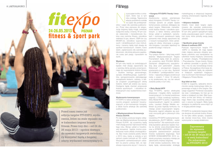 Magazyn 8 |aktualności targi | 9 BIZNES N a początek krótko o zmianach, które nas w tym roku czekają. Tegoroczna edycja podzielona została na część dla profesjonalistów i część dla szerokiej publiczności. Przez dwa pierwsze dni ekspozycję targową będą mogły zwiedzać wyłącznie osoby z branży. W tym czasie właściciele i menedżerowie klubów oraz centrów fitness, ośrodków wellness & spa, siłowni, OSiR-ów czy MOSiR-ów, ośrodków wypoczynkowych i rehabilitacyjnych oraz instruktorzy i trenerzy będą mieli okazję do spotkań biznesowych. Ostatni, trzeci dzień, zaplanowano dla szerokiej publiczności, dla której aktywne spędzanie czasu jest pasją i sposobem na życie. Wystawa W tym roku każdy ze zwiedzających będzie miał okazję zapoznania się z szeroką ofertą sprzętu przeznaczonego do wyposażenia klubów fitness i studiów treningu personalnego, sprzętu rehabilitacyjnego, suplementów, oprogramowania ułatwiającego zarządzanie klubami, odzieży, a także urządzeń uzupełniających ofertę klubów, takich jak solaria czy sauny. Dostępne będą również propozycje klubów sportowych i ośrodków rekreacyjnych oraz wydawnictwa branżowe. Przed nami ósma już edycja targów FIT-EXPO, wydarzenia, które na stałe wpisało się w kalendarz imprez branży fitness. Przez trzy dni – od 24 do 26 maja 2013 – oprócz dostępu do nowości targowych zwiedzający korzystać będą z bogatej oferty wydarzeń towarzyszących. Wydarzenia towarzyszące FIT-EXPO to także atrakcyjny merytorycznie program wydarzeń towarzyszących, w tym konwencje i kongres, a także liczne atrakcje dla szerokiej publiczności. • Międzynarodowa Konwencja Fitness EU4YA Po raz kolejny podczas targów odbędzie się Międzynarodowa Konwencja Fitness EU4YA. Jej uczestnicy będą mieli okazję poznać najnowsze trendy tego roku. Biorąc udział w trzydniowej konwencji będzie można przetestować nowe układy choreograficzne. Być może zostanie pobity rekord z 2012 roku, kiedy w sobotę w tym samym czasie ćwiczyło aż 781 osób! Wszystkich zainteresowanych udziałem na pewno ucieszy fakt, że rejestracja rozpocznie się już 1 marca br. • Kongres FIT-EXPO Trendy i Innowacje Zeszłoroczny sukces premierowej edycji Kongresu FIT-EXPO Trendy i Innowacje sprawił, że projekt będzie kontynuowany podczas zbliżającej się edycji targów. Właściciele, menedżerowie klubów fitness i ośrodków sportowych, a także trenerzy personalni biorąc udział w wykładach, warsztatach i rozmowach panelowych będą ponownie mieć okazję zapoznania się z nowymi rozwiązaniami, które uatrakcyjnią ich ofertę. Informacje o programie kongresu i początek rejestracji na przełomie lutego i marca br. • Polska biega Trzy tysiące metrów – taką trasę wokół terenów Międzynarodowych Targów Poznańskich będą mieli do pokonania uczestnicy akcji POLSKA BIEGA. Zachęceni ubiegłoroczną popularnością akcji pod patronatem „Gazety Wyborczej” i entuzjazmem biegaczy powtarzamy ją i w tym roku. Spośród 55 śmiałków – profesjonalistów i amatorów – najszybszy biegacz przekroczył metę z czasem 7 minut 18 sekund, a my przekonamy się, czy ten rekord zostanie pobity w tym roku. • Złoty Medal MTP Targi FIT-EXPO, oprócz atrakcyjnej ekspozycji i bogatej oferty wydarzeń towarzyszących, to również prestiżowe nagrody, o które rywalizują wystawcy. Złoty Medal MTP to jedna z najbardziej rozpoznawalnych nagród na polskim rynku. Laureaci Złotego Medalu wyłaniani są przez kapitułę konkursu na miesiąc przed rozpoczęciem targów. Wręczenie nagród odbędzie się podczas uroczystej gali w pierwszym dniu targów. Uczestnicy FIT-EXPO wybiorą też laureata plebiscytu „ZŁOTY MEDAL – wybór konsumentów”. Na wyłonionych wcześniej laureatów głosować będzie można na stronie www.zlotymedal.mtp.pl oraz w STREFIE MISTRZÓW – stoisku specjalnie zaaranżowanym podczas trwania wydarzenia targowego. Tytuł WYBÓR KONSUMENTÓW 2013 zostanie przyznany zwycięzcy miesiąc po zakończeniu imprezy targowej. Z kolei stoiska wystawców, które najlepiej będą odzwierciedlać strategię marketingową w ekspozycji targowej, zostaną uhonorowane nagrodą Acanthus Ureus. • Aktywna niedziela Ostatni, trzeci dzień targów zaplanowano dla szerokiej publiczności. Z pewnością nie będzie czasu na nudę. W tym dniu gośćmi specjalnymi będą osoby popularyzujące sport i aktywny tryb życia, które potrafią swoją pasją zarażać. • Spotkanie grupy branży fitness & wellness ZPP Podczas tegorocznych targów FIT-EXPO w niedzielę 26 maja będzie miało miejsce pierwsze oficjalne spotkanie członków oraz kandydatów na członków nowej inicjatywy utworzonej w ramach Związku Przedsiębiorców i Pracodawców. Grupa branży fitness & wellness powstała w grudniu 2012 roku i ma na celu konsolidację branży w Polsce. Szczegółowe informacje dotyczące spotkania będą się pojawiać w kolejnych wydaniach magazynu oraz na stronach internetowych targów i Magazynu Fitness Biznes. Kup bilet on-line E-bilet to wygodna, opłacalna ekonomicznie wersja tradycyjnego biletu kupowanego w kasie w dniu targów. Dlaczego wygodna? Ponieważ oszczędza się czas i zwiedzający nie traci go na stanie w kolejkach po bilet. Bilet kupowany on-line jest tańszy od tradycyjnego. Warto więc wcześniej zdecydować o wizycie na targach. Bilety będą dostępne na platformie www.mtp21.pl w drugiej połowie lutego. FIT-EXPO to wydarzenie targowe idealnie skrojone do potrzeb branży fitness. To nie tylko oferta sprzętu, urządzeń, ale również know-how, które można wykorzystać w swojej działalności. Zapraszamy do wpisania terminu targów – od 24 do 26 maja 2013 – w swój kalendarz! Do zobaczenia na FIT-EXPO 2013