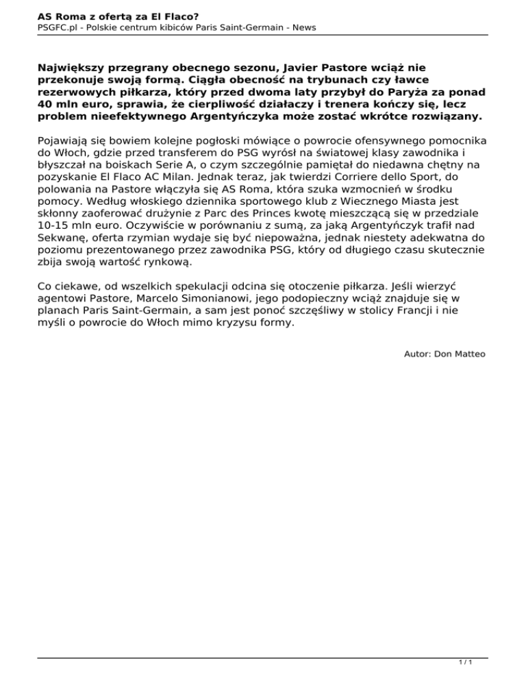 AS Roma z ofertą za El Flaco? PSGFC.pl - Polskie centrum kibiców Paris Saint-Germain - News Największy przegrany obecnego sezonu, Javier Pastore wciąż nie przekonuje swoją formą. Ciągła obecność na trybunach czy ławce rezerwowych piłkarza, który przed dwoma laty przybył do Paryża za ponad 40 mln euro, sprawia, że cierpliwość działaczy i trenera kończy się, lecz problem nieefektywnego Argentyńczyka może zostać wkrótce rozwiązany. Pojawiają się bowiem kolejne pogłoski mówiące o powrocie ofensywnego pomocnika do Włoch, gdzie przed transferem do PSG wyrósł na światowej klasy zawodnika i błyszczał na boiskach Serie A, o czym szczególnie pamiętał do niedawna chętny na pozyskanie El Flaco AC Milan. Jednak teraz, jak twierdzi Corriere dello Sport, do polowania na Pastore włączyła się AS Roma, która szuka wzmocnień w środku pomocy. Według włoskiego dziennika sportowego klub z Wiecznego Miasta jest skłonny zaoferować drużynie z Parc des Princes kwotę mieszczącą się w przedziale 10-15 mln euro. Oczywiście w porównaniu z sumą, za jaką Argentyńczyk trafił nad Sekwanę, oferta rzymian wydaje się być niepoważna, jednak niestety adekwatna do poziomu prezentowanego przez zawodnika PSG, który od długiego czasu skutecznie zbija swoją wartość rynkową. Co ciekawe, od wszelkich spekulacji odcina się otoczenie piłkarza. Jeśli wierzyć agentowi Pastore, Marcelo Simonianowi, jego podopieczny wciąż znajduje się w planach Paris Saint-Germain, a sam jest ponoć szczęśliwy w stolicy Francji i nie myśli o powrocie do Włoch mimo kryzysu formy. Autor: Don Matteo 1/1 Powered by TCPDF (www.tcpdf.org)