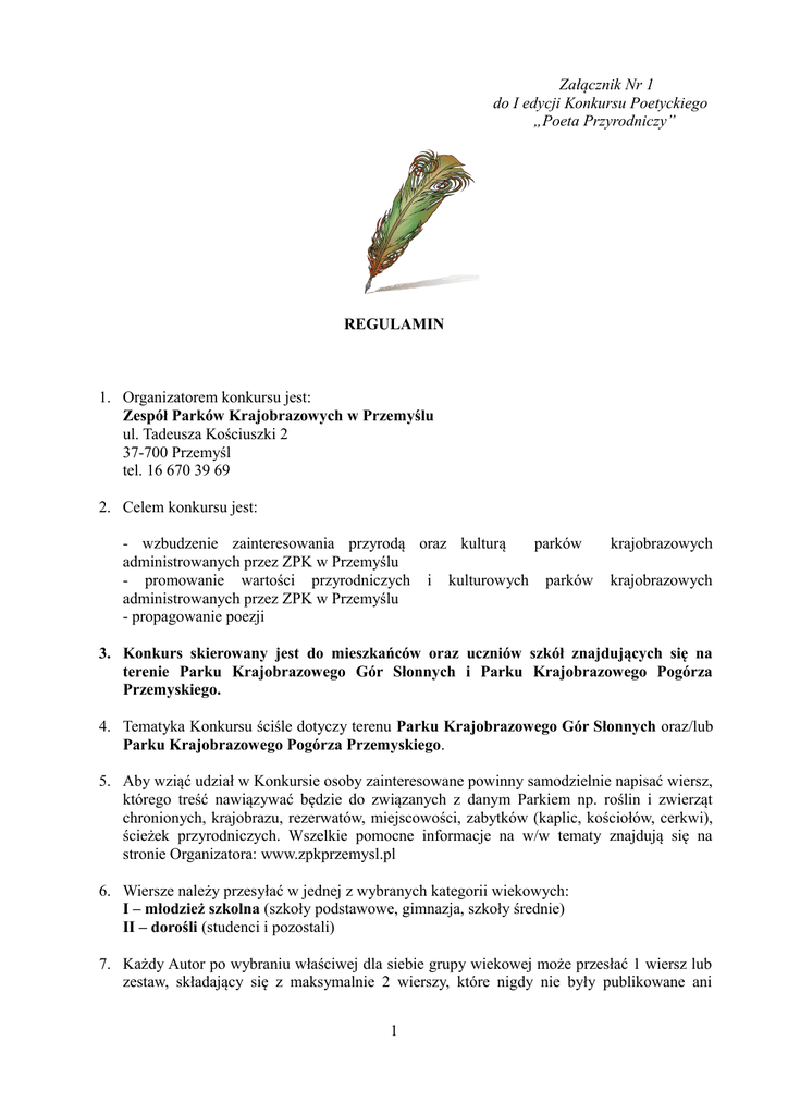 Załącznik Nr 1 do I edycji Konkursu Poetyckiego „Poeta Przyrodniczy” REGULAMIN 1. Organizatorem konkursu jest: Zespół Parków Krajobrazowych w Przemyślu ul. Tadeusza Kościuszki 2 37-700 Przemyśl tel. 16 670 39 69 2. Celem konkursu jest: - wzbudzenie zainteresowania przyrodą oraz kulturą parków administrowanych przez ZPK w Przemyślu - promowanie wartości przyrodniczych i kulturowych parków administrowanych przez ZPK w Przemyślu - propagowanie poezji krajobrazowych krajobrazowych 3. Konkurs skierowany jest do mieszkańców oraz uczniów szkół znajdujących się na terenie Parku Krajobrazowego Gór Słonnych i Parku Krajobrazowego Pogórza Przemyskiego. 4. Tematyka Konkursu ściśle dotyczy terenu Parku Krajobrazowego Gór Słonnych oraz/lub Parku Krajobrazowego Pogórza Przemyskiego. 5. Aby wziąć udział w Konkursie osoby zainteresowane powinny samodzielnie napisać wiersz, którego treść nawiązywać będzie do związanych z danym Parkiem np. roślin i zwierząt chronionych, krajobrazu, rezerwatów, miejscowości, zabytków (kaplic, kościołów, cerkwi), ścieżek przyrodniczych. Wszelkie pomocne informacje na w/w tematy znajdują się na stronie Organizatora: www.zpkprzemysl.pl 6. Wiersze należy przesyłać w jednej z wybranych kategorii wiekowych: I – młodzież szkolna (szkoły podstawowe, gimnazja, szkoły średnie) II – dorośli (studenci i pozostali) 7. Każdy Autor po wybraniu właściwej dla siebie grupy wiekowej może przesłać 1 wiersz lub zestaw, składający się z maksymalnie 2 wierszy, które nigdy nie były publikowane ani 1 nagradzane. 8. Treść każdego wiersza powinna dotyczyć jednego wybranego parku. W przypadku przesłania dwóch wierszy, każdy może dotyczyć tego samego parku. 9. Wszystkie przesłane wiersze powinny posiadać tytuł. Charakter wierszy jest dowolny (tj. długość i rodzaj). 10. Każdy wiersz powinien być podpisany imieniem i nazwiskiem Autora. 11. Autorzy przystępujący do Konkursu oświadczają, że przesłane utwory są ich wyłącznym dziełem. 12. Wiersz lub zestaw wierszy należy przesłać do dnia 25.05.2015 r. w formie: drukowanej - pocztą tradycyjną na adres Organizatora Konkursu z dopiskiem „Poeta Przyrodniczy” z dołączonym, odręcznie wypełnionym i podpisanym formularzem zgłoszenia (Załącznik Nr 2) lub w formacie pdf. - na adres mailowy [email protected] z dołączonym skanem, odręcznie wypełnionego i podpisanego formularza zgłoszenia (Załącznik Nr 2). 13. Wiersze oceni Jury, składające się z 2 specjalistów ds. edukacji, turystyki i rekreacji oraz 2 specjalistów ds. ochrony środowiska, krajobrazu, wartości historycznych i kulturowych. 14. W każdej kategorii wiekowej zostanie przyznane: I miejsce II miejsce I wyróżnienie II wyróżnienie 15. Uroczystość ogłoszenia wyników oraz wręczenia nagród odbędzie się w siedzibie Organizatora w dniu 3.06.2015 r. o godz. 10.00 i połączona zostanie z krótką prezentacją o działalności Zespołu Parków Krajobrazowych w Przemyślu. Zwycięskie miejsca oraz osoby wyróżnione otrzymają atrakcyjne nagrody rzeczowe, natomiast pozostali uczestnicy Konkursu otrzymają zestawy promocyjne Zespołu Parków Krajobrazowych w Przemyślu. 16. Organizator nie zwraca prac nadesłanych na Konkurs. 17. Przystępując do konkursu Autorzy wyrażają zgodę na wielokrotną, bezpłatną publikację oraz cytowanie nagrodzonych i wyróżnionych wierszy na potrzeby Organizatora, a także na imienną publikację wyników na stronach internetowych Organizatora. 18. Zgłoszenie uczestnictwa w Konkursie jest jednoznaczne z zapoznaniem się i przyjęciem warunków niniejszego Regulaminu. 2