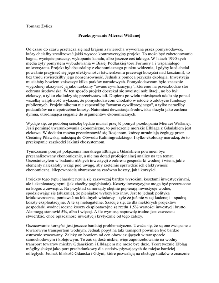 Tomasz Żylicz Przekopywanie Mierzei Wiślanej Od czasu do czasu przetacza się nad krajem zawierucha wywołana przez pomysłodawcę, który chciałby zrealizować jakiś wysoce kontrowersyjny projekt. To może być zabetonowanie bagna, wycięcie puszczy, wykopanie kanału, albo jeszcze coś takiego. W latach 1990-tych media żyły pomysłem wybudowania w Białej Podlaskiej toru Formuły 1 i wspaniałego uniwersytetu. Projekt był absurdalny z ekonomicznego punktu widzenia, i gdyby ktoś chciał poważnie przyjrzeć się jego efektywności (stwierdzeniu przewagi korzyści nad kosztami), to bez trudu stwierdziłby jego nonsensowność. Jednak z pomocą przyszła ekologia. Inwestycja musiałaby bowiem zniszczyć kilka parków narodowych. Pomysłodawcom było znacznie wygodniej ukazywać ją jako rzekomy "awans cywilizacyjny", któremu na przeszkodzie stoi ochrona środowiska. W ten sposób projekt doczekał się swoistej nobilitacji, no bo był ciekawy, a tylko ekolodzy się przeciwstawiali. Dopiero po wielu miesiącach udało się ponad wszelką wątpliwość wykazać, że pomysłodawcom chodziło w istocie o zdobycie funduszy publicznych. Projekt nikomu nie zapewniłby "awansu cywilizacyjnego", a tylko naraziłby podatników na niepotrzebne koszty. Natomiast dewastacja środowiska służyła jako zasłona dymna, utrudniająca sięganie do argumentów ekonomicznych. Wydaje się, że podobną ścieżkę będzie musiał przejść pomysł przekopania Mierzei Wiślanej. Jeśli pominąć uwarunkowania ekonomiczne, to połączenie morskie Elbląga z Gdańskiem jest ciekawe. W dodatku można przeciwstawić się Rosjanom, którzy utrudniają żeglugę przez Cieśninę Pilawską, należącą do Obwodu Kaliningradzkiego. I tylko ekolodzy marudzą, że to przekopanie zaszkodzi jakimś ekosystemom. Tymczasem pomysł połączenia morskiego Elbląga z Gdańskiem powinien być przeanalizowany ekonomicznie, a nie ma dotąd profesjonalnej analizy na ten temat. Uczestniczyłem w badaniu różnych inwestycji z zakresu gospodarki wodnej i wiem, jakie elementy należałoby wziąć pod uwagę, aby rzetelnie sprawdzić ich efektywność ekonomiczną. Niepewnością obarczone są zarówno koszty, jak i korzyści. Projekty tego typu charakteryzują się zazwyczaj bardzo wysokimi kosztami inwestycyjnymi, ale i eksploatacyjnymi (jak choćby pogłębianie). Koszty inwestycyjne mogą być przerzucone na kogoś z zewnątrz. Na przykład samorządy chętnie popierają inwestycje wodne, spodziewając się (słusznie), że pieniądze wyłoży kto inny. Jest to jednak polityka krótkowzroczna, ponieważ na lokalnych włodarzy – tyle że już nie w tej kadencji – spadną koszty eksploatacyjne. A te są niebagatelne. Szacuje się, że dla niektórych projektów gospodarki wodnej roczne koszty eksploatacyjne są rzędu 1,5% wartości inwestycji brutto. Ale mogą stanowić 5%, albo i więcej. A ile wyniosą naprawdę trudno jest zawczasu stwierdzić, choć opłacalność inwestycji krytycznie od tego zależy. Oszacowanie korzyści jest jeszcze bardziej problematyczne. Uważa się, że są one związane z towarowym transportem wodnym. Jednak popyt na taki transport powinien być bardzo ostrożnie szacowany. Zależy on bowiem od cen obowiązujących w transporcie samochodowym i kolejowym. Te zaś są dość niskie, więc zapotrzebowanie na wodny transport towarów między Gdańskiem i Elblągiem nie może być duże. Teoretycznie Elbląg mógłby służyć jako port przeładunkowy dla statków pływających do miejsc bardziej odległych. Jednak bliskość Gdańska i Gdyni, które pozwalają na obsługę statków o znacznie większym zanurzeniu, i których porty nie są w pełni wykorzystane sprawia, że potencjał Elbląga jest niski. Sięga się zatem po transport pasażerski, zwłaszcza o charakterze rekreacyjnym (bo podróż wodna z Elbląga do Gdańska nie mogłaby być szybka). Oczywiście popyt na wodny transport pasażerski w tym regionie istnieje, ale byłby on mizerny, gdyby cena miała się zbliżyć do kosztów jego obsługi. Z kolei przykład Zbiornika Włocławskiego wskazuje na nierealność nadziei na aktywizację lokalnych gospodarek w oparciu o turystykę wspomaganą inwestycjami wodnymi. Wręcz przeciwnie, miejscowości położone wokół Zbiornika musiały się borykać po 1970 r. z problemami większymi, niż gdyby Wisła nie była na tym odcinku spiętrzona, a ruch turystyczny bynajmniej nie wzrósł po jego utworzeniu. Lansując wodny transport śródlądowy, sięga się niekiedy po argumenty ekologiczne, porównując na przykład emisje zanieczyszczeń w przeliczeniu na tono-kilometr frachtu albo na pasażero-kilometr. Rzeczywiście emisje te są mniejsze niż w transporcie samochodowym. Ale już w porównaniu z transportem kolejowym są gorsze. Tak więc nie jest prawdą, że ochrona środowiska wskazuje na transport wodny jako najprzyjaźniejszy. W przygotowanych pod moją opieką analizach różnych inwestycji wodnych rozpatrywano również zniszczenie środowiska spowodowane przez pogłębianie zbiorników i cieków wodnych i inne prace ziemne (nie wspominając o wypadkach i hałasie). Okazują się one często stosunkowo niewielkie w porównaniu ze "zwykłymi" kosztami. Dlatego uważam, że rzetelna analiza ekonomiczna tego typu inwestycji może być ważniejsza niż wskazywanie na zagrożenia ekologiczne. Jak już zawodzą wszelkie argumenty ekonomiczne, entuzjaści żeglugi śródlądowej wskazują na przykład Renu, jako intensywnie wykorzystywanej drogi wodnej; a przecież Niemcy umieją liczyć. Nie jest to porównanie uzasadnione, ponieważ Ren od czasów Beethovena nie zamarza. Może być więc użytkowany przez cały rok, bez potrzeby utrzymywania zapasowej infrastruktury lądowej. Wzdłuż obu brzegów rzeki jeżdżą też wprawdzie pociągi, ale po istniejących torach nie dałoby się przewieźć towarów załadowanych na barki. Jednak ważniejsze jest to, że Ren ma wielokrotnie więk