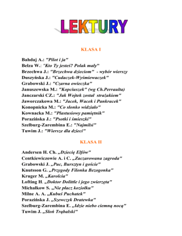 KLASA I Bahdaj A.: "Pilot i ja" Bełza W.: "Kto Ty jesteś? Polak mały" Brzechwa J.: "Brzechwa dzieciom" - wybór wierszy Duszyńska J.: "Cudaczek-Wyśmiewaczek" Grabowski J.: "Czarna owieczka" Januszewska M.: "Kopciuszek" (wg Ch.Perraulta) Janczarski CZ.: "Jak Wojtek został strażakiem" Jaworczakowa M.: "Jacek, Wacek i Pankracek" Konopnicka M.: "Co słonko widziało" Kownacka M.: "Plastusiowy pamiętnik" Porazińska J.: "Psotki i śmieszki" Szelburg-Zarembina E.: "Najmilsi" Tuwim J.: "Wiersze dla dzieci" KLASA II Andersen H. Ch. „Dziecię Elfów" Centkiewiczowie A. i C. „Zaczarowana zagroda" Grabowski J. „Puc, Bursztyn i goście" Knutsson G. „Przygody Filonka Bezogonka" Kruger M. „Karolcia" Lofting H. „Doktor Dolittle i jego zwierzęta" Michałkow S. „Nie płacz koziołku" Milne A. A. „Kubuś Puchatek" Porazińska J. „Szewczyk Dratewka" Szelburg-Zarembina E. „Idzie niebo ciemną nocą" Tuwim J. „Słoń Trąbalski" KLASA III Centkiewicz Cz.: "Anaruk, chłopiec z Grenlandii" Chotomska W.: "Dzieci Pana Astronoma" Jaworczakowa M.: "Oto jest Kasia" Kownacka M. "Kajtkowe przygody" Lindgren A.: "Dzieci z Bullerbyn" Makuszyński K.: "Awantura o Basię" Pisarski R.: "O psie, który jeździł koleją"
