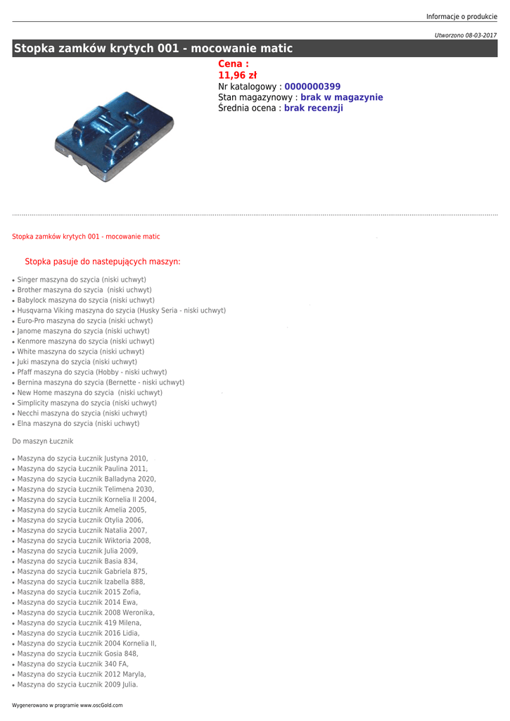 Informacje o produkcie Utworzono 08-03-2017 Stopka zamków krytych 001 - mocowanie matic Cena : 11,96 zł ● ● ● ● ● ● ● ● ● ● ● ● ● Singer maszyna do szycia (niski uchwyt) Brother maszyna do szycia (niski uchwyt) Babylock maszyna do szycia (niski uchwyt) Husqvarna Viking maszyna do szycia (Husky Seria - niski uchwyt) Euro-Pro maszyna do szycia (niski uchwyt) Janome maszyna do szycia (niski uchwyt) Kenmore maszyna do szycia (niski uchwyt) White maszyna do szycia (niski uchwyt) Juki maszyna do szycia (niski uchwyt) Pfaff maszyna do szycia (Hobby - niski uchwyt) Bernina maszyna do szycia (Bernette - niski uchwyt) New Home maszyna do szycia (niski uchwyt) Simplicity maszyna do szycia (niski uchwyt) Necchi maszyna do szycia (niski uchwyt) Elna maszyna do szycia (niski uchwyt) Do maszyn Łucznik ● ● ● ● ● ● ● ● ● ● ● ● ● ● ● ● ● ● ● ● ● Wygenerowano w programie www.oscGold.com te Maszyna do szycia Łucznik Justyna 2010, Maszyna do szycia Łucznik Paulina 2011, Maszyna do szycia Łucznik Balladyna 2020, Maszyna do szycia Łucznik Telimena 2030, Maszyna do szycia Łucznik Kornelia II 2004, Maszyna do szycia Łucznik Amelia 2005, Maszyna do szycia Łucznik Otylia 2006, Maszyna do szycia Łucznik Natalia 2007, Maszyna do szycia Łucznik Wiktoria 2008, Maszyna do szycia Łucznik Julia 2009, Maszyna do szycia Łucznik Basia 834, Maszyna do szycia Łucznik Gabriela 875, Maszyna do szycia Łucznik Izabella 888, Maszyna do szycia Łucznik 2015 Zofia, Maszyna do szycia Łucznik 2014 Ewa, Maszyna do szycia Łucznik 2008 Weronika, Maszyna do szycia Łucznik 419 Milena, Maszyna do szycia Łucznik 2016 Lidia, Maszyna do szycia Łucznik 2004 Kornelia II, Maszyna do szycia Łucznik Gosia 848, Maszyna do szycia Łucznik 340 FA, Maszyna do szycia Łucznik 2012 Maryla, Maszyna do szycia Łucznik 2009 Julia. a ● w ● m ● r ● a Stopka pasuje do nastepujących maszyn: k Stopka zamków krytych 001 - mocowanie matic r Nr katalogowy : 0000000399 Stan magazynowy : brak w magazynie Średnia ocena : brak recenzji k r a m r te a w