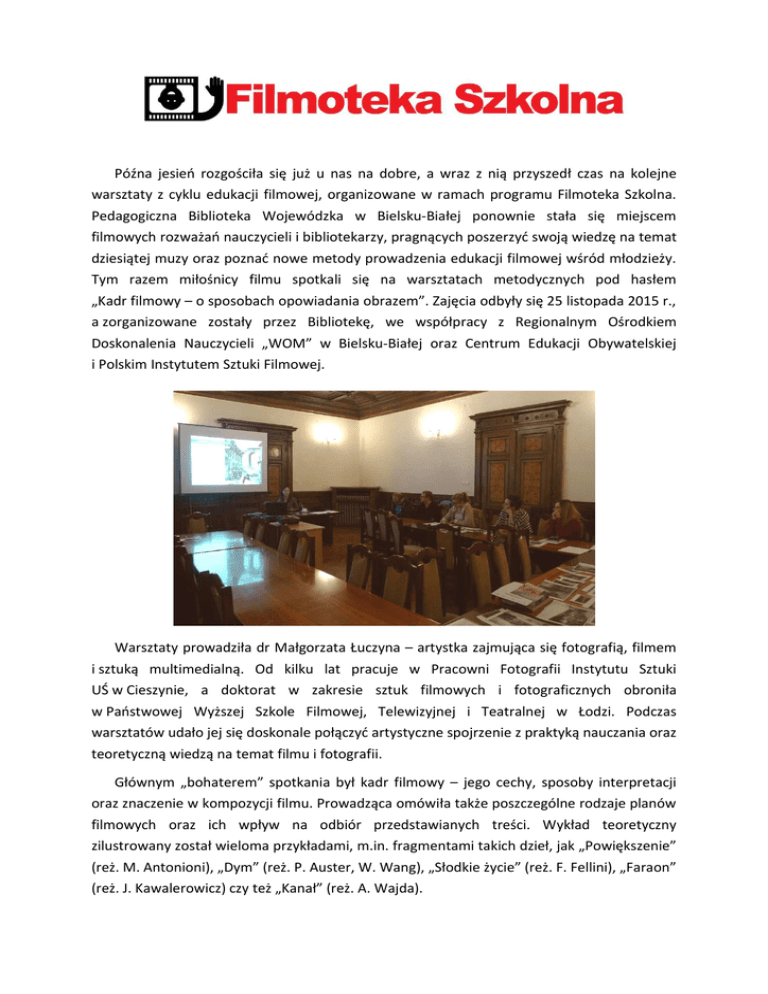 Późna jesień rozgościła się już u nas na dobre, a wraz z nią przyszedł czas na kolejne warsztaty z cyklu edukacji filmowej, organizowane w ramach programu Filmoteka Szkolna. Pedagogiczna Biblioteka Wojewódzka w Bielsku-Białej ponownie stała się miejscem filmowych rozważań nauczycieli i bibliotekarzy, pragnących poszerzyć swoją wiedzę na temat dziesiątej muzy oraz poznać nowe metody prowadzenia edukacji filmowej wśród młodzieży. Tym razem miłośnicy filmu spotkali się na warsztatach metodycznych pod hasłem „Kadr filmowy – o sposobach opowiadania obrazem”. Zajęcia odbyły się 25 listopada 2015 r., a zorganizowane zostały przez Bibliotekę, we współpracy z Regionalnym Ośrodkiem Doskonalenia Nauczycieli „WOM” w Bielsku-Białej oraz Centrum Edukacji Obywatelskiej i Polskim Instytutem Sztuki Filmowej. Warsztaty prowadziła dr Małgorzata Łuczyna – artystka zajmująca się fotografią, filmem i sztuką multimedialną. Od kilku lat pracuje w Pracowni Fotografii Instytutu Sztuki UŚ w Cieszynie, a doktorat w zakresie sztuk filmowych i fotograficznych obroniła w Państwowej Wyższej Szkole Filmowej, Telewizyjnej i Teatralnej w Łodzi. Podczas warsztatów udało jej się doskonale połączyć artystyczne spojrzenie z praktyką nauczania oraz teoretyczną wiedzą na temat filmu i fotografii. Głównym „bohaterem” spotkania był kadr filmowy – jego cechy, sposoby interpretacji oraz znaczenie w kompozycji filmu. Prowadząca omówiła także poszczególne rodzaje planów filmowych oraz ich wpływ na odbiór przedstawianych treści. Wykład teoretyczny zilustrowany został wieloma przykładami, m.in. fragmentami takich dzieł, jak „Powiększenie” (reż. M. Antonioni), „Dym” (reż. P. Auster, W. Wang), „Słodkie życie” (reż. F. Fellini), „Faraon” (reż. J. Kawalerowicz) czy też „Kanał” (reż. A. Wajda). Podczas warsztatów nie zabrakło także ćwiczeń, które pomogły uczestnikom utrwalić zdobytą wiedzę oraz ukazały proponowane metody pracy z uczniami w zakresie edukacji filmowej. Prelegentka szczególną uwagę zwróciła na potrzebę kształtowania u młodych ludzi umiejętności świadomej i starannej obserwacji oraz wnikliwej interpretacji fotograficznych i filmowych kadrów. Skupienie się na prawdziwie wartościowym obrazie i odkrywanie jego ukrytych znaczeń wydaje się być sztuką trudną i zapomnianą w dobie medialnych „fast foodów”. Tym ważniejsza staje się więc edukacja filmowa, aktywnie prowadzona wśród dzieci i młodzieży. oprac. R. Łuczyna