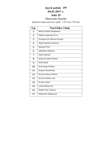 Język polski PP 04.01.2017 r. Sala 25 Sławomir Stasiak Egzamin rozpoczyna się o godz. 7.30 i trwa 170 min. Nazwisko i imię Lp. 1. Bieleń Natalia Magdalena 2. Dubiel Agnieszka Ewa 3. Grzegorczyk Mateusz Kacper 4. Hałaj Monika Katarzyna 5. Ignarski Piotr 6. Jabłońska Wiktoria 7. Janik Mateusz 8. Klarycki Jakub Michał 9. Kluk Jakub 10. Koń Kinga Paulina 11. Koptyra Bartłomiej 12. Kosior Łukasz Marian 13. Kruczek Miłosz Jan 14. Kuryła Adam 15. Łokaj Michał Jan 16. Małek Piotr Andrzej 17. Markocka Małgorzata Język polski PP 04.01.2017 r. Sala 26 Konrad Zawadzki Egzamin rozpoczyna się o godz. 7.30 i trwa 170 min. Lp. Nazwisko i imię 1. Partyka Kamil Wojciech 2. Rozwadowski Bartłomiej 3. Sadyń Bartłomiej Jarosław 4. Sibiga Agnieszka Wiktoria 5. Siek Tomasz Wojciech 6. Siwek Aleksander 7. Takmadżan Aram Andrzej 8. Wąsik Hubert 9. Wiącek Piotr Tomasz 10. Winiarska Anna Agnieszka 11. Wrona Monika 12. Żebrowski Karol 13. Burdzy Aleksandra 14. Wawreńczuk Karol Bartosz 15. Bartkowiak Jakub Sławomir 16. Brzóska Marcin 17. Cebulak Patryk Krzystof 18. Dziedzic Magdalena Katarzyna Język polski PP 04.01.2017 r. Sala 36 Katarzyna Geraghty Egzamin rozpoczyna się o godz. 7.30 i trwa 170 min. Nazwisko i imię Lp. 1. Dziewic Dawid 2. Gąbka Natalia 3. Gosztyła Paulina Beata 4. Gunia Filip Kacper 5. Hara Konstancja Wiktoria 6. Jarosz Krzysztof Michał 7. Kania Kamil Dominik 8. Karwowski Paweł 9. Krakowska Karolina Agata 10. Król Wiktoria Maria 11. Latawiec Kamil Krzysztof 12. Orłowski Michał Jerzy 13. Paleń Patryk 14. Piwowar Michał Grzegorz 15. Piziurny Michał 16. Porzuc Kamil 17. Pucia Karolina Katarzyna Język polski PP 04.01.2017 r. Sala 37 Aleksandra Gierak Egzamin rozpoczyna się o godz. 7.30 i trwa 170 min. Nazwisko i imię Lp. 1. Rakoczy Wioletta 2. Rzucidło Anna Maria 3. Siek Angelika 4. Skórczyński Jakub Bartłomiej 5. Tofil Adrianna 6. Weinberger Ewelina 7. Wiertel Filip Waldemar 8. Wojtala Paulina Katarzyna 9. Wołoszyn Andżelika Aleksandra 10. Wrońska Jolanta Maria 11. Burdzy Agnieszka 12. Bzdoń Mikołaj 13. Dąbrowska Katarzyna 14. Gaik Maciej 15. Gorczyca Michał Bolesław 16. Hanzel Filip Józef 17. Jaskot Mateusz Michał 18. Kochowska Anna 19. Kotwica Paweł Piotr 20. Lach Radosław Język polski PP 04.01.2017 r. Sala 38 Piotr Godek Egzamin rozpoczyna się o godz. 7.30 i trwa 170 min. Lp. Nazwisko i imię 1. Liwak Marcin 2. Maciejak Kamil Tadeusz 3. Madej Bartłomiej 4. Nachtman Kacper 5. Płuciennik Konrad Mateusz 6. Pokora Krzysztof 7. Pytlos Magdalena 8. Stus Szymon Mikołaj 9. Szczęch Krzysztof 10. Szewczyk Agata Anna 11. Tutka Szymon 12. Wermiński Bartosz Leonard 13. Wieczorek Mateusz 14. Boguń Aleksandra 15. Bojarska Aleksandra Joanna 16. Gadomska Natalia Anna 17. Gołąb Natalia Łucja 18. Grot Karolina Katarzyna 19. Karwan Klaudia Anna 20. Knap Aleksandra Lucyna Język polski PP 04.01.2017 r. Sala 39 Barbara Muciek Egzamin rozpoczyna się o godz. 7.30 i trwa 170 min. Nazwisko i imię Lp. 1. Kozdra Jakub Lucjan 2. Kozioł Marta Anna 3. Krawczyk Ewelina Agnieszka 4. Kwaśnik Sylwia Natalia 5. Kwitkowski Michał Dominik 6. Majgier Martyna Anna 7. Pamuła Paulina Anna 8. Partyka Marcin Robert 9. Pędrak Justyna Monika 10. Pliszka Patrycja Maria 11. Pyrak Joanna Magdalena 12. Rędzio Bartłomiej Tomasz 13. Rutkowska Agnieszka Anna 14. Smok Emilia Gabriela 15. Stec Tomasz 16. Stelmach Jakub Piotr 17. Stępak Agnieszka 18. Szczęch Sebastian Kristian 19. Tyra Karolina Język polski PP 04.01.2017 r. Sala 40 Stanisław Drąg Egzamin rozpoczyna się o godz. 7.30 i trwa 170 min. Nazwisko i imię Lp. 1. Wierna Aleksandra 2. Wildanger Sebastian Adam 3. Witkowska Sara Katarzyna 4. Zawadzki Mateusz Sebastian 5. Żukowicz Aleksandra Kacperia 6. Andres Oliwia Wiktoria 7. Bełzak Klaudia 8. Bill Dominika Maria 9. Brygoła Marta 10. Buczek Jacek Ryszard 11. Falasa Karol 12. Gęśla Karolina Aleksandra 13. Kamińska Zuzanna Beata 14. Kasiak Aleksandra 15. Kobylarz Alicja Jolanta 16. Kołacz Agnieszka Rozalia 17. Krawiec Damian 18. Kutyła Justyna 19. Małek Kacper 20. Mazurkiewicz Ewa 21. Młynarski Patryk 22. Olejarz Karolina 23. Płóciennik Alicja Barbara Język polski PP 04.01.2017 r. Sala 42 Małgorzata Bieniek Egzamin rozpoczyna się o godz. 7.30 i trwa 170 min. Nazwisko i imię Lp. 1. Powęska Jakub 2. Rudnicka Sylwia Dominika 3. Rybak Aleksandra Wiktoria 4. Rychlak Krzysztof Kazimierz 5. Sałęga Wiktoria Luiza 6. Skoczylas Sylwia Julia 7. Słowik Anna Maria 8. Sprawka Daria Beata 9. Tęcza Aleksandra 10. Tymofijewicz Wojciech 11. Warchoł Aleksandra Izabela 12. Wermiński Mateusz Krzysztof 13. Bambuch Michał Paweł 14. Bielecka Agnieszka Wiktoria 15. Brezdeń Joanna 16. Cetnarska Małgorzata Beata 17. Chmielarz Karolina 18. Czuj Wiktoria Weronika 19. Dąbek Diana 20. Frączek Monika Język polski PP 04.01.2017 r. Sala 43 Barbara Długosz Egzamin rozpoczyna się o godz. 7.30 i trwa 170 min. Nazwisko i imię Lp. 1. Gawlak Julia 2. Gierak Filip Michał 3. Kita Sandra 4. Korniak Michał Jan 5. Kruczkowski Franciszek 6. Łukasik Sylwia Maria 7. Łukawska Zuzanna 8. Łupicka Aleksandra Wiktoria 9. Łyda Anna Maria 10. Madej Przemysław 11. Olko Maja 12. Pacion Sylwia Marta 13. Pelc Natalia 14. Pelc Natalia 15. Piłat Wojciech Aleksander 16. Przybysz Piotr Paweł 17. Rataj Manuela Julita 18. Skręt Agnieszka Język polski PP 04.01.2017 r. Sala 44 Bogusława Gorczyca Egzamin rozpoczyna się o godz. 7.30 i trwa 170 min. Lp. Nazwisko i imię 1. Strutyńska Paulina 2. Szczygieł Monika Sandra 3. Szostak Ewelina 4. Tryka Aleksandra Maria 5. Waniewski Przemysław Jan 6. Zaremba Bartłomiej Stanisław 7. Zawadzka Adrianna 8. Bednarz Krzysztof Stanisław 9. Bielecki Albert Grzegorz 10. Blicharczyk Natalia Magdalena 11. Chamot Agata 12. Chojnacka Dominika Beata 13. Fiołna Agnieszka Sandra 14. Galczak Aleksandra Gabriela 15. Gołda Joanna Ewa 16. Karbarz Agnieszka Maria 17. Klimek Aleksandra Julia 18. Krawiec Bartosz Jakub 19. Kulesza Celina 20. Kuraś Klaudia K