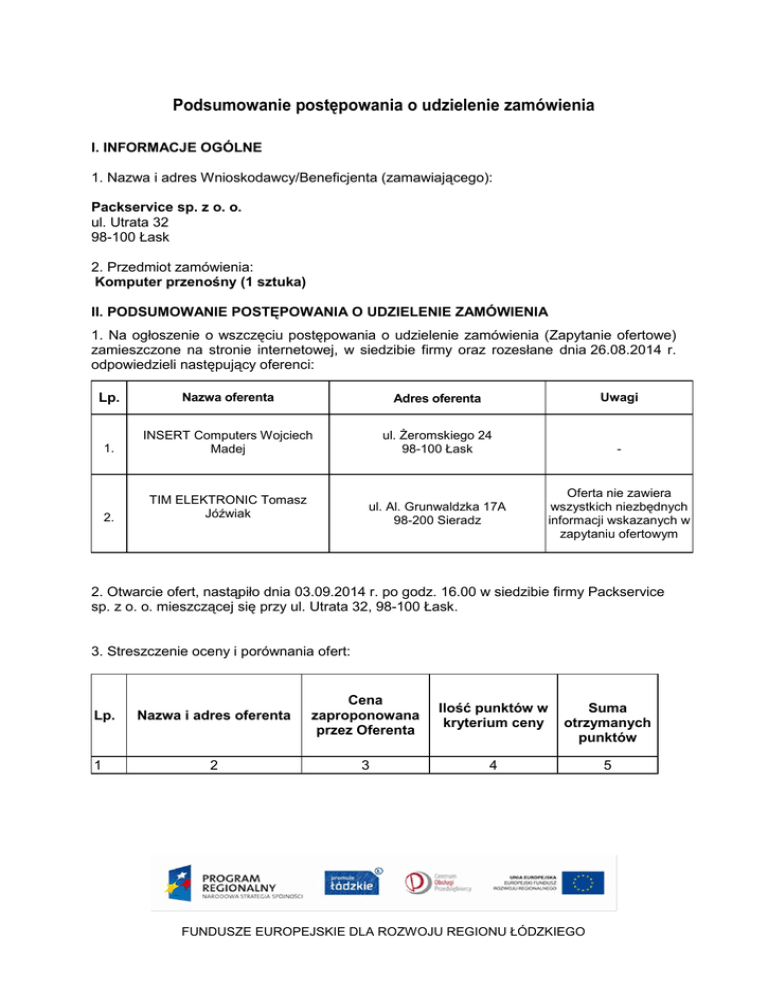 Podsumowanie postępowania o udzielenie zamówienia I. INFORMACJE OGÓLNE 1. Nazwa i adres Wnioskodawcy/Beneficjenta (zamawiającego): Packservice sp. z o. o. ul. Utrata 32 98-100 Łask 2. Przedmiot zamówienia: Komputer przenośny (1 sztuka) II. PODSUMOWANIE POSTĘPOWANIA O UDZIELENIE ZAMÓWIENIA 1. Na ogłoszenie o wszczęciu postępowania o udzielenie zamówienia (Zapytanie ofertowe) zamieszczone na stronie internetowej, w siedzibie firmy oraz rozesłane dnia 26.08.2014 r. odpowiedzieli następujący oferenci: Lp. Nazwa oferenta Adres oferenta Uwagi 1. INSERT Computers Wojciech Madej ul. Żeromskiego 24 98-100 Łask - 2. TIM ELEKTRONIC Tomasz Jóźwiak ul. Al. Grunwaldzka 17A 98-200 Sieradz Oferta nie zawiera wszystkich niezbędnych informacji wskazanych w zapytaniu ofertowym 2. Otwarcie ofert, nastąpiło dnia 03.09.2014 r. po godz. 16.00 w siedzibie firmy Packservice sp. z o. o. mieszczącej się przy ul. Utrata 32, 98-100 Łask. 3. Streszczenie oceny i porównania ofert: Lp. 1 Nazwa i adres oferenta Cena zaproponowana przez Oferenta Ilość punktów w kryterium ceny Suma otrzymanych punktów 2 3 4 5 FUNDUSZE EUROPEJSKIE DLA ROZWOJU REGIONU ŁÓDZKIEGO 1. 2. INSERT Computers Wojciech Madej ul. Żeromskiego 24 98-100 Łask TIM ELEKTRONIC Tomasz Jóźwiak ul. Al. Grunwaldzka 17A 98-200 Sieradz 3 210,57 netto PLN 3 576,42 netto PLN 100,00 100,00 - - 4. W wyniku oceny ofert za najkorzystniejszą ofertę została uznana: oferta firmy: INSERT Computers Wojciech Madej ul. Żeromskiego 24 98-100 Łask. 5.Uzasadnienie: Beneficjent w odpowiedzi na zapytanie ofertowe otrzymał dwie oferty, jednak tylko jedna z nich była prawidłowa pod względem formalnym i merytorycznym. Zgodnie z ustalonym kryterium wyboru najkorzystniejszej oferty firma INSERT Computers Wojciech Madej zaproponowała najniższą cenę na przedmiot naszego zapotrzebowania o specyfikacji zgodnej z wymaganiami odnośnego zapytania ofertowego. Stąd przyznano maksymalną ilość punktów i uznano ofertę za najkorzystniejszą. Łask, dnia 03.09.2014 r. FUNDUSZE EUROPEJSKIE DLA ROZWOJU REGIONU ŁÓDZKIEGO FUNDUSZE EUROPEJSKIE DLA ROZWOJU REGIONU ŁÓDZKIEGO