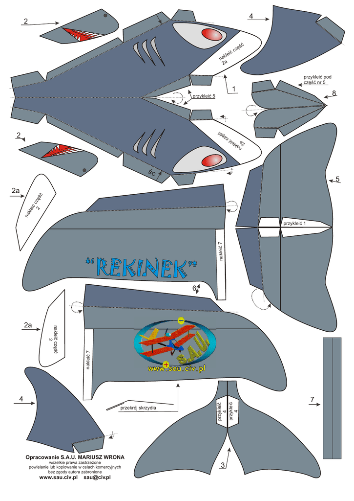 4 2 æ lei êœ cz æ k na 2a przykleiæ pod czêœæ nr 5 1 8 przykleiæ 5 na 2a klei æ c zê œæ 2 œc 5 na kle iæ c 2 zê œ æ 2a “REKINEK” nakleiæ 7 przykleiæ 1 4 przekrój skrzyd³a przykleiæ 4 przykleiæ 4 nakleiæ czêœæ 2 2a nakleiæ 7 6 Opracowanie S.A.U. MARIUSZ WRONA wszelkie prawa zastrze¿one powielanie lub kopiowanie w celach komercyjnych bez zgody autora zabronione www.sau.civ.pl [email protected] 3 7 “REKINEK” Swobodnie lataj¹cy model z kartonu Dane techniczne: Rozpiêtoœæ 230 mm Konstrukcja i opracowanie S.A.U. Mariusz Wrona D³ugoœæ 170 mm www.sau.civ.pl [email protected] Ciê¿ar 8-10 gram Opis modelu Model przeznaczony jest dla najm³odszych modelarzy , zalecany do budowy jako pierwszy model lataj¹cy. Do wykonania modelu bêdziemy potrzebowaæ nastêpuj¹cych narzêdzi i materia³ów : kartki z bloku technicznego formatu A4 ostrych no¿yczek linijki 25 cm kleju (najlepszy jest klej polimerowy mo¿na te¿ u¿yæ wikolu lub kleju do papieru) kostki introligatorskiej lub nie pisz¹cego wk³adu do d³ugopisu kawa³ka plasteliny (do wywa¿enia modelu) cellonu lub bezbarwnego lakieru nitro (niekoniecznie) dostêpu do drukarki Budowa modelu Budowê modelu rozpoczynamy od wydrukowania na kartce z bloku technicznego czêœci sk³adowych modelu. Na wydrukowanym rysunku nale¿y zarysowaæ przy pomocy kostki introligatorskiej lub zu¿ytego wk³adu od d³ugopisu miejsca zaznaczone szar¹ przerywan¹ lini¹, u³atwi nam to póŸniejsze zaginanie kartonu. Nastêpnie wycinamy ostrymi no¿yczkami elementy modelu. Sklejanie modelu zaczynamy od kad³uba, wyciêty kad³ub sk³adamy w po³owie a nastêpnie odginamy zak³adki na zewn¹trz. Œrodek smarujemy klejem i dociskamy. Z przodu kad³uba po obu stronach przyklejamy czêœci nr 2a, a na nie czêœci nr 2. Na koñcu kad³uba przyklejamy statecznik poziomy (cz nr 3 ). Sklejamy obie po³ówki statecznika pionowego (czêœci nr4) uprzednio odginaj¹c wypustki na zewn¹trz i ca³oœæ naklejamy na statecznik poziomy. Po wykonaniu kad³uba przystêpujemy do monta¿u skrzyde³ (czêœci nr 5 i 6 ). Przedni¹ czêœæ skrzyde³ podginamy pod spód i przyklejamy , formujemy profil skrzyd³a zaginaj¹c lekko grzbiet . Wznios górnych skrzyde³ powinien wynosiæ po20mm. Przyklejamy skrzyd³a do kad³uba.Na zaznaczone miejsce górnych skrzyde³ a¿ do statecznika poziomego naklejamy od góry pasek wzmacniaj¹cy (cz7). Pod dolnymi skrzyd³ami przyklejamy uchwyt do wypuszczania modelu ( cz 8). Tak wykonany model mo¿emy pomalowaæ rzadkim cellonem lub bezbarwnym lakierem nitro, zabieg ten zabezpieczy model przed wp³ywem wilgoci (tusz do drukarek rozpuszcza siê w wodzie) i dodatkowo usztywni konstrukcjê. Nastêpnie podpieramy model w miejscu zaznaczonym na kad³ubie pod skrzyd³ami (sc) i wywa¿amy u¿ywaj¹c plasteliny. 6 7 6 20mm 1 5 2 i 2a przekrój modelu pod skrzyd³ami 8 Pierwsze loty wykonujemy nadworze, przy bezwietrznej pogodzie zdala od zabudowañ drzew i innych przeszkód terenu lub na sali gimnastycznej. Model wypuszczamy z rêki zawsze pod wiatr. Si³ê wyrzucenia modelu dobieramy eksperymentalnie. Podczas pierwszych lotów czêsto zdarza siê ¿e tor lotu modelu nie jest zadowalaj¹cy. Nale¿y wówczas dokonaæ drobnych korekt ustawienia sterów,przyk³ady zachowañ i regulacji modelu zawarte s¹ w pliku “oblatywaniei regulacja modeli rzutków”. ¿yczê udanych lotów MARIUSZ WRONA