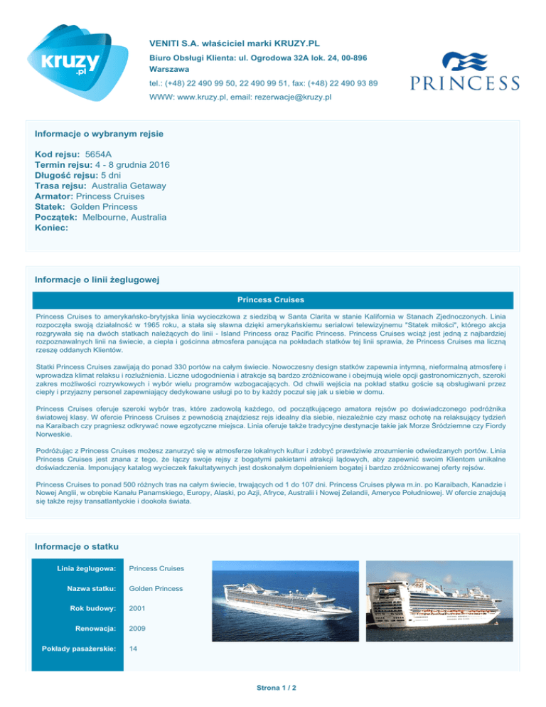 VENITI S.A. właściciel marki KRUZY.PL Biuro Obsługi Klienta: ul. Ogrodowa 32A lok. 24, 00-896 Warszawa tel.: (+48) 22 490 99 50, 22 490 99 51, fax: (+48) 22 490 93 89 WWW: www.kruzy.pl, email: [email protected] Informacje o wybranym rejsie Kod rejsu: 5654A Termin rejsu: 4 - 8 grudnia 2016 Długość rejsu: 5 dni Trasa rejsu: Australia Getaway Armator: Princess Cruises Statek: Golden Princess Początek: Melbourne, Australia Koniec: Informacje o linii żeglugowej Princess Cruises Princess Cruises to amerykańsko-brytyjska linia wycieczkowa z siedzibą w Santa Clarita w stanie Kalifornia w Stanach Zjednoczonych. Linia rozpoczęła swoją działalność w 1965 roku, a stała się sławna dzięki amerykańskiemu serialowi telewizyjnemu "Statek miłości", którego akcja rozgrywała się na dwóch statkach należących do linii - Island Princess oraz Pacific Princess. Princess Cruises wciąż jest jedną z najbardziej rozpoznawalnych linii na świecie, a ciepła i gościnna atmosfera panująca na pokładach statków tej linii sprawia, że Princess Cruises ma liczną rzeszę oddanych Klientów. Statki Princess Cruises zawijają do ponad 330 portów na całym świecie. Nowoczesny design statków zapewnia intymną, nieformalną atmosferę i wprowadza klimat relaksu i rozluźnienia. Liczne udogodnienia i atrakcje są bardzo zróżnicowane i obejmują wiele opcji gastronomicznych, szeroki zakres możliwości rozrywkowych i wybór wielu programów wzbogacających. Od chwili wejścia na pokład statku goście są obsługiwani przez ciepły i przyjazny personel zapewniający dedykowane usługi po to by każdy poczuł się jak u siebie w domu. Princess Cruises oferuje szeroki wybór tras, które zadowolą każdego, od początkującego amatora rejsów po doświadczonego podróżnika światowej klasy. W ofercie Princess Cruises z pewnością znajdziesz rejs idealny dla siebie, niezależnie czy masz ochotę na relaksujący tydzień na Karaibach czy pragniesz odkrywać nowe egzotyczne miejsca. Linia oferuje także tradycyjne destynacje takie jak Morze Śródziemne czy Fiordy Norweskie. Podróżując z Princess Cruises możesz zanurzyć się w atmosferze lokalnych kultur i zdobyć prawdziwie zrozumienie odwiedzanych portów. Linia Princess Cruises jest znana z tego, że łączy swoje rejsy z bogatymi pakietami atrakcji lądowych, aby zapewnić swoim Klientom unikalne doświadczenia. Imponujący katalog wycieczek fakultatywnych jest doskonałym dopełnieniem bogatej i bardzo zróżnicowanej oferty rejsów. Princess Cruises to ponad 500 różnych tras na całym świecie, trwających od 1 do 107 dni. Princess Cruises pływa m.in. po Karaibach, Kanadzie i Nowej Anglii, w obrębie Kanału Panamskiego, Europy, Alaski, po Azji, Afryce, Australii i Nowej Zelandii, Ameryce Południowej. W ofercie znajdują się także rejsy transatlantyckie i dookoła świata. Informacje o statku Linia żeglugowa: Princess Cruises Nazwa statku: Golden Princess Rok budowy: 2001 Renowacja: 2009 Pokłady pasażerskie: 14 Strona 1 / 2 Powered by TCPDF (www.tcpdf.org) Pasażerowie: 2600 osób Załoga: 1100 osób Tonaż: 109000 ton Szybkość: Długość: Szerokość: 22 węzłów 280 m 36 m Posiłki oraz napoje Do dyspozycji na pokładzie Kabiny 24-godzinne przekąski w Horizon Court, Anytime dining, Bernini Dining Room, Canaletto Dining Room, Donatello Dining Room, Lobby Bar i Patisserie, Players Cigar Bar, Prego Pizzeria, Promenade Lounge i Bar,, Sabatini's (restauracja włoska), Sterling Steakhouse, Sundaes ice cream bar (lodziarnia), Trident Grill (burgery i hot dogi), Ultimate Balcony Dining Wheelhouse Bar, popołudniowa herbatka Atlantis Casino, Explorers Lounge (klub nocny), ScholarShip@Sea (szkoła komputerowa), Vista Show Lounge biblioteka, czytelnia i sala gier, klub nocny Skywalkers (dyskoteka), sala gier video, Princess Theater światowej klasy galeria sztuki, aukcje dzieł sztuki, Centrum dziecięce (powyżej 3 lat), Centrum młodzieżowe basen dla dzieci, jacuzzi dla młodzieży, 9-dołkowy putting course, Calypso Reef i basen (z 2-ma jacuzzi) Neptune's Reef i basen (z 2-ma jacuzzi), Oasis bar i 2 jacuzzi, Shuffleboard, Terrace Pool, bieżnia do joggingu, boisko sportowe (koszykówka, siatkówka), cyfrowy symulator gry w golfa, stoły do ping-ponga Na statku znajduje się 366 kabin wewnętrznych, 930 kabin zewnętrznch w tym 712kabin z balkonami i apartamentów. Dla osób niepełnosprawnych przystosowano 21 kabin. Każda z kabin wyposażona jest w lodówkę, TV, suszarkę do włosów, mini sejf, luksusowe kołdry oraz bawełnianą egipską bieliznę pościelową. Strona 2 / 2
