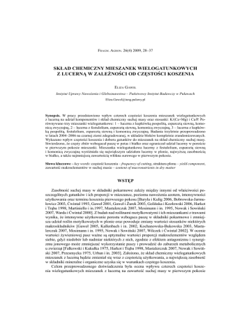 FRAGM. AGRON. 26(4) 2009, 28–37 SKŁAD CHEMICZNY MIESZANEK WIELOGATUNKOWYCH Z LUCERNĄ W ZALEŻNOŚCI OD CZĘSTOŚCI KOSZENIA ELIZA GAWEŁ Instytut Uprawy Nawożenia i Gleboznawstwa – Państwowy Instytut Badawczy w Puławach [email protected] Synopsis. W pracy przedstawiono wpływ czterech częstości koszenia mieszanek wielogatunkowych z lucerną na udział komponentów i skład chemiczny suchej masy oraz stosunki: K/(Ca+Mg) i Ca/P. Porównywano trzy mieszanki wielogatunkowe: 1 – lucerna z kupkówką pospolitą, esparcetą siewną, komonicą zwyczajną, 2 – lucerna z festulolium, esparcetą siewną, komonicą zwyczajną, 3 – lucerna z kupkówką pospolitą, festulolium, esparcetą siewną i komonicą zwyczajną. Badania trzyletnie przeprowadzono w latach 2004–2006 na czarnej ziemi zdegradowanej, w układzie bloków kompletnie zrandomizowanych. Wykazano wpływ częstości koszenia i doboru gatunków do mieszanek na skład chemiczny suchej masy. Stwierdzono, że częsty zbiór wzbogacał paszę w potas i białko oraz ograniczał udział lucerny w poroście w pierwszym pokosie mieszanki. Mieszanka wielogatunkowa lucerny z festulolium, esparcetą siewną i komonicą zwyczajną wyróżniała się największym udziałem lucerny w plonie, najwyższą zasobnością w białko, a także najmniejszą zawartością włókna surowego w pierwszym pokosie. Słowa kluczowe – key words: częstość koszenia – frequency of cutting, struktura plonu – yield component, zawartość makroelementów w suchej masie – content of macronutrients in dry matter WSTĘP Zasobność suchej masy w składniki pokarmowe zależy między innymi od właściwości poszczególnych gatunków i ich proporcji w mieszance, poziomu nawożenia azotem, intensywności użytkowania oraz terminu koszenia pierwszego pokosu [Baryła i Kulig 2006, Bobrowska-Jarmułowicz 2003, Ćwintal 1993, Gaweł 2001, Gaweł i Żurek 2003, Golińska i Kozłowski 2006, Harkot i Trąba 1998, Martiniello i in.1997, Mastalerczuk 2007, Mosimann i in. 1995, Nowak i Sowiński 2007, Warda i Ćwintal 2000]. Z badań nad roślinami motylkowatymi i ich mieszankami z trawami wynika, że intensywne użytkowanie porostu wzbogaca paszę w składniki pokarmowe i zmniejsza udział roślin motylkowatych w plonie oraz powoduje zmiany wartości stosunków niektórych makroskładników [Gaweł 2005, Kallenbach i in. 2002, Kochanowska-Bukowska 2003, Mastalerczuk 2007, Mosimann i in. 1995, Nowak i Sowiński 2007, Wilczek i Ćwintal 2002]. W ocenie wartości żywieniowej pasz ważne są optymalne wartości proporcji makroelementów względem siebie, gdyż niedobór lub nadmiar niektórych z nich, zgodnie z efektem antagonizmu i synergizmu jonowego może zmniejszać wykorzystanie paszy i prowadzić do zaburzeń metabolicznych u zwierząt [Falkowski i Kukułka 1975, Harkot i Trąba 1998, Mastalerczuk 2007, Nowak i Sowiński 2007, Przesmycka 1975, Urban i in. 2003]. Założono, że skład chemiczny wielogatunkowych mieszanek z lucerną będzie zmieniał się wraz z częstością użytkowania, a największą zasobność w składniki mineralne i organiczne uzyska się w warunkach częstego koszenia. Celem przeprowadzonego doświadczenia była ocena wpływu czterech częstości koszenia wielogatunkowych mieszanek z lucerną na zawartość suchej masy w pierwszym pokosie Skład chemiczny mieszanek wielogatunkowych z lucerną w zależności.... 29 w makroelementy, białko ogólne, włókno surowe oraz na proporcje niektórych makroskładników – K/(Ca+Mg) i Ca/P. MATERIAŁ I METODY Ścisłe doświadczenie polowe realizowano w latach 2004–2006 w RZD IUNG–PIB Grabów, woj. mazowieckie (51°21’N, 21°40’E). Mieszanki wielogatunkowe uprawiano na powierzchni 0,3 ha, na czarnej ziemi zdegradowanej (pgm.gl). Doświadczenie dwuczynnikowe założono w trzeciej dekadzie kwietnia 2004 r., w siewie czystym, w układzie bloków kompletnie zrandomizowanych, w trzech replikacjach. W roku siewu zebrano plon zielonki z dwóch pokosów. W latach pełnego użytkowania mieszanki koszono z częstością co: 21, 28, 35 i 42 dni po zbiorze pokosu wyrównawczego w fazie początku pąkowania lucerny (czynnik I). Obiektami czynnika drugiego były trzy mieszanki wielogatunkowe lucerny z trawami i roślinami motylkowatymi: 1 – lucerna (11,5 kg·ha-1) + kupkówka pospolita (8,8 kg·ha-1) + esparceta siewna (10 kg·ha-1) + komonica zwyczajna (4,4 kg·ha-1); 2 – lucerna (11,5 kg·ha-1) + festulolium (16,4 kg·ha-1) + esparceta siewna (10 kg·ha-1) + komonica zwyczajna (4,4 kg·ha-1); 3 – lucerna (11,5 kg·ha-1) + kupkówka pospolita (4,4 kg·ha-1) + festulolium (8,2 kg·ha-1) + esparceta siewna (10 kg·ha-1) + komonica zwyczajna (4,4 kg·ha-1). W mieszankach uprawiano lucernę mieszańcową odmiany Radius, kupkówkę pospolitą odmiany Armena, festulolium – Felopa, esparcetę siewną – Taja i komonicę zwyczajną – Skrzeszowicka. Przedsiewne nawożenie mineralne mieszanek wynosiło 30 kg N·ha-1, 60 kg P·ha-1 oraz 60 kg K·ha-1. Po zbiorze pierwszego pokosu w roku siewu na mieszanki wysiano azot w ilości 30 kg N·ha-1. W latach pełnego użytkowania wiosną zastosowano 30 kg N·ha-1, 80 kg P·ha–1 i 40 kg K·ha-1. Po zbiorze pierwszego pokosu mieszanki nawożono dawką 40 kg K·ha-1. Nawożenie azotem w dawce 30 kg N·ha-1 stosowano po wszystkich przeprowadzonych pokosach z wyjątkiem ostatniego w każdym roku badań. W roku siewu i z pokosu wyrównawczego w latach pełnego użytkowania z zebranej zielonki z powierzchni całego doświadczenia (0,3 ha) przygotowano sianokiszonkę w belach owijanych folią z podsuszaniem zielonki na pokosie. W roku siewu mieszanki wielogatunkowe przykoszono po raz pierwszy w połowie czerwca, a następnie w dniu 1.07.2004 r. w celu likwidacji zachwaszczenia, następnie w fazie początku pąkowania lucerny zebrano dwa pokosy mieszanek (11.08.2004 r. – I pokos, 07.10.2004 r. – II pokos). W latach użytkowania pokos wyrównawczy wykonano 