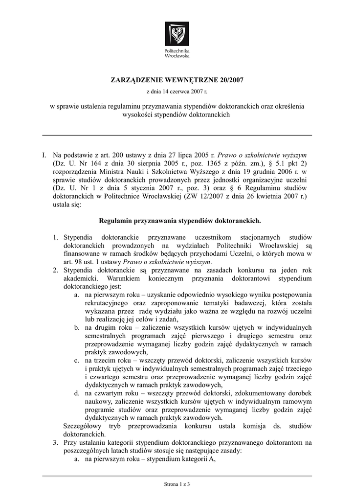 ZARZĄDZENIE WEWNĘTRZNE 20/2007 z dnia 14 czerwca 2007 r. w sprawie ustalenia regulaminu przyznawania stypendiów doktoranckich oraz określenia wysokości stypendiów doktoranckich I. Na podstawie z art. 200 ustawy z dnia 27 lipca 2005 r. Prawo o szkolnictwie wyższym (Dz. U. Nr 164 z dnia 30 sierpnia 2005 r., poz. 1365 z późn. zm.), § 5.1 pkt 2) rozporządzenia Ministra Nauki i Szkolnictwa Wyższego z dnia 19 grudnia 2006 r. w sprawie studiów doktoranckich prowadzonych przez jednostki organizacyjne uczelni (Dz. U. Nr 1 z dnia 5 stycznia 2007 r., poz. 3) oraz § 6 Regulaminu studiów doktoranckich w Politechnice Wrocławskiej (ZW 12/2007 z dnia 26 kwietnia 2007 r.) ustala się: Regulamin przyznawania stypendiów doktoranckich. 1. Stypendia doktoranckie przyznawane uczestnikom stacjonarnych studiów doktoranckich prowadzonych na wydziałach Politechniki Wrocławskiej są finansowane w ramach środków będących przychodami Uczelni, o których mowa w art. 98 ust. 1 ustawy Prawo o szkolnictwie wyższym. 2. Stypendia doktoranckie są przyznawane na zasadach konkursu na jeden rok akademicki. Warunkiem koniecznym przyznania doktorantowi stypendium doktoranckiego jest: a. na pierwszym roku – uzyskanie odpowiednio wysokiego wyniku postępowania rekrutacyjnego oraz zaproponowanie tematyki badawczej, która została wykazana przez radę wydziału jako ważna ze względu na rozwój uczelni lub realizację jej celów i zadań, b. na drugim roku – zaliczenie wszystkich kursów ujętych w indywidualnych semestralnych programach zajęć pierwszego i drugiego semestru oraz przeprowadzenie wymaganej liczby godzin zajęć dydaktycznych w ramach praktyk zawodowych, c. na trzecim roku – wszczęty przewód doktorski, zaliczenie wszystkich kursów i praktyk ujętych w indywidualnych semestralnych programach zajęć trzeciego i czwartego semestru oraz przeprowadzenie wymaganej liczby godzin zajęć dydaktycznych w ramach praktyk zawodowych, d. na czwartym roku – wszczęty przewód doktorski, zdokumentowany dorobek naukowy, zaliczenie wszystkich kursów ujętych w indywidualnym ramowym programie studiów oraz przeprowadzenie wymaganej liczby godzin zajęć dydaktycznych w ramach praktyk zawodowych. Szczegółowy tryb przeprowadzania konkursu ustala komisja ds. studiów doktoranckich. 3. Przy ustalaniu kategorii stypendium doktoranckiego przyznawanego doktorantom na poszczególnych latach studiów stosuje się następujące zasady: a. na pierwszym roku – stypendium kategorii A, Strona 1 z 3 b. na drugim roku – stypendium kategorii A, gdy doktorant nie ma wszczętego przewodu doktorskiego, stypendium kategorii B, gdy doktorant ma wszczęty przewód doktorski, c. na trzecim roku – stypendium kategorii B, gdy doktorant nie posiada zdokumentowanego dorobku naukowego, kategorii C, gdy posiada zdokumentowany dorobek naukowy, d. na czwartym roku – stypendium kategorii C, e. w przypadku przedłużenia okresu odbywania studiów doktoranckich w trybie, o którym mowa w § 4 ust. 1 i § 6 ust. 5 Regulaminu studiów doktoranckich, doktorant może otrzymać wyłącznie stypendium kategorii A. 4. Stypendia doktoranckie są przyznawane ze środków finansowych: a. przekazanych do dyspozycji wydziału. Dziekani w porozumieniu z kierownikami innych jednostek organizacyjnych określają liczbę proponowanych stypendiów dla poszczególnych dyscyplin lub dyscyplin i specjalności dla osób, które rozpoczną studia doktorancie w danym roku akademickim, oraz wydzielają w budżecie wydziału na dany rok środki finansowe na planowane i wypłacane przez wydział stypendia doktoranckie. b. pozostających w dyspozycji Rektora najlepszym doktorantom, którzy podejmują badania kreujące nowe, priorytetowe kierunki nauki. Liczbę tych stypendiów na poszczególnych wydziałach określa Rektor. 5. Decyzje o przyznaniu stypendium podejmuje Rektor na wniosek doktoranta, zawierający oświadczenie o wykonywaniu pracy zarobkowej, zaopiniowany przez kierownika studiów doktoranckich (wzór – załączniki nr 1 i nr 2). Propozycje dotyczące przyznania stypendiów oraz sposobów ich finansowania, o których mowa w ust. 4, Rektorowi przedstawia kierownik studiów doktoranckich zgodnie z wytycznymi rady wydziału. 6. Stypendia na dany rok akademicki są przyznawane w trzech kategoriach oznaczonych literami A, B i C, w zróżnicowanej wysokości z zachowaniem postanowień art. 200 ust. 2 ustawy. Wysokości stypendiów w danym roku akademickim w poszczególnych kategoriach są ustalane przed rozpoczęciem roku akademickiego. 7. Wypłata stypendium dokonywana w semestrze zimowym obejmuje miesiące: październik, listopad, grudzień, styczeń, luty i marzec, wypłata stypendium dokonywana w semestrze letnim obejmuje miesiące: kwiecień, maj, czerwiec, lipiec, sierpień i wrzesień. Zmiana kategorii stypendium może nastąpić wyłącznie z początkiem kolejnego semestru. 8. Przyznane doktorantowi stypendium może zostać cofnięte w trakcie roku akademickiego od dowolnego miesiąca, z zachowaniem postanowień § 6 ust. 7 Regulaminu studiów doktoranckich. Cofnięte stypendium nie podlega wznowieniu. Doktorant, któremu cofnięto stypendium, jest w rozumieniu Regulaminu studiów doktoranckich doktorantem nieotrzymującym stypendium. 9. Doktorant, który przedłoży rozprawę doktorską, zachowuje prawo do stypendium na niniejszych zasadach, jednak nie dłużej niż do końca miesiąca, w którym zostanie nadany mu stopień naukowy doktora. 10. Doktorat otrzymujący stypendium doktoranckie może podejmować pracę zarobkową wyłącznie w niepełnym wymiarze czasu pracy. Wykonywanie pracy zarobkowej nie może kolidować z zajęciami wynikającymi z programu studiów. W przypadku podjęcia pracy zarobkowej po przyznaniu stypendium, doktorant składa niezwłocznie kierownikowi studiów doktoranckich oświadczenie o wymiarze czasu pracy i wysokości dochodów uzyskiwanych w związku z wykonywaniem tej pracy. II. Zgodnie z art. 20
