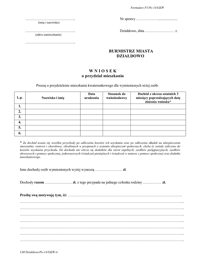 Formularz F1/Po-14/GKW ………………………………….. Nr sprawy ………………..................... (imię i nazwisko) ………………………………….. Działdowo, dnia …………………… r. (adres zamieszkania) ………………………………….. BURMISTRZ MIASTA DZIAŁDOWO WNIOSEK o przydział mieszkania Proszę o przydzielenie mieszkania kwaterunkowego dla wymienionych niżej osób: L.p. Nazwisko i imię Data urodzenia Stosunek do wnioskodawcy Dochód z okresu ostatnich 3 miesięcy poprzedzających datę złożenia wniosku* 1. 2. 3. 4. 5. 6. * Za dochód uważa się wszelkie przychody po odliczeniu kosztów ich uzyskania oraz po odliczeniu składek na ubezpieczenia emerytalne, rentowe i chorobowe, określonych w przepisach o systemie ubezpieczeń społecznych, chyba że zostały zaliczone do kosztów uzyskania przychodu. Do dochodu nie wlicza się dodatków dla sierot zupełnych, zasiłków pielęgnacyjnych, zasiłków okresowych z pomocy społecznej, jednorazowych świadczeń pieniężnych i świadczeń w naturze z pomocy społecznej oraz dodatku mieszkaniowego. Inne dochody osób wymienionych wyżej wynoszą …………………. zł. Dochody razem …………………. zł, z tego przypada na jednego członka rodziny …………… zł. Prośbę swą motywuję tym, iż: ………………………………………………………………………………… …………………………………………………………………………………………………………………….. …………………………………………………………………………………………………………………….. …………………………………………………………………………………………………………………….. …………………………………………………………………………………………………………………….. …………………………………………………………………………………………………………………….. …………………………………………………………………………………………………………………….. …………………………………………………………………………………………………………………….. UM Działdowo/Po-14/GKW-A Formularz F1/Po-14/GKW Jednocześnie informuję: 1. Najemcą (członkiem spółdzielni) mieszkania, w którym zamieszkuję jest Pan(i) ………………………………………………………………………………………………………………… 2. Osobami zamieszkałymi dotychczas ze mną są osoby wymienione w powyższej tabeli oraz osoby: ………………………………………………………………………………………………………………… ………………………………………………………………………………………………………………… 3. Zajmowane obecnie mieszkanie jest mieszkaniem*: ¨ kwaterunkowym ¨ służbowym 4. Mieszkanie:: a) położone jest w budynku*: ¨ spółdzielczym ¨ innym: ……………………………………… ¨ mieszkalnym ¨ mieszkalnym przeznaczonym do rozbiórki (z uwagi na stan zagrożenia, pod inwestycję) b) jest rozkładowo – przechodne c) składa się z kuchni o powierzchni.: ……… m2 oraz ……… pokoi o powierzchni każdego pokoju: 1) …………. m2, 2) …………. m2, 3) …………. m2, 4) …………. m2. Obejmuje powierzchnię użytkową: ……….. m2. 5. Mieszkanie zajmowane jest*: ¨ L. p. ¨ samodzielnie Powierzchnia Nazwisko i imię wspólnie w następujący sposób: Liczba zam. osób Uwagi 1. 2. 3. 4. 5. 6. Kuchnia użytkowana jest*: ¨ ¨ samodzielnie wspólnie przez: ……………………………………………………………………………………….. 7. Mieszkanie położone jest na*: ¨ parterze ¨ 1 piętrze ¨ 2 piętrze ¨ 3 piętrze ¨ 4 piętrze 8. Mieszkanie wyposażone jest w instalację*: ¨ ¨ 9. wodną kanalizacyjną ¨ gazową ¨ CO ¨ WC ¨ łazienkę Okres zamieszkiwania: …………………………… ……………………………………………. (podpis wnioskodawcy) Potwierdzam zgodność danych dotyczących zamieszkiwania wnioskodawcy ubiegającego się o przydział mieszkania spółdzielczego, kwaterunkowego. ……………………………………………. Załączniki: . (podpis administratora domu) 1. Zaświadczenie z zakładu pracy o wysokości osiąganych dochodów. 2. Zaświadczenie z Powiatowego Urzędu Pracy potwierdzające status osoby bezrobotne * właściwe zakreślić ”x” UM Działdowo/Po-14/GKW-A