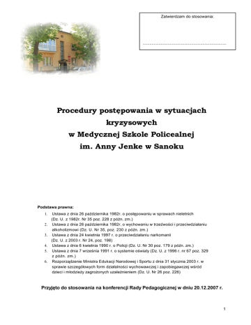 Zatwierdzam do stosowania: .......................................................................... Procedury postępowania w sytuacjach kryzysowych w Medycznej Szkole Policealnej im. Anny Jenke w Sanoku Podstawa prawna: 1. 2. 3. 4. 5. 6. Ustawa z dnia 26 października 1982r. o postępowaniu w sprawach nieletnich (Dz. U. z 1982r. Nr 35 poz. 228 z późn. zm.) Ustawa z dnia 26 października 1982r. o wychowaniu w trzeźwości i przeciwdziałaniu alkoholizmowi (Dz. U. Nr 35, poz. 230 z późn. zm.) Ustawa z dnia 24 kwietnia 1997 r. o przeciwdziałaniu narkomanii (Dz. U. z 2003 r. Nr 24, poz. 198) Ustawa z dnia 6 kwietnia 1990 r. o Policji (Dz. U. Nr 30 poz. 179 z późn. zm.) Ustawa z dnia 7 września 1991 r. o systemie oświaty (Dz. U. z 1996 r. nr 67 poz. 329 z późn. zm.) Rozporządzenie Ministra Edukacji Narodowej i Sportu z dnia 31 stycznia 2003 r. w sprawie szczegółowych form działalności wychowawczej i zapobiegawczej wśród dzieci i młodzieży zagrożonych uzależnieniem (Dz. U. Nr 26 poz. 226) Przyjęto do stosowania na konferencji Rady Pedagogicznej w dniu 20.12.2007 r. 1 Strategia działań wychowawczych, zapobiegawczych oraz interwencyjnych wobec młodzieży zagrożonej uzależnieniem. I. W przypadku uzyskania informacji, że słuchacz, który nie ukończył 18 lat, używa alkoholu lub innych środków w celu wprowadzenia się w stan odurzenia, uprawia nierząd, bądź przejawia inne zachowania świadczące o demoralizacji, nauczyciel podejmuje następujące działania: 1. Przekazuje uzyskaną informację wychowawcy klasy oraz koordynatorowi ds. bezpieczeństwa. 2. Wychowawca lub koordynator ds. bezpieczeństwa: - informuje dyrektora szkoły - wzywa do szkoły rodziców (prawnych opiekunów) słuchacza, przekazuje uzyskaną informację, przeprowadza w ich obecności rozmowę ze słuchaczem. W przypadku potwierdzenia informacji, zobowiązuje ucznia do zmiany zachowania, a rodziców do szczególnego nadzoru nad dzieckiem. Może zaproponować rodzicom skierowanie dziecka do placówki specjalistycznej. 3. Jeżeli rodzice odmawiają współpracy, lub nie stawiają się do szkoły, a przejawy demoralizacji trwają nadal, szkoła pisemnie powiadamia sąd rodzinny lub policję. Podobne działania podejmuje szkoła w sytuacji, gdy wykorzystała już wszystkie dostępne środki oddziaływań wychowawczych, a ich zastosowanie nie przynosi oczekiwanych rezultatów. 4. Jeżeli szkoła uzyskała informację o popełnieniu przestępstwa ściganego z urzędu, lub udziału w grupach przestępczych przez słuchacza, który ukończył 17 lat, powiadamia niezwłocznie prokuratora lub policję. II. W przypadku, gdy nauczyciel podejrzewa, że na terenie szkoły znajduje się słuchacz, będący pod wpływem alkoholu lub narkotyków, podejmuje następujące działania: 1. Odizolować słuchacza od reszty klasy, ale ze względów bezpieczeństwa nie pozostawiać go samego, stworzyć warunki, w których nie będzie zagrożone jego życie ani zdrowie. 2. Powiadamia o swoich przypuszczeniach wychowawcę klasy lub koordynatora ds. bezpieczeństwa. 3. Wzywa lekarza w celu stwierdzenia stanu trzeźwości lub odurzenia, ewentualnie udzielenia pomocy medycznej. 4. Zawiadamia dyrektora szkoły oraz rodziców (prawnych opiekunów), których zobowiązuje do niezwłocznego odebrania słuchacza ze szkoły. 2 Gdy rodzice/opiekunowie odmówią odebrania słuchacza, o dalszym z nim postępowaniu decyduje lekarz, po ustaleniu aktualnego stanu zdrowia i w porozumieniu z dyrektorem szkoły. 5. Jeśli słuchacz jest pod wpływem alkoholu, a rodzice/opiekunowie odmawiają przyjścia do szkoły, dyrektor szkoły zawiadamia najbliższą jednostkę policji. Gdy uczeń będący pod wpływem alkoholu zachowuje się agresywnie, lub daje powód do zgorszenia, względnie zagraża życiu lub zdrowiu innych osób, policja może przewieźć go do izby wytrzeźwień, albo do policyjnych pomieszczeń dla osób zatrzymanych, na czas niezbędny do wytrzeźwienia ( maksymalnie 24 godziny). O tym fakcie zawiadamia się rodziców/opiekunów. 6. Jeśli powtarzają się przypadki, w których uczeń przed ukończeniem 18 lat znajduje się na terenie szkoły pod wpływem narkotyków lub alkoholu, szkoła obligatoryjnie powiadamia policję ( specjalistę ds. nieletnich ). 7. Spożywanie alkoholu na terenie szkoły przez słuchacza, który ukończył 17 lat, stanowi wykroczenie z art. 43 ust. 1 Ustawy z 26 października 1982r. o wychowaniu w trzeźwości i przeciwdziałaniu alkoholizmowi. Należy o tym fakcie powiadomić policję. Dalszy tok postępowania leży w kompetencji tej instytucji III. Jeśli nauczyciel znajdzie na terenie szkoły substancje przypominającą wyglądem narkotyk, podejmuje następujące działania: 1. Zachowując środki ostrożności zabezpiecza substancję przed dostępem do niej osób niepowołanych oraz ewentualnym jej zniszczeniem do czasu przyjazdu policji. Jeśli to możliwe, próbuje ustalić, do kogo należy znaleziona substancja. 2. Powiadamia o zaistniałym zdarzeniu dyrektora szkoły, który wzywa policję. 3. Po przyjeździe policji niezwłocznie przekazuje zabezpieczoną substancję i przekazuje informacje dotyczące szczegółów zdarzenia. IV. W przypadku, gdy nauczyciel podejrzewa, że uczeń posiada przy sobie substancję przypominającą narkotyk, podejmuje następujące działania: 1. W obecności innej osoby (wychowawca, pedagog, dyrektor) nauczyciel ma prawo żądać, aby słuchacz przekazał mu tę substancję, pokazał zawartość plecaka szkolnego oraz kieszeni (we własnej odzieży), ewentualnie innych przedmiotów budzących podejrzenie co do ich związku z poszukiwaną substancją. Nauczyciel nie ma prawa 3 wykonać czynności przeszukania odzieży ani teczki słuchacza – jest to czynność zastrzeżona wyłącznie dla policji. 2. Nauczyciel powiadamia dyrektora szkoły oraz rodziców/opiekunów - wzywa ich do natychmiastowego stawiennictwa. 3. Gdy słuchacz mimo wezwania odmawia przek