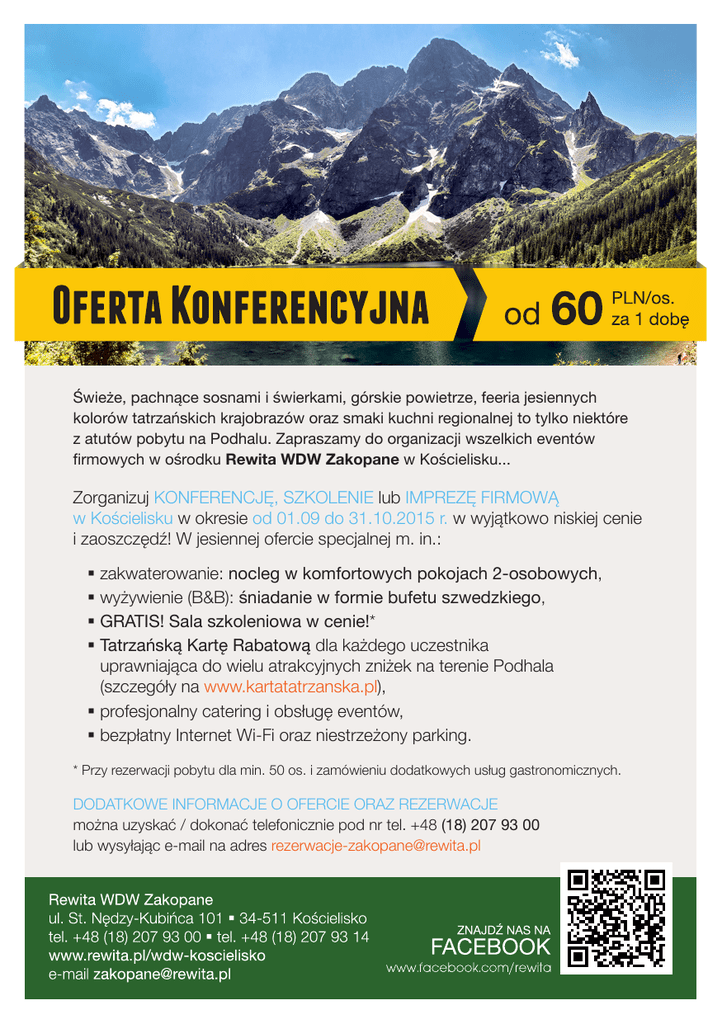 Świeże, pachnące sosnami i świerkami, górskie powietrze, feeria jesiennych kolorów tatrzańskich krajobrazów oraz smaki kuchni regionalnej to tylko niektóre z atutów pobytu na Podhalu. Zapraszamy do organizacji wszelkich eventów firmowych w ośrodku Rewita WDW Zakopane w Kościelisku... Zorganizuj KONFERENCJĘ, SZKOLENIE lub IMPREZĘ FIRMOWĄ w Kościelisku w okresie od 01.09 do 31.10.2015 r. w wyjątkowo niskiej cenie i zaoszczędź! W jesiennej ofercie specjalnej m. in.: zakwaterowanie: nocleg w komfortowych pokojach 2-osobowych, wyżywienie (B&B): śniadanie w formie bufetu szwedzkiego, GRATIS! Sala szkoleniowa w cenie!* Tatrzańską Kartę Rabatową dla każdego uczestnika uprawniająca do wielu atrakcyjnych zniżek na terenie Podhala (szczegóły na www.kartatatrzanska.pl), profesjonalny catering i obsługę eventów, bezpłatny Internet Wi-Fi oraz niestrzeżony parking. * Przy rezerwacji pobytu dla min. 50 os. i zamówieniu dodatkowych usług gastronomicznych. DODATKOWE INFORMACJE O OFERCIE ORAZ REZERWACJE można uzyskać / dokonać telefonicznie pod nr tel. +48 (18) 207 93 00 lub wysyłając e-mail na adres [email protected]