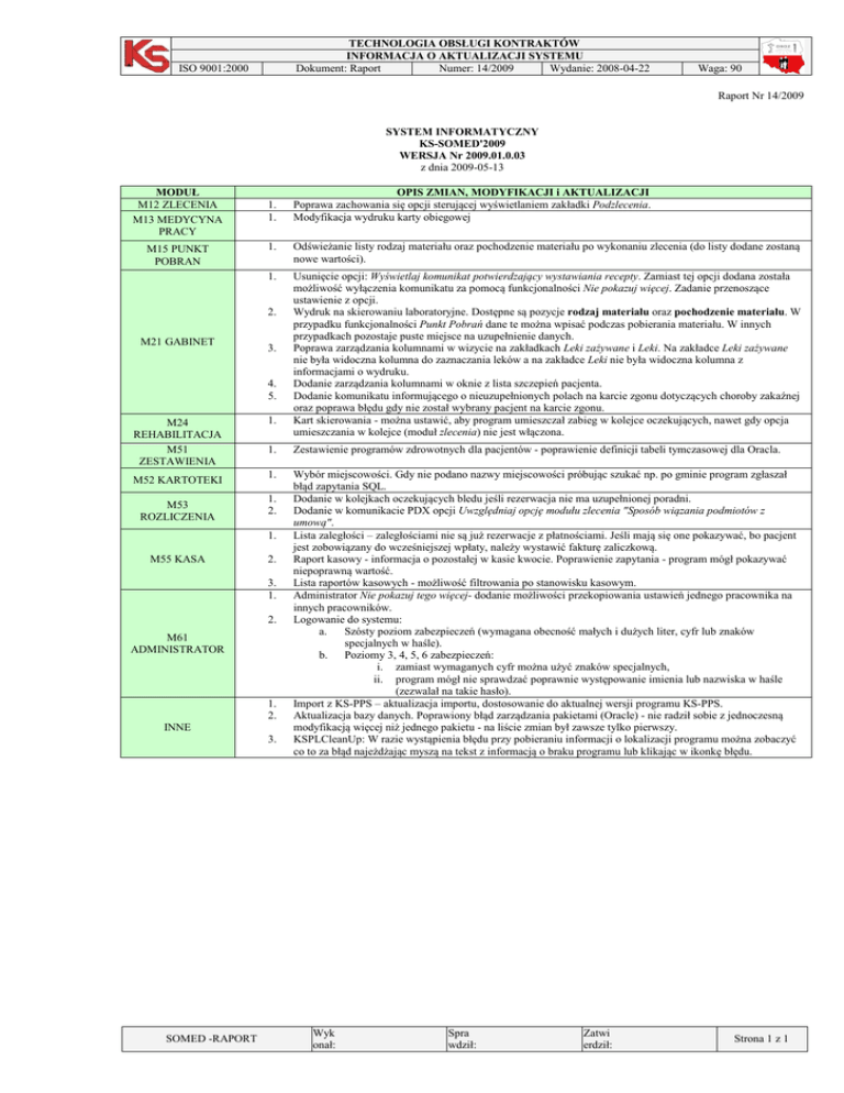 TECHNOLOGIA OBSŁUGI KONTRAKTÓW INFORMACJA O AKTUALIZACJI SYSTEMU Dokument: Raport Numer: 14/2009 Wydanie: 2008-04-22 ISO 9001:2000 Waga: 90 Raport Nr 14/2009 SYSTEM INFORMATYCZNY KS-SOMED'2009 WERSJA Nr 2009.01.0.03 z dnia 2009-05-13 MODUŁ M12 ZLECENIA M13 MEDYCYNA PRACY M15 PUNKT POBRAN 1. 1. 1. Odświeżanie listy rodzaj materiału oraz pochodzenie materiału po wykonaniu zlecenia (do listy dodane zostaną nowe wartości). 1. Usunięcie opcji: Wyświetlaj komunikat potwierdzający wystawiania recepty. Zamiast tej opcji dodana została możliwość wyłączenia komunikatu za pomocą funkcjonalności Nie pokazuj więcej. Zadanie przenoszące ustawienie z opcji. Wydruk na skierowaniu laboratoryjne. Dostępne są pozycje rodzaj materiału oraz pochodzenie materiału. W przypadku funkcjonalności Punkt Pobrań dane te można wpisać podczas pobierania materiału. W innych przypadkach pozostaje puste miejsce na uzupełnienie danych. Poprawa zarządzania kolumnami w wizycie na zakładkach Leki zażywane i Leki. Na zakładce Leki zażywane nie była widoczna kolumna do zaznaczania leków a na zakładce Leki nie była widoczna kolumna z informacjami o wydruku. Dodanie zarządzania kolumnami w oknie z lista szczepień pacjenta. Dodanie komunikatu informującego o nieuzupełnionych polach na karcie zgonu dotyczących choroby zakaźnej oraz poprawa błędu gdy nie został wybrany pacjent na karcie zgonu. Kart skierowania - można ustawić, aby program umieszczał zabieg w kolejce oczekujących, nawet gdy opcja umieszczania w kolejce (moduł zlecenia) nie jest włączona. 2. M21 GABINET 3. 4. 5. M24 REHABILITACJA M51 ZESTAWIENIA M52 KARTOTEKI M53 ROZLICZENIA 1. 1. Zestawienie programów zdrowotnych dla pacjentów - poprawienie definicji tabeli tymczasowej dla Oracla. 1. Wybór miejscowości. Gdy nie podano nazwy miejscowości próbując szukać np. po gminie program zgłaszał błąd zapytania SQL. Dodanie w kolejkach oczekujących bledu jeśli rezerwacja nie ma uzupełnionej poradni. Dodanie w komunikacie PDX opcji Uwzględniaj opcję modułu zlecenia "Sposób wiązania podmiotów z umową". Lista zaległości – zaległościami nie są już rezerwacje z płatnościami. Jeśli mają się one pokazywać, bo pacjent jest zobowiązany do wcześniejszej wpłaty, należy wystawić fakturę zaliczkową. Raport kasowy - informacja o pozostałej w kasie kwocie. Poprawienie zapytania - program mógł pokazywać niepoprawną wartość. Lista raportów kasowych - możliwość filtrowania po stanowisku kasowym. Administrator Nie pokazuj tego więcej- dodanie możliwości przekopiowania ustawień jednego pracownika na innych pracowników. Logowanie do systemu: a. Szósty poziom zabezpieczeń (wymagana obecność małych i dużych liter, cyfr lub znaków specjalnych w haśle). b. Poziomy 3, 4, 5, 6 zabezpieczeń: i. zamiast wymaganych cyfr można użyć znaków specjalnych, ii. program mógł nie sprawdzać poprawnie występowanie imienia lub nazwiska w haśle (zezwalał na takie hasło). Import z KS-PPS – aktualizacja importu, dostosowanie do aktualnej wersji programu KS-PPS. Aktualizacja bazy danych. Poprawiony błąd zarządzania pakietami (Oracle) - nie radził sobie z jednoczesną modyfikacją więcej niż jednego pakietu - na liście zmian był zawsze tylko pierwszy. KSPLCleanUp: W razie wystąpienia błędu przy pobieraniu informacji o lokalizacji programu można zobaczyć co to za błąd najeżdżając myszą na tekst z informacją o braku programu lub klikając w ikonkę błędu. 1. 2. 1. M55 KASA 2. 3. 1. 2. M61 ADMINISTRATOR 1. 2. INNE 3. SOMED -RAPORT OPIS ZMIAN, MODYFIKACJI i AKTUALIZACJI Poprawa zachowania się opcji sterującej wyświetlaniem zakładki Podzlecenia. Modyfikacja wydruku karty obiegowej Wyk onał: Spra wdził: Zatwi erdził: Strona 1 z 1