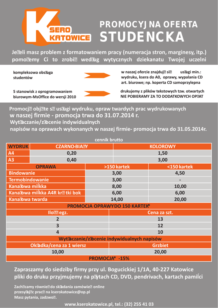 PROMOCYJNA OFERTA STUDENCKA Jeżeli masz problem z formatowaniem pracy (numeracja stron, marginesy, itp.) pomożemy Ci to zrobić według wytycznych dziekanatu Twojej uczelni kompleksowa obsługa studentów w naszej ofercie znajdują się usługi min.: wydruku, ksera do A0, oprawy, wypalania CD art. biurowe; np. koperta CD samoprzylepna 5 stanowisk z oprogramowaniem biurowym-MsOffice do wersji 2010 drukujemy z plików tekstowych tzw. otwartych NIE POBIERAMY ZA TO DODATKOWYCH OPŁAT Promocją objęte są usługi wydruku, opraw twardych prac wydrukowanych w naszej firmie - promocja trwa do 31.07.2014 r. Wytłaczanie/złocenie indywidualnych napisów na oprawach wykonanych w naszej firmie- promocja trwa do 31.05.2014r. cennik brutto WYDRUK A4 A3 CZARNO-BIAŁY 0,20 0,40 OPRAWA KOLOROWY 1,50 3,00 >150 kartek <150 kartek Bindowanie 3,00 4,50 Termobindowanie 3,00 Kanałowa miÍkka 8,00 10,00 Kanałowa miÍkka A4R krŰtki bok 6,00 6,00 Kanałowa twarda 14,00 20,00 PROMOCJA OPRAWY DO 150 KARTEK* Ilość egz. Cena za szt. 2 13 3 12 4 10 Wytłaczanie/złocenie indywidualnych napisów Okładka/cena za 1 wiersz Grzbiet 10,00 20,00 PROMOCJA* -15% Zapraszamy do siedziby firmy przy ul. Bogucickiej 1/1A, 40-227 Katowice pliki do druku przyjmujemy na płytach CD, DVD, pendrivach, kartach pamiÍci Zachęcamy również do składania zamówień online przesyłając pracę na [email protected] Masz pytania, zadzwoń. www.kserokatowice.pl, tel.: (32) 255 41 03