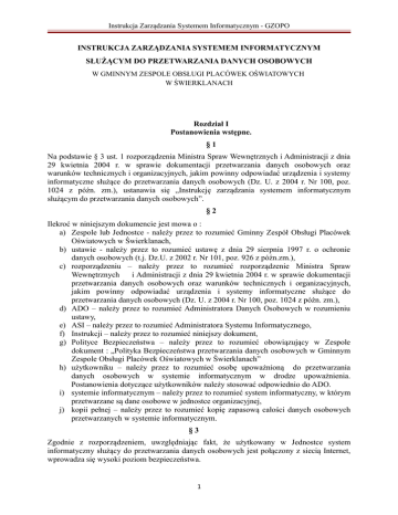 Instrukcja Zarządzania Systemem Informatycznym - GZOPO INSTRUKCJA ZARZĄDZANIA SYSTEMEM INFORMATYCZNYM SŁUŻĄCYM DO PRZETWARZANIA DANYCH OSOBOWYCH W GMINNYM ZESPOLE OBSŁUGI PLACÓWEK OŚWIATOWYCH W ŚWIERKLANACH Rozdział I Postanowienia wstępne. §1 Na podstawie § 3 ust. 1 rozporządzenia Ministra Spraw Wewnętrznych i Administracji z dnia 29 kwietnia 2004 r. w sprawie dokumentacji przetwarzania danych osobowych oraz warunków technicznych i organizacyjnych, jakim powinny odpowiadać urządzenia i systemy informatyczne służące do przetwarzania danych osobowych (Dz. U. z 2004 r. Nr 100, poz. 1024 z późn. zm.), ustanawia się „Instrukcję zarządzania systemem informatycznym służącym do przetwarzania danych osobowych”. §2 Ilekroć w niniejszym dokumencie jest mowa o : a) Zespole lub Jednostce - należy przez to rozumieć Gminny Zespół Obsługi Placówek Oświatowych w Świerklanach, b) ustawie - należy przez to rozumieć ustawę z dnia 29 sierpnia 1997 r. o ochronie danych osobowych (t.j. Dz.U. z 2002 r. Nr 101, poz. 926 z późn.zm.), c) rozporządzeniu – należy przez to rozumieć rozporządzenie Ministra Spraw Wewnętrznych i Administracji z dnia 29 kwietnia 2004 r. w sprawie dokumentacji przetwarzania danych osobowych oraz warunków technicznych i organizacyjnych, jakim powinny odpowiadać urządzenia i systemy informatyczne służące do przetwarzania danych osobowych (Dz. U. z 2004 r. Nr 100, poz. 1024 z późn. zm.), d) ADO – należy przez to rozumieć Administratora Danych Osobowych w rozumieniu ustawy, e) ASI – należy przez to rozumieć Administratora Systemu Informatycznego, f) Instrukcji – należy przez to rozumieć niniejszy dokument, g) Polityce Bezpieczeństwa – należy przez to rozumieć obowiązujący w Zespole dokument : „Polityka Bezpieczeństwa przetwarzania danych osobowych w Gminnym Zespole Obsługi Placówek Oświatowych w Świerklanach” h) użytkowniku – należy przez to rozumieć osobę upoważnioną do przetwarzania danych osobowych w systemie informatycznym w drodze upoważnienia. Postanowienia dotyczące użytkowników należy stosować odpowiednio do ADO. i) systemie informatycznym – należy przez to rozumieć system informatyczny, w którym przetwarzane są dane osobowe w jednostce organizacyjnej, j) kopii pełnej – należy przez to rozumieć kopię zapasową całości danych osobowych przetwarzanych w systemie informatycznym. §3 Zgodnie z rozporządzeniem, uwzględniając fakt, że użytkowany w Jednostce system informatyczny służący do przetwarzania danych osobowych jest połączony z siecią Internet, wprowadza się wysoki poziom bezpieczeństwa. 1 Instrukcja Zarządzania Systemem Informatycznym - GZOPO Rozdział II Stosowane procedury i osoby odpowiedzialne. Metody i środki uwierzytelniania. §4 Procedury nadawania uprawnień do przetwarzania danych i rejestrowania tych uprawnień w systemie informatycznym określa się w następujący sposób : a) Użytkownik zamierzający przetwarzać dane osobowe, po uzyskaniu upoważnienia (wg wzoru stanowiącego załącznik nr 3 do Polityki Bezpieczeństwa) oraz podpisaniu oświadczenia (wg wzoru stanowiącego załącznik nr 4 do Polityki Bezpieczeństwa), składa ustnie wniosek do ASI o nadanie identyfikatora i hasła w celu umożliwienia przetwarzania danych osobowych w systemie informatycznym. ASI zobowiązany jest niezwłocznie przydzielić użytkownikowi identyfikator i hasło. Podanie użytkownikowi hasła nie może nastąpić w sposób umożliwiający zapoznanie się z tym hasłem osobom trzecim. b) W przypadku wygaśnięcia przesłanek uprawniających użytkownika do przetwarzania danych osobowych, w szczególności cofnięcia upoważnienia, ASI zobowiązany jest do dopełnienia czynności uniemożliwiających ponowne wykorzystanie identyfikatora użytkownika, którego uprawnienia wygasły. §5 Stosuje się następujące metody oraz środki uwierzytelniania, a także procedury związane z ich zarządzaniem i użytkowaniem : a) hasło składa się z co najmniej 8 znaków, zawiera małe i wielkie litery oraz cyfry lub znaki specjalne, b) osobą odpowiedzialną za przydział identyfikatora i pierwszego hasła jest ASI, c) użytkownik po pierwszym zalogowaniu się do systemu jest zobowiązany do zmiany hasła; jest również zobowiązany do zmiany hasła, co każde 30 dni, d) użytkownik jest zobowiązany do zabezpieczenia swojego hasła przed nieuprawnionym dostępem osób trzecich. §6 Stosuje się następujące procedury rozpoczęcia, zawieszenia i zakończenia pracy przeznaczone dla użytkowników systemu: a) po uruchomieniu komputera użytkownik wpisuje hasło dostępu z poziomu zabezpieczeń BIOS, b) w celu zalogowania do systemu informatycznego, użytkownik podaje swój identyfikator oraz hasło, c) system jest skonfigurowany w taki sposób, aby po okresie 10 minut bezczynności uruchamiany był wygaszacz ekranu. Do ponownego wznowienia pracy konieczne jest ponowne zalogowanie się przy użyciu identyfikatora i hasła, d) po zakończeniu pracy użytkownik jest zobowiązany do wylogowania się, a następnie do wyłączenia komputera. §7 1. Stosuje się następujące procedury tworzenia oraz przechowywania kopii zapasowych zbiorów danych oraz programów i narzędzi programowych służących do ich przetwarzania: 2 Instrukcja Zarządzania Systemem Informatycznym - GZOPO a) zbiory danych z poszczególnych stacji roboczych są gromadzone i przechowywane na dysku serwera, zwanym dalej magazynem danych, b) programy do pracy grupowej uruchamiane są z serwera, a zbiory z tych programów przechowywane są również na serwerze, c) zbiory danych programów zainstalowanych i uruchamianych na stacjach roboczych archiwizowane są na serwerze w magazynie danych, d) codziennie serwer wykonuje automatycznie backup przyrostowy dysku (magazynu danych) na drugi dysk służący tylko i wyłącznie do zapisu kopii zapasowych, e) raz na rok wykonywana jest kopia pełna dysku serw
