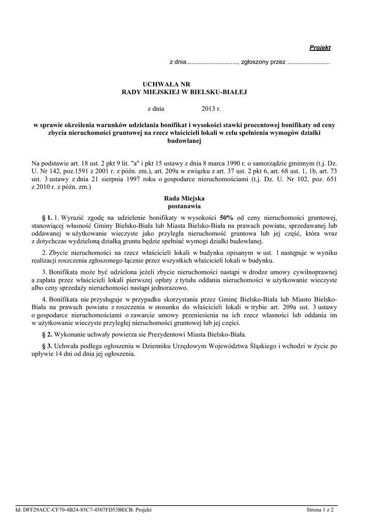 Projekt z dnia.............................., zgłoszony przez ......................... UCHWAŁA NR RADY MIEJSKIEJ W BIELSKU-BIAŁEJ z dnia 2013 r. w sprawie określenia warunków udzielania bonifikat i wysokości stawki procentowej bonifikaty od ceny zbycia nieruchomości gruntowej na rzecz właścicieli lokali w celu spełnienia wymogów działki budowlanej Na podstawie art. 18 ust. 2 pkt 9 lit. "a" i pkt 15 ustawy z dnia 8 marca 1990 r. o samorządzie gminnym (t.j. Dz. U. Nr 142, poz.1591 z 2001 r. z późn. zm.), art. 209a w związku z art. 37 ust. 2 pkt 6, art. 68 ust. 1, 1b, art. 73 ust. 3 ustawy z dnia 21 sierpnia 1997 roku o gospodarce nieruchomościami (t.j. Dz. U. Nr 102, poz. 651 z 2010 r. z późn. zm.) Rada Miejska postanawia § 1. 1. Wyrazić zgodę na udzielenie bonifikaty w wysokości 50% od ceny nieruchomości gruntowej, stanowiącej własność Gminy Bielsko-Biała lub Miasta Bielsko-Biała na prawach powiatu, sprzedawanej lub oddawanej w użytkowanie wieczyste jako przyległa nieruchomość gruntowa lub jej część, która wraz z dotychczas wydzieloną działką gruntu będzie spełniać wymogi działki budowlanej. 2. Zbycie nieruchomości na rzecz właścicieli lokali w budynku opisanym w ust. 1 następuje w wyniku realizacji roszczenia zgłoszonego łącznie przez wszystkich właścicieli lokali w budynku. 3. Bonifikata może być udzielona jeżeli zbycie nieruchomości nastąpi w drodze umowy cywilnoprawnej a zapłata przez właścicieli lokali pierwszej opłaty z tytułu oddania nieruchomości w użytkowanie wieczyste albo ceny sprzedaży nieruchomości nastąpi jednorazowo. 4. Bonifikata nie przysługuje w przypadku skorzystania przez Gminę Bielsko-Biała lub Miasto BielskoBiała na prawach powiatu z roszczenia w stosunku do właścicieli lokali w trybie art. 209a ust. 3 ustawy o gospodarce nieruchomościami o zawarcie umowy przeniesienia na ich rzecz własności lub oddania im w użytkowanie wieczyste przyległej nieruchomości gruntowej lub jej części. § 2. Wykonanie uchwały powierza sie Prezydentowi Miasta Bielsko-Biała. § 3. Uchwała podlega ogłoszeniu w Dzienniku Urzędowym Województwa Śląskiego i wchodzi w życie po upływie 14 dni od dnia jej ogłoszenia. Id: DFF29ACC-CF70-4B24-85C7-4507FD53BECB. Projekt Strona 1 z 2 Uzasadnienie Zgodnie z art. 209a ust. 1 ustawy z dnia 21 sierpnia 1997 r. o gospodarce nieruchomościami (tj. Dz. U. z 2010 r. Nr 102, poz. 651 z późn. zm.) jeżeli przy wyodrębnieniu własności lokali w budynku wydzielono dla tego budynku działkę gruntu, która nie spełnia wymogów działki budowlanej, właścicielom lokali przysługuje w stosunku do jednostki samorządu terytorialnego roszczenie o zawarcie umowy przeniesienia na ich rzecz własności lub oddania im w użytkowanie wieczyste przyległej nieruchomości gruntowej lub jej części, która wraz z dotychczas wydzielona działką gruntu będzie spełniać wymogi działki budowlanej, pod warunkiem, że roszczenie to zostało zgłoszone łącznie przez właścicieli wszystkich lokali. W przypadku większości budynków gdzie Wspólnoty Mieszkaniowe powstały przed zmianami ustrojowymi, działki przeznaczane do obsługi budynków mieszkalnych wydzielane były na potrzeby prowadzenia sprzedaży lokali mieszkalnych w budynku w oparciu o wytyczne Prezydium Wojewódzkiej Rady Narodowej Katowicach z dnia 26 maja 1973 r. nr GKM-II/103/4/73, które zobowiązywały Skarb Państwa do wydzielenia działki gruntu będącej przedmiotem sprzedaży w zakresie obejmującym wyłącznie budynek. Stąd Wspólnoty Mieszkaniowe dysponują działkami gruntu, które nie spełniają wymogów działek budowlanych, a właścicielom lokali przysługuje w stosunku do Skarbu Państwa lub jednostki samorządu terytorialnego roszczenie określone w cyt. powyżej przepisie. Bonifikaty wynikające z uchwały nr LIX/1375/2010 Rady Miejskiej w Bielsku-Białej z dnia 31 sierpnia 2010 r. w sprawie określenia warunków udzielania bonifikat i wysokości stawek procentowych przy sprzedaży najemcom lokali mieszkalnych stanowiących własność Gminy Bielsko-Biała lub Miasta Bielska-Białej na prawach powiatu (Dziennik Urzędowy Województwa Śląskiego z 2010 r., Nr 196, poz. 2987) nie mają zastosowania w przypadku sprzedaży lub oddawania w użytkowanie wieczyste udziałów w działkach na rzecz właścicieli lub użytkowników wieczystych nieruchomości sąsiednich. W zakresie tym były dotychczas podejmowane uchwały indywidualne. W rozstrzygnięciu nadzorczym z dnia 1 lutego 2013 r. Wojewoda Śląski stwierdził nieważność ostatniej podjętej w tej tematyce uchwały (uchwała nr XXV/642/2012 Rady Miejskiej w Bielsku-Białej z dnia 20 grudnia 2012 r. w sprawie udzielenia bonifikaty od pierwszej opłaty z tytułu użytkowani wieczystego dz. 168/6 obręb Biała Miasto objętej Kw. BB1B/00001305/2 położonej w Bielsku-Białej przy ul. Komorowickiej 16). W uzasadnieniu rozstrzygnięcia Wojewoda wskazał na niezgodność podjętej uchwały z art. 7 Konstytucji RP w związku z art. 70 ust. 3 ustawy o gospodarce nieruchomościami i wskazał, że w myśl przepisu art. 73 ust. 3 tej ustawy Rada Miejska jako organ stanowiący jest organem kompetentnym do podjęcia uchwały w zakresie warunków i udzielana bonifikat i wysokości stawek procentowych jako uchwały ogólnej stanowiącej akt prawa miejscowego. W związku z powyższym podjęcie uchwały jest uzasadnione. Id: DFF29ACC-CF70-4B24-85C7-4507FD53BECB. Projekt Strona 2 z 2