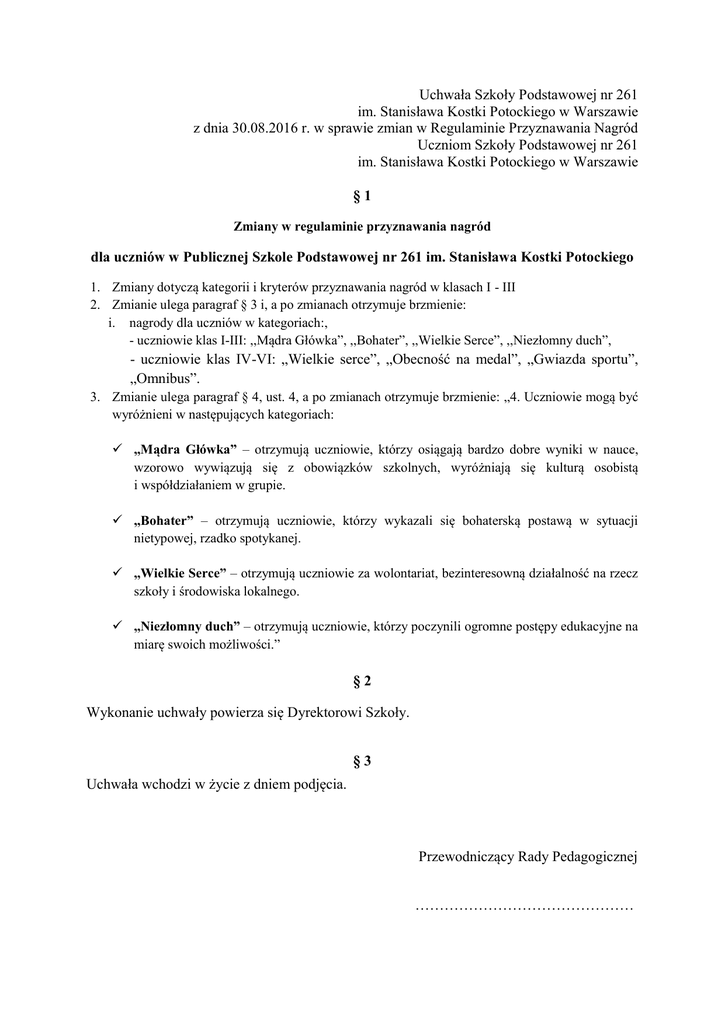 Uchwała Szkoły Podstawowej nr 261 im. Stanisława Kostki Potockiego w Warszawie z dnia 30.08.2016 r. w sprawie zmian w Regulaminie Przyznawania Nagród Uczniom Szkoły Podstawowej nr 261 im. Stanisława Kostki Potockiego w Warszawie §1 Zmiany w regulaminie przyznawania nagród dla uczniów w Publicznej Szkole Podstawowej nr 261 im. Stanisława Kostki Potockiego 1. Zmiany dotyczą kategorii i kryterów przyznawania nagród w klasach I - III 2. Zmianie ulega paragraf § 3 i, a po zmianach otrzymuje brzmienie: i. nagrody dla uczniów w kategoriach:, - uczniowie klas I-III: ,,Mądra Główka”, ,,Bohater”, ,,Wielkie Serce”, ,,Niezłomny duch”, - uczniowie klas IV-VI: „Wielkie serce”, „Obecność na medal”, „Gwiazda sportu”, „Omnibus”. 3. Zmianie ulega paragraf § 4, ust. 4, a po zmianach otrzymuje brzmienie: „4. Uczniowie mogą być wyróżnieni w następujących kategoriach: ,,Mądra Główka” – otrzymują uczniowie, którzy osiągają bardzo dobre wyniki w nauce, wzorowo wywiązują się z obowiązków szkolnych, wyróżniają się kulturą osobistą i współdziałaniem w grupie. ,,Bohater” – otrzymują uczniowie, którzy wykazali się bohaterską postawą w sytuacji nietypowej, rzadko spotykanej. ,,Wielkie Serce” – otrzymują uczniowie za wolontariat, bezinteresowną działalność na rzecz szkoły i środowiska lokalnego. ,,Niezłomny duch” – otrzymują uczniowie, którzy poczynili ogromne postępy edukacyjne na miarę swoich możliwości.” §2 Wykonanie uchwały powierza się Dyrektorowi Szkoły. §3 Uchwała wchodzi w życie z dniem podjęcia. Przewodniczący Rady Pedagogicznej ………………………………………