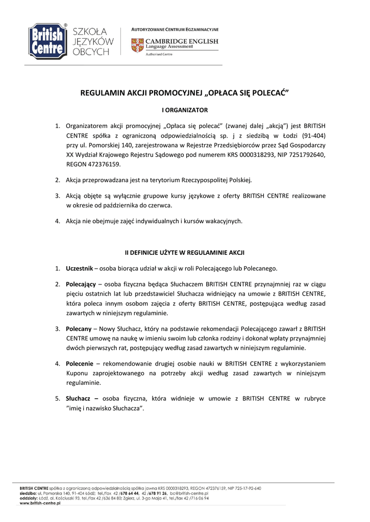 REGULAMIN AKCJI PROMOCYJNEJ „OPŁACA SIĘ POLECAĆ” I ORGANIZATOR 1. Organizatorem akcji promocyjnej „Opłaca się polecać” (zwanej dalej „akcją”) jest BRITISH CENTRE spółka z ograniczoną odpowiedzialnością sp. j z siedzibą w Łodzi (91-404) przy ul. Pomorskiej 140, zarejestrowana w Rejestrze Przedsiębiorców przez Sąd Gospodarczy XX Wydział Krajowego Rejestru Sądowego pod numerem KRS 0000318293, NIP 7251792640, REGON 472376159. 2. Akcja przeprowadzana jest na terytorium Rzeczypospolitej Polskiej. 3. Akcją objęte są wyłącznie grupowe kursy językowe z oferty BRITISH CENTRE realizowane w okresie od października do czerwca. 4. Akcja nie obejmuje zajęć indywidualnych i kursów wakacyjnych. II DEFINICJE UŻYTE W REGULAMINIE AKCJI 1. Uczestnik – osoba biorąca udział w akcji w roli Polecającego lub Polecanego. 2. Polecający – osoba fizyczna będąca Słuchaczem BRITISH CENTRE przynajmniej raz w ciągu pięciu ostatnich lat lub przedstawiciel Słuchacza widniejący na umowie z BRITISH CENTRE, która poleca innym osobom zajęcia z oferty BRITISH CENTRE, postępująca według zasad zawartych w niniejszym regulaminie. 3. Polecany – Nowy Słuchacz, który na podstawie rekomendacji Polecającego zawarł z BRITISH CENTRE umowę na naukę w imieniu swoim lub członka rodziny i dokonał wpłaty przynajmniej dwóch pierwszych rat, postępujący według zasad zawartych w niniejszym regulaminie. 4. Polecenie – rekomendowanie drugiej osobie nauki w BRITISH CENTRE z wykorzystaniem Kuponu zaprojektowanego na potrzeby akcji według zasad zawartych w niniejszym regulaminie. 5. Słuchacz – osoba fizyczna, która widnieje w umowie z BRITISH CENTRE w rubryce ”imię i nazwisko Słuchacza”. 6. Nowy Słuchacz – osoba, która: a. po raz pierwszy widnieje w umowie z BRITISH CENTRE w rubryce ”imię i nazwisko Słuchacza”. lub b. była Słuchaczem BRITSH CENTRE w przeszłości, ale od zakończenia nauki w BRITISH CENTRE upłynęło minimum pięć lat oraz dokonała wpłaty przynajmniej dwóch pierwszych rat. 7. Kupon – kupon zaprojektowany na potrzeby akcji, dostępny w oddziałach BRITISH CENTRE. Wygląd kuponu prezentuje Załącznik nr 1. III ZASADY UCZESTNICTWA 1. Udział w akcji jest dobrowolny, a przez uczestnictwo w akcji pomiędzy Organizatorem a Polecającym nie nawiązuje się żaden stosunek prawny o charakterze zarobkowym. Oznacza to, że roszczenia nagrodzonych w akcji mogą obejmować wyłącznie wydanie im nagród w formie przewidzianej przez Organizatora bez możliwości ich wymiany. 2. Uczestnikiem akcji może być osoba fizyczna, która ukończyła 18 lat lub opiekun prawny reprezentujący osobę małoletnią. 3. W akcji nie mogą brać udziału pracownicy Organizatora – wyjątek stanowią lektorzy. IV ZASADY NAGRADZANIA 1. Akcja polega na nagradzaniu osób Polecających ofertę BRITISH CENTRE, które skutecznie zarekomendują Organizatora Nowym Słuchaczom na poniższych zasadach: a. Polecany wpisuje na Kuponie w sposób czytelny swoje imię i nazwisko w rubryce „POLECANY” oraz imię i nazwisko Polecającego w rubryce „POLECAJĄCY”. b. Polecany dostarcza Kupon do siedziby Organizatora w imieniu Polecającego. c. Polecany może przekazać tylko jeden Kupon Organizatorowi. d. Polecany zawiera umowę na naukę w BRITISH CENTRE i realizuje min. 50% godzin zajęć zapisanych w umowie, przy czym liczba godzin nie może wynosić mniej niż 20% godzin przewidzianych dla całości danego kursu. 2 2. Przekazując dane osobowe Polecającego Organizatorowi, Polecany oświadcza i potwierdza, że osoba ta wyraziła zgodę na przekazanie jej danych osobowych i ponosi wszelką odpowiedzialność za skutki nieprawdziwości takiego oświadczenia. 3. Organizator nie ponosi odpowiedzialności za zgubienie lub zniszczenie Kuponu przed dostarczeniem go do siedziby Organizatora. 4. Polecający może być wskazywany przez Poleconych dowolną liczbę razy. 5. W przypadku naruszenia przez Polecającego lub Poleconego niniejszego regulaminu, Organizator zastrzega sobie możliwość nieprzyznania nagrody. V NAGRODY 1. Za Polecenie spełniające warunki określone w niniejszym regulaminie, Polecającemu przysługuje nagroda w wysokości: a. 50 zł, jeśli Polecany zapisał się na kurs do 80 godzin włącznie, b. 100 zł, jeśli Polecany zapisał się na kurs powyżej 80 godzin. 2. Za osiem skutecznych poleceń Polecającemu przysługuje kurs za 1 zł nazwany na potrzeby akcji kursem gratisowym, na poziomie ustalonym w procedurze diagnostycznej prowadzonej przez BRITISH CENTRE. 3. W przypadku, gdy odbiór nagrody, o której mowa w pkt. 2 będzie niemożliwy z przyczyn braku wymaganego minimum ilości uczestników kursu w grupie, Organizator wypłaci Polecającemu równowartość ośmiu poleceń wg wysokości zawartej w pkt. 1. W przypadku rozwiązania grupy w trakcie semestru, Organizator wypłaci Polecającemu równowartość ośmiu poleceń pomniejszoną o kwotę stanowiącą ekwiwalent wartości zajęć, które się odbyły. 4. Na pisemną prośbę Polecającego Organizator może wymienić nagrodę, o której mowa w pkt. 2 na równowartość pieniężną ośmiu poleceń. 5. Nagroda, do której nabył praw Polecający, jest wręczana Polecającemu osobiście w siedzibie Organizatora, zgodnie z harmonogramem akcji zawartym w punkcie VI niniejszego regulaminu. 6. Nagroda nie może zostać automatycznie zaliczona na poczet należności Polecającego wobec innych podmiotów, w tym także na poczet należności wobec BRITISH CENTRE. 3 VI HARMONOGRAM AKCJI 1. Akcja jest realizowana w II etapach: a. I etap akcji trwa od 1 września do 31 grudnia; b. II etap akcji trwa od 1 stycznia do 30 kwietnia. 2. Rozliczenie I etapu akcji odbywa się do 31 stycznia. 3. Rozliczenie II etapu akcji trwa do 30 maja. 4. Za datę przystąpienia Uczestników do akcji przyjmuje się moment złożenia Kuponu przez Poleconego w siedzibie Organizatora. 5. O terminie odbioru nagrody Polecając