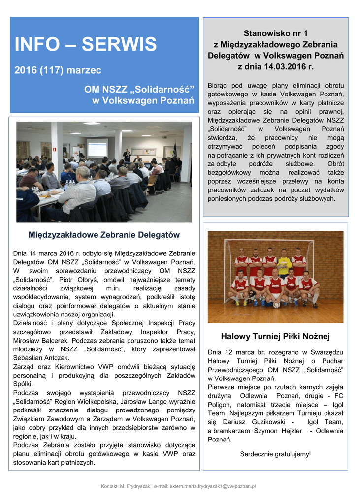 INFO – SERWIS 2016 (117) marzec OM NSZZ „Solidarność” w Volkswagen Poznań Stanowisko nr 1 z Międzyzakładowego Zebrania Delegatów w Volkswagen Poznań z dnia 14.03.2016 r. Biorąc pod uwagę plany eliminacji obrotu gotówkowego w kasie Volkswagen Poznań, wyposażenia pracowników w karty płatnicze oraz opierając się na opinii prawnej, Międzyzakładowe Zebranie Delegatów NSZZ „Solidarność” w Volkswagen Poznań stwierdza, że pracownicy nie mogą otrzymywać poleceń podpisania zgody na potrącanie z ich prywatnych kont rozliczeń za odbyte podróże służbowe. Obrót bezgotówkowy można realizować także poprzez wcześniejsze przelewy na konta pracowników zaliczek na poczet wydatków poniesionych podczas podróży służbowych. Międzyzakładowe Zebranie Delegatów Dnia 14 marca 2016 r. odbyło się Międzyzakładowe Zebranie Delegatów OM NSZZ „Solidarność” w Volkswagen Poznań. W swoim sprawozdaniu przewodniczący OM NSZZ „Solidarność”, Piotr Olbryś, omówił najważniejsze tematy działalności związkowej m.in. realizację zasady współdecydowania, system wynagrodzeń, podkreślił istotę dialogu oraz poinformował delegatów o aktualnym stanie uzwiązkowienia naszej organizacji. Działalność i plany dotyczące Społecznej Inspekcji Pracy szczegółowo przedstawił Zakładowy Inspektor Pracy, Mirosław Balcerek. Podczas zebrania poruszono także temat młodzieży w NSZZ „Solidarność”, który zaprezentował Sebastian Antczak. Zarząd oraz Kierownictwo VWP omówili bieżącą sytuację personalną i produkcyjną dla poszczególnych Zakładów Spółki. Podczas swojego wystąpienia przewodniczący NSZZ „Solidarność” Region Wielkopolska, Jarosław Lange wyraźnie podkreślił znaczenie dialogu prowadzonego pomiędzy Związkiem Zawodowym a Zarządem w Volkswagen Poznań, jako dobry przykład dla innych przedsiębiorstw zarówno w regionie, jak i w kraju. Podczas Zebrania zostało przyjęte stanowisko dotyczące planu eliminacji obrotu gotówkowego w kasie VWP oraz stosowania kart płatniczych. Halowy Turniej Piłki Nożnej Dnia 12 marca br. rozegrano w Swarzędzu Halowy Turniej Piłki Nożnej o Puchar Przewodniczącego OM NSZZ „Solidarność” w Volkswagen Poznań. Pierwsze miejsce po rzutach karnych zajęła drużyna Odlewnia Poznań, drugie - FC Poligon, natomiast trzecie miejsce – Igol Team. Najlepszym piłkarzem Turnieju okazał się Dariusz Guzikowski Igol Team, a bramkarzem Szymon Hajzler - Odlewnia Poznań. Serdecznie gratulujemy! Kontakt: M. Frydryszak, e-mail: [email protected]