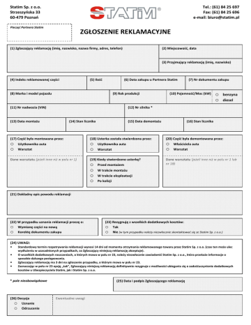 Statim Sp. z o.o. Strzeszyńska 33 60-479 Poznań Tel.: (61) 84 25 697 Fax: (61) 84 25 696 e-mail: [email protected] Pieczęć Partnera Statim ZGŁOSZENIE REKLAMACYJNE (1) Zgłaszający reklamację (imię, nazwisko, nazwa firmy, adres, telefon) (2) Miejscowość, data (3) Przyjmujący reklamację (imię, nazwisko) (4) Indeks reklamowanej części (5) Ilość (6) Data zakupu u Partnera Statim (8) Marka i model pojazdu (9) Rok produkcji (11) Nr nadwozia (VIN) (10) Pojemność/Moc (kW) o o benzyna diesel (12) Nr silnika * (13) Data montażu (14) Stan licznika (17) Część była montowana przez: o o (7) Nr dokumentu zakupu Użytkownika auta (18) Usterka została stwierdzona przez: o o Warsztat Dane warsztatu (jeżeli inne niż w polu nr 1) (15) Data demontażu Użytkownika auta Warsztat (19) Kiedy stwierdzono usterkę? o o o o Przed montażem (16) Stan licznika (20) Część była demontowana przez: o o Właściciela auta Warsztat Dane warsztatu (jeżeli inne niż w polu nr 1 lub nr 18) W trakcie montażu W trakcie eksploatacji Po kolizji (21) Dokładny opis powodu reklamacji (22) W przypadku uznania reklamacji proszę o: o Wymianę części na nową o Korektę dokumentu zakupu (23) Rezygnuję z wszelkich dodatkowych kosztów: o Tak o Nie (w tym przypadku należy niezwłocznie skontaktować się ze Statim Sp. z o.o.) (24) UWAGI: • • • • Standardowy termin rozpatrywania reklamacji wynosi 14 dni od momentu otrzymania reklamowanego towaru przez Statim Sp. z o.o. (czas ten może ulec wydłużeniu w uzasadnionych przypadkach, co Zgłaszający niniejszą reklamację akceptuje). O wszelkich dodatkowych roszczeniach, o których mowa w polu nr 23, należy niezwłocznie zawiadomić Statim Sp. z o.o., która przekaże informacje o sposobie dalszego postępowania. Zgłaszający reklamację ma 3 dni na zgłoszenie przypadku, o którym mowa w polu nr 23. Zaznaczając w polu nr 23 opcję „tak”, Zgłaszający niniejszą reklamację definitywnie rezygnuje z możliwości ubiegania się o zadośćuczynienie dodatkowych kosztów u Ubezpieczyciela Statim, jak i Statim Sp. z o.o. * pole nieobowiązkowe (26) Decyzja o Uznanie o Odrzucenie (25) Data i podpis Zgłaszającego reklamację Ewentualne uwagi