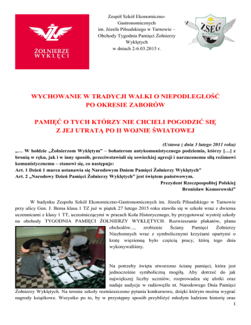 Zespół Szkół EkonomicznoGastronomicznych im. Józefa Piłsudskiego w Tarnowie – Obchody Tygodnia Pamięci Żołnierzy Wyklętych w dniach 2-6.03.2015 r. WYCHOWANIE W TRADYCJI WALKI O NIEPODLEGŁOŚĆ PO OKRESIE ZABORÓW PAMIĘĆ O TYCH KTÓRZY NIE CHCIELI POGODZIĆ SIĘ Z JEJ UTRATĄ PO II WOJNIE ŚWIATOWEJ (Ustawa z dnia 3 lutego 2011 roku) „… W hołdzie „Żołnierzom Wyklętym” – bohaterom antykomunistycznego podziemia, którzy […] z bronią w ręku, jak i w inny sposób, przeciwstawiali się sowieckiej agresji i narzuconemu siłą reżimowi komunistycznemu – stanowi się, co następuje: Art. 1 Dzień 1 marca ustanawia się Narodowym Dniem Pamięci Żołnierzy Wyklętych” Art. 2 „Narodowy Dzień Pamięci Żołnierzy Wyklętych” jest świętem państwowym. Prezydent Rzeczpospolitej Polskiej Bronisław Komorowski” W budynku Zespołu Szkół Ekonomiczno-Gastronomicznych im. Józefa Piłsudskiego w Tarnowie przy ulicy Gen. J. Bema klasa 1 TZ już w piątek 27 lutego 2015 roku stawiła się w szkole wraz z dwiema uczennicami z klasy 1 TT, uczestniczącymi w pracach Koła Historycznego, by przygotować wystrój szkoły na obchody TYGODNIA PAMIĘCI ŻOŁNIERZY WYKLĘTYCH. Rozwieszanie plakatów, planu obchodów..., zrobienie Ściany Pamięci Żołnierzy Niezłomnych wraz z symbolicznymi krzyżami opartymi o kratę więzienną było częścią pracy, którą tego dnia wykonywaliśmy. Na potrzeby święta stworzono ścianę pamięci, która jest jednocześnie symboliczną mogiłą. Aby dotrzeć do jak największej liczby uczniów, rozprowadza się ulotki oraz nadaje audycje w radiowęźle nt. Narodowego Dnia Pamięci Żołnierzy Wyklętych. Na terenie szkoły rozmieszczono pytania konkursowe, dzięki którym można wygrać nagrody książkowe. Wszystko po to, by w przystępny sposób przybliżyć młodym ludziom historię oraz 1 sylwetki wybranych osób podziemia niepodległościowego. Za program obchodów odpowiadała klasa pierwsza TZ, która podchwyciła pomysł wychowawcy Józefa Parysa i aktywnie zaangażowała się w kultywowanie pamięci o żołnierzach. Szkoła bierze w nich udział nie bez powodu – placówka kształtuje młodzież w duchu wychowania niepodległościowego marszałka Piłsudskiego, który jest jej patronem. Plan obchodów Tygodnia Pamięci Wyklętych CAŁY TYDZIEŃ - inscenizacja w poszczególnych klasach przedstawiająca aresztowanie niepodległościowego (28 klas – około 800 uczniów oraz około 32 nauczycieli); żołnierza podziemia Młodzież z 28 klas z miało możliwość zobaczyć inscenizację aresztowania żołnierza Armii Krajowej przedstawioną przez uczennice z klasy 1 TZ. Na koniec po odegranej scence w kilku zdaniach wyjaśnienia, dlaczego młodzież w mundurach znalazła się w tej sali lekcyjnej z takim przesłaniem w chwili ciszy wszyscy oddali hołd polskim patriotom, którzy nie złożyli broni stawiając opór sowieckiej okupacji po 1944 roku. Link do filmów z inscenizacji: http://youtu.be/kKc6Mkgowdk http://youtu.be/qylu1zqFmBM - ściana pamięci (umieszczona w głównym holu) kilkudziesięciu żołnierzy niezłomnych oraz symboliczna mogiła (przewrócone krzyże oparte o kratę więzienną); - ulotki rozprowadzane przez uczennice z klasy 1 TZ dotyczące Narodowego Dnia Pamięci „Żołnierzy Wyklętych”; - audycje w radiowęźle dotyczące Narodowego Dnia Pamięci „Żołnierzy Wyklętych” oraz wybranych osób podziemia niepodległościowego; - pieśni patriotyczne w radiowęźle we wtorek, środę, czwartek, piątek; - krzyżówka z nagrodami – 20 pytań rozmieszczonych na terenie szkoły. Krzyżówka do pobrania na stronie szkoły (5 pierwszych osób, które dostarczą rozwiązaną krzyżówkę wraz z uzupełnionym hasłem do nauczyciela historii Józefa Parysa zostaną nagrodzone). Regulamin Konkursu na rozwiązanie krzyżówki o Żołnierzach Wyklętych § 1. Krzyżówka skierowana jest do wszystkich uczniów Zespołu Szkół Ekonomiczno-Gastronomicznych im. Józefa Piłsudskiego w Tarnowie. § 2. Czas zakończenia konkursu: 6. 03. 2015 roku do godziny 14:40. § 3. Wydrukowaną krzyżówkę z poprawnie zapisanymi odpowiedziami oraz hasłem należy zanieść do nauczyciela historii Józefa Parysa. § 4. Kartka powinna być podpisana z zapisaną datą oddania krzyżówki. § 5. Na terenie naszej szkoły w dniach 2-6. 03. 2015 roku znajdziesz przyklejone lub przypięte kartki z 20 pytaniami do krzyżówki. § 6. Kartki z pytaniami są ponumerowane tak jak w krzyżówce w zapisie: poziomo, pionowo. § 7. Odpowiedzi znajdziesz na Ścianie Pamięci oraz w innych dostępnych dla Ciebie miejscach. 2 § 8. Nagroda dla pierwszych pięciu osób spełniających powyższe kryteria. W piątek 6 marca zostało złożonych 6 prac, z czego zakwalifikowano i oceniono 4. Wszystkie 4 prace były pracami uczniów z klasy 2 TE (I miejsce - Skruch Przemysław, II miejsce - Stoszko Justyna, III miejsce - Gryglewska Dominika, IV miejsce - Kosman Magdalena). ŚRODA 4 marzec, godz. 935, sala 115 – projekcja filmu pt.: Inka 1946 (84 minuty) Wprowadzenie do filmu opiekun KH. Historia opowiada o mordzie sądowym dokonanym na niespełna 18letniej Danucie Siedzikównie, sanitariuszce i łączniczce w V Brygadzie Wileńskiej AK, mjr Zygmunta Szendzielorza "Łupaszki". Jednym z zarzutów jakie jej postawiono było mordowanie rannych jeńców z UB ludzi, którym w rzeczywistości ratowała życie. (4 EH – 32 uczniów, 1 GH – 32 uczniów, 3 TD – 28 uczniów, 3 TE – 30 = RAZEM 122 osoby plus kilka chętnych i nauczyciele – około 135 osób) CZWARTEK 5 marzec, godz. 935, sala 115 – zajęcia w ramach Koła Historycznego (dla wszystkich chętnych) nt.: Żołnierze Wolnej Polski. Skazani na zapomnienie. Zajęcia poprowadzi opiekun KH. (12 osób – klasa 1TZ) PIĄTEK 6 marzec, godz. 1115 – wyjście na cmentarz komunalny w Krzyżu Apel Pamięci przy grobie Żołnierzy Wyklętych: Mieczysław Cielocha ps. Sprytny, Stanisław Kie