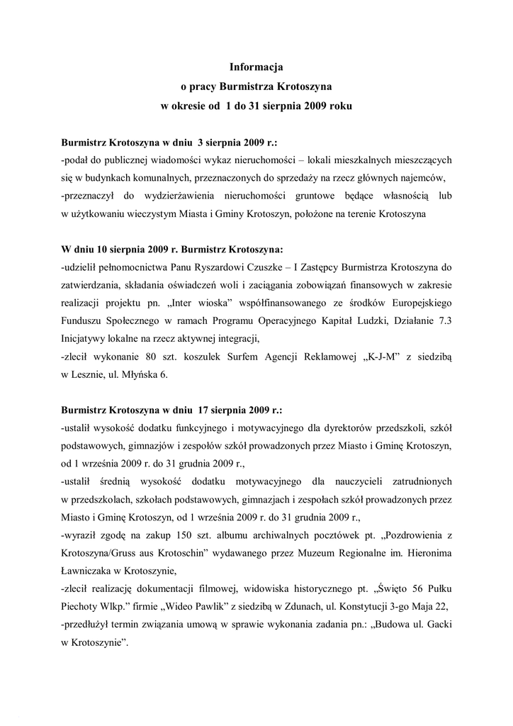 Informacja o pracy Burmistrza Krotoszyna w okresie od 1 do 31
